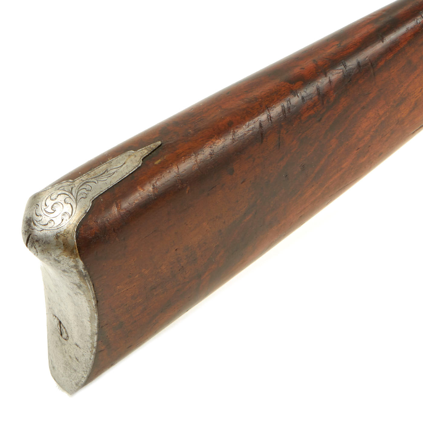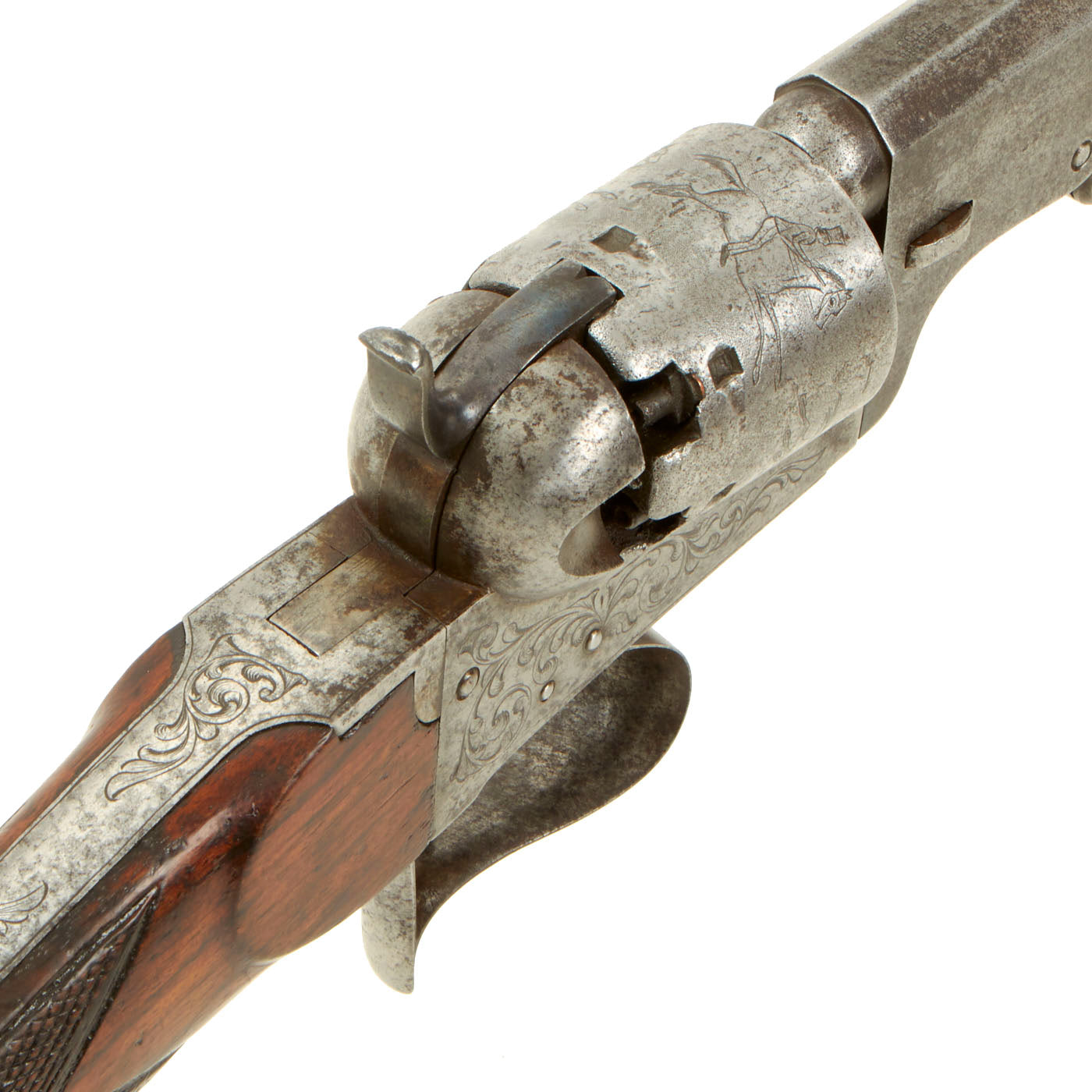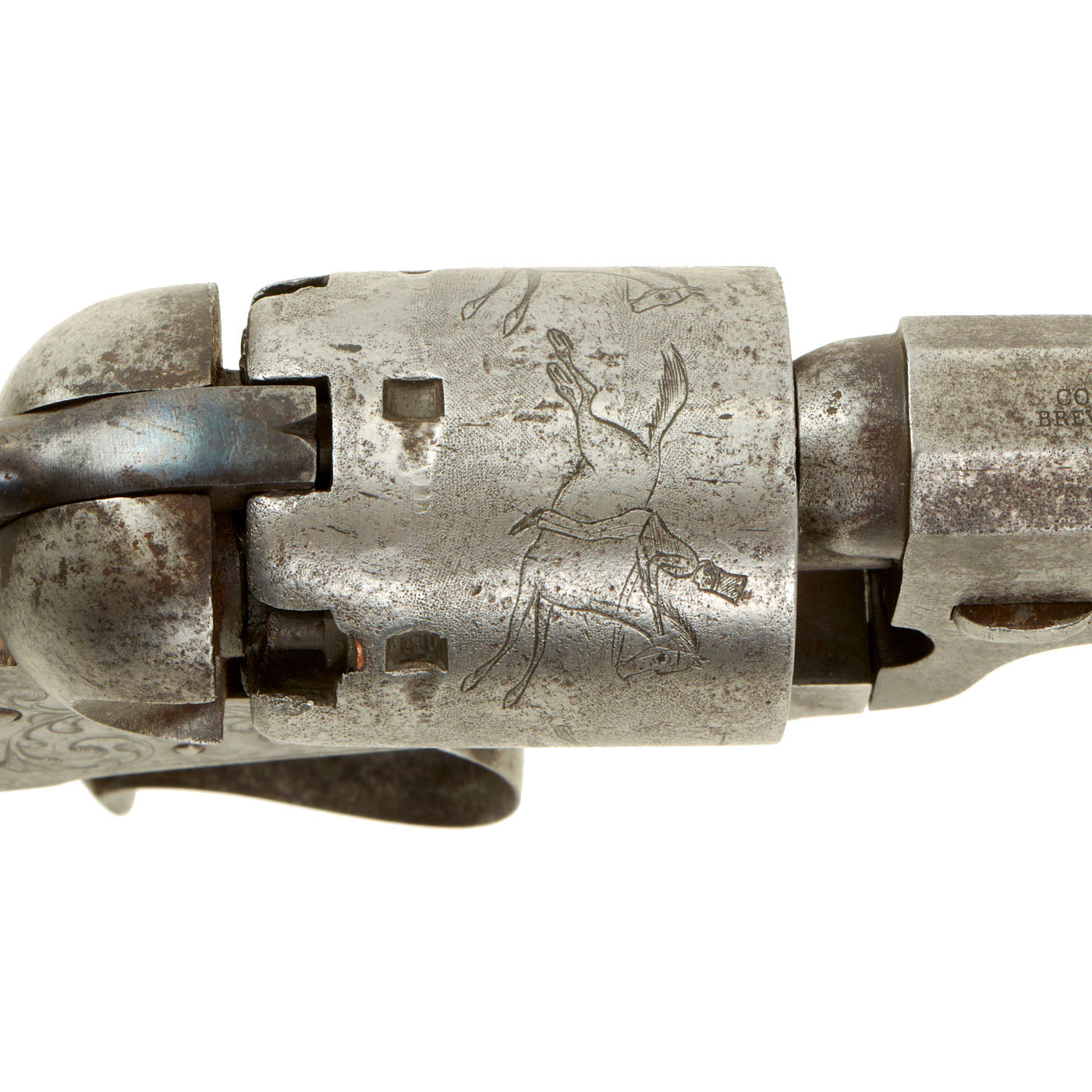 We have here one of these revolving rifles, often called "revolving pistol carbines", in the same .36 caliber as the Model 1851 Navy. It is correctly marked COLT BREVETE on the top of the barrel, and on the lower support for the butt stock. It is also marked with serial number 446 under the barrel, and there are no other markings that we are able to see. The frame and trigger guard bear some lovely foliate engraving, typical of Belgian produced arms from the mid 19th century. The cylinder looks to have been engraved post manufacture with a battle scene, with two soldiers on horseback with guns chasing two other men on horses, with some flying arrows in the air. The soldiers look to be European in dress, but could also be U.S. Soldiers chasing Native Americans. Definitely worth some further research.