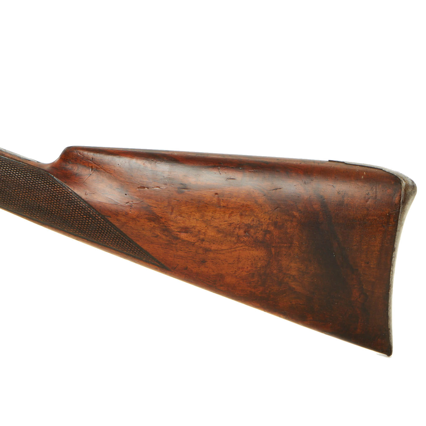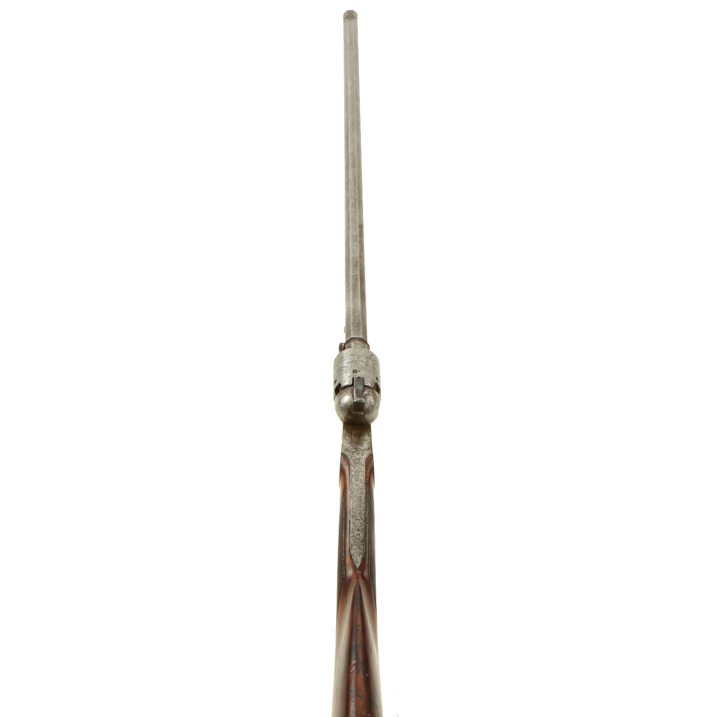 The revolving carbine has a great waged look to it, with the engraving well preserved. The metalwork has a gray patina over most areas, with some powder burn near the cylinder. The butt stock is lovely, made from what looks to be figured walnut, and has a lovely checkered grip area. The gun cycles well, with good indexing and a solid cylinder lock up. We did not notice any of the usual finicky behavior from this example. The bore is clear, though it has quite worn, and looks nearly smooth at this point, showing almost no oxidation. It is possible that it was manufactured as a smooth bore.