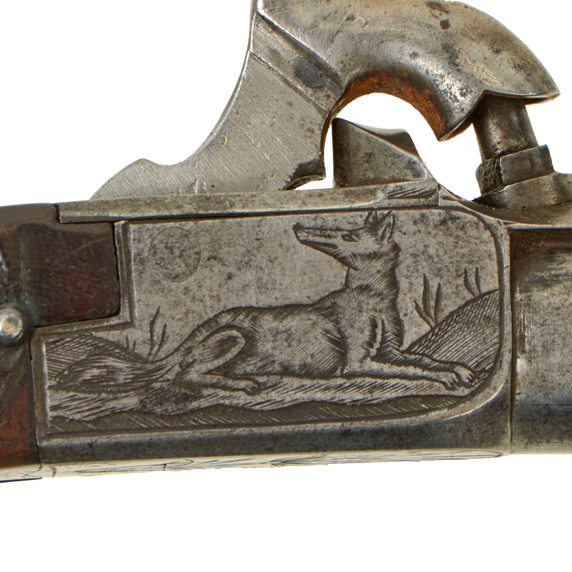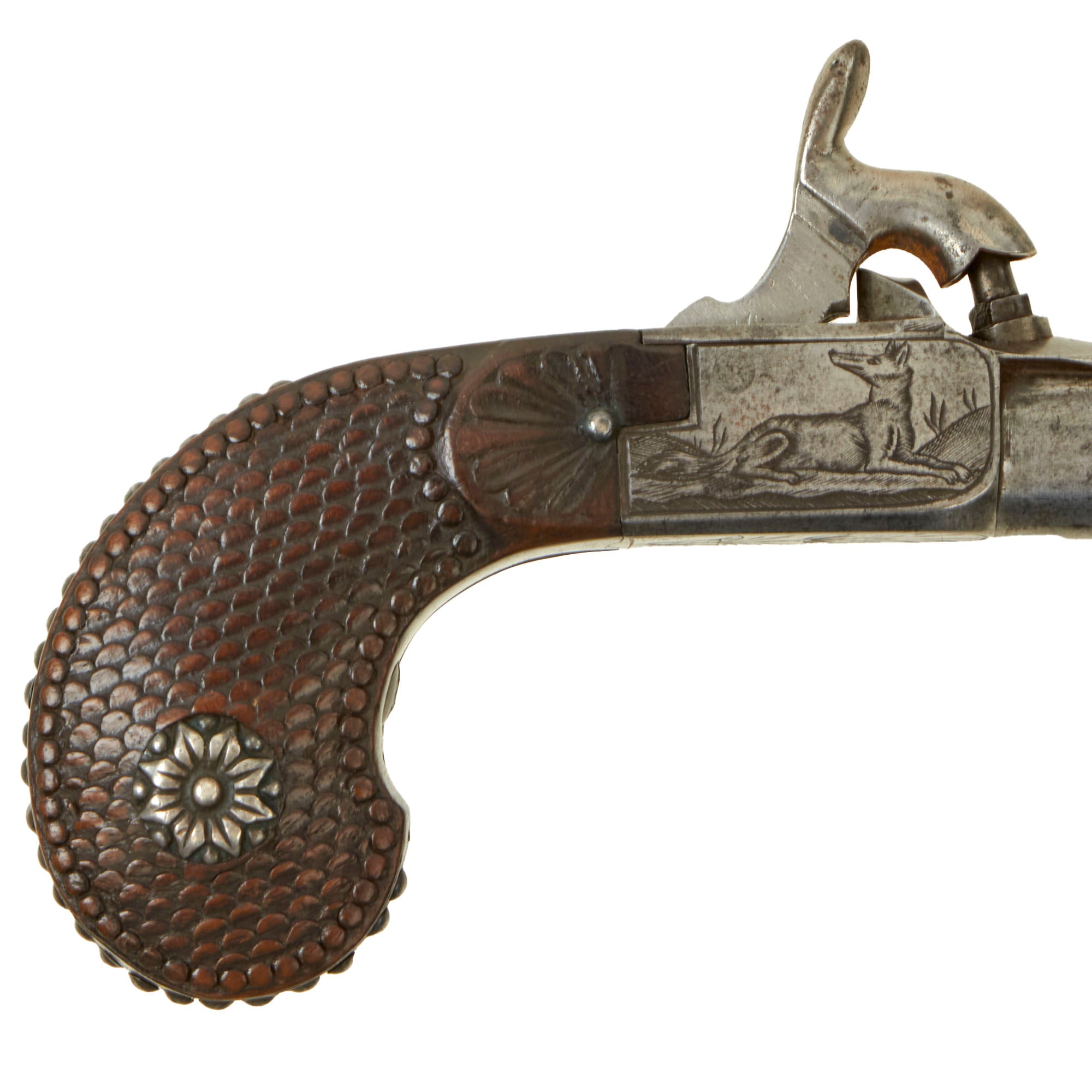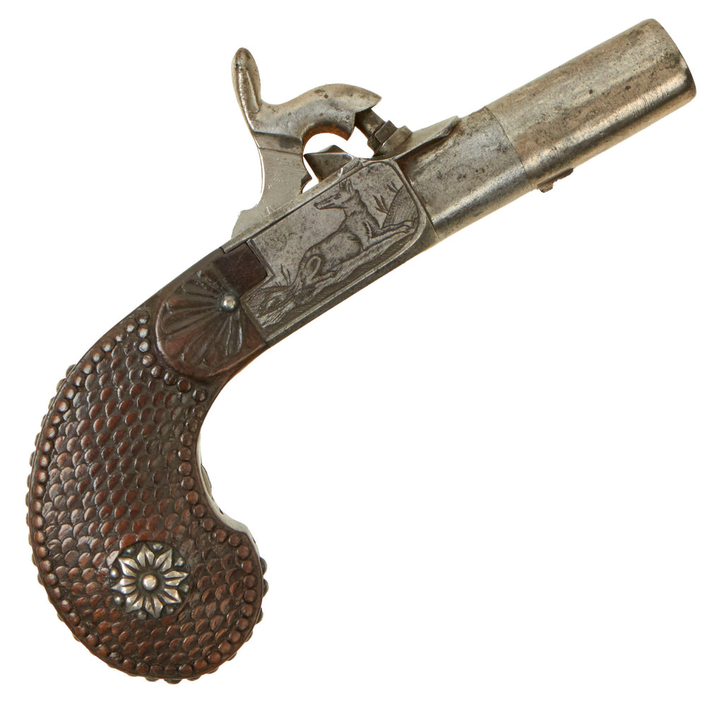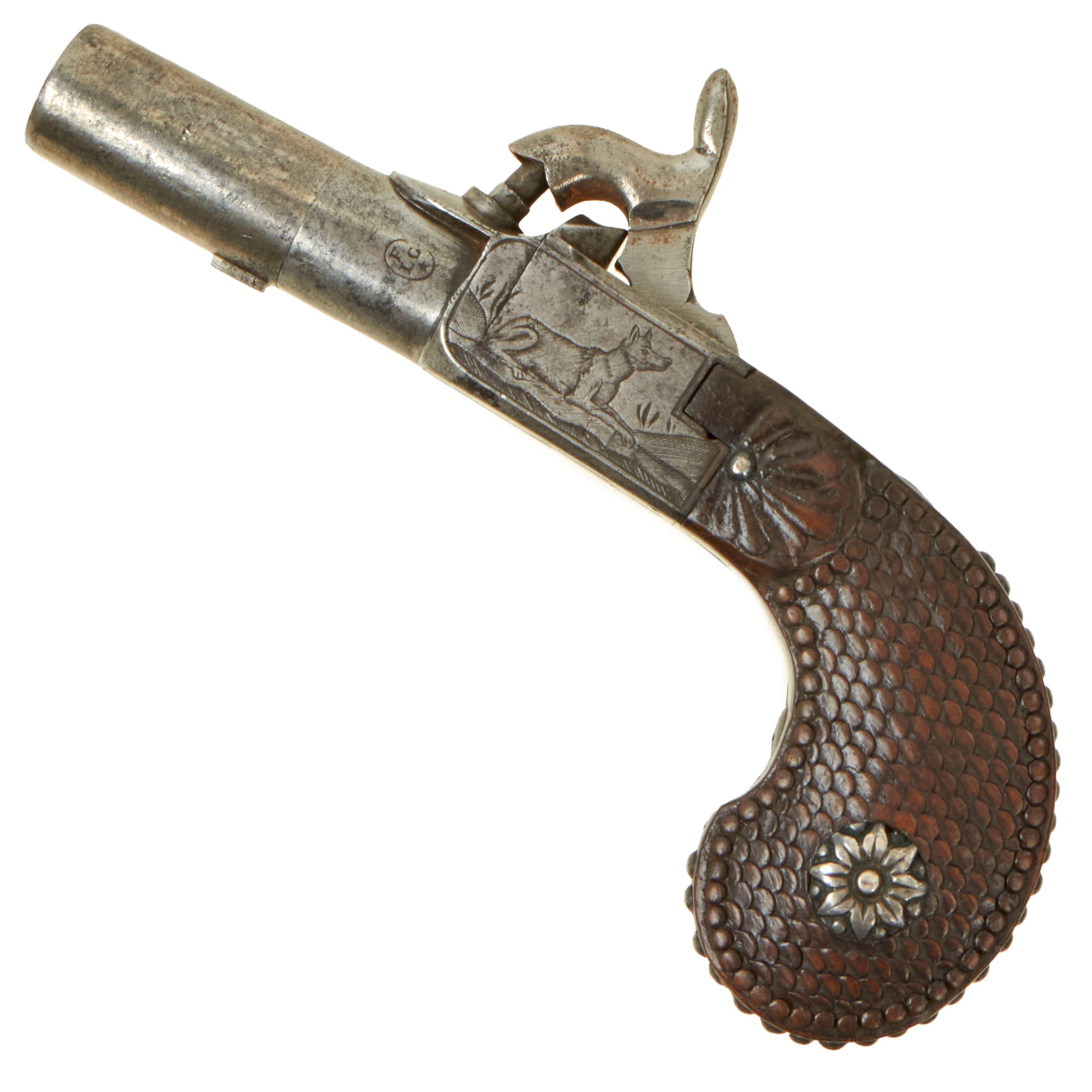 Original Item. Only One Available. This is a lovely iron framed "boxlock" style percussion pocket pistol dating to approximately 1840, which is really a fantastic "upmarket" example! It features a turn off barrel and hidden trigger, and is highly decorative! The frame is engraved on the bottom with foliate designs, while the sides show what look to be hunting dogs or maybe wolves.