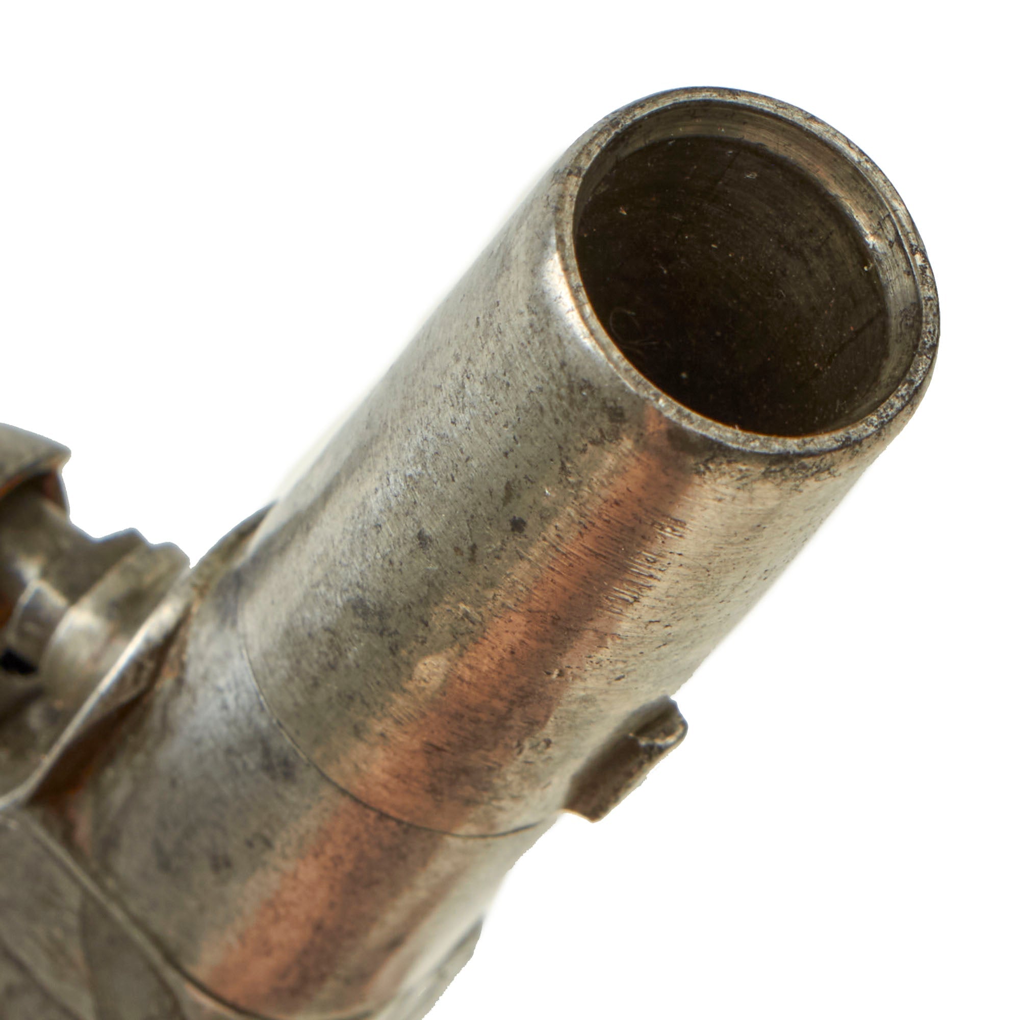 The weapon measures 5 1/2" in overall length with a screw off 1 1/4" smooth bored .50"cal iron cannon barrel, which in very good condition, showing signs of light to moderate use. Unlike most that we have seen, the screw joint is actually still free, and the barrel can easily be removed! There are no maker markings on the pistol except for E / L G / * in an oval on the left hand side, indicating manufacture and inspection in Liège, Belgium.