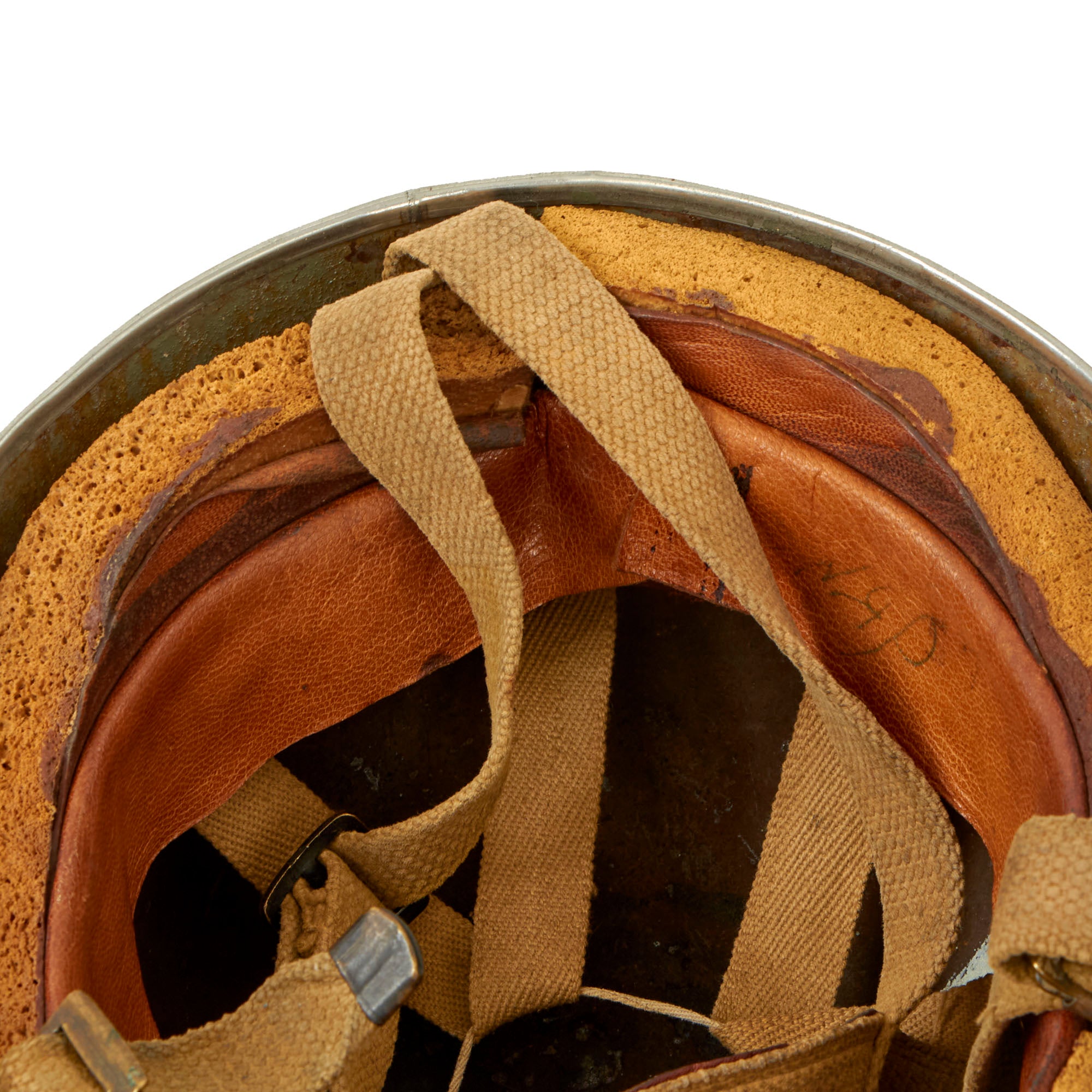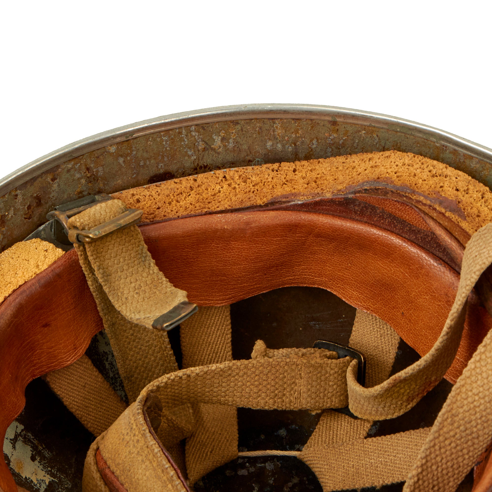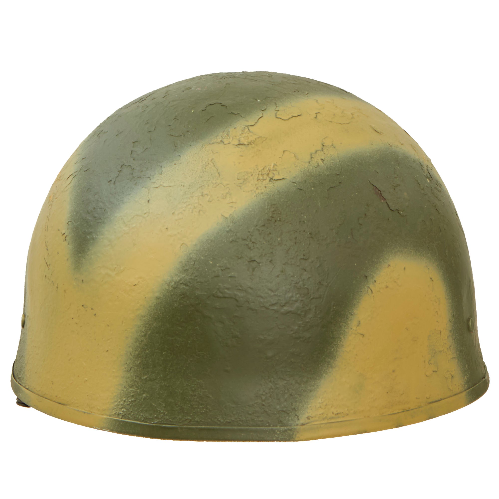 The helmet is in lovely condition and shows signs of a long service use as these were used for over 20 years. It appears to be complete and without any extensive damage. The leather is still supple but the padding has become somewhat hard and degraded a little. The camouflage paint was most certainly done recently as the paint still retains the distinct scent of canned spray paint.