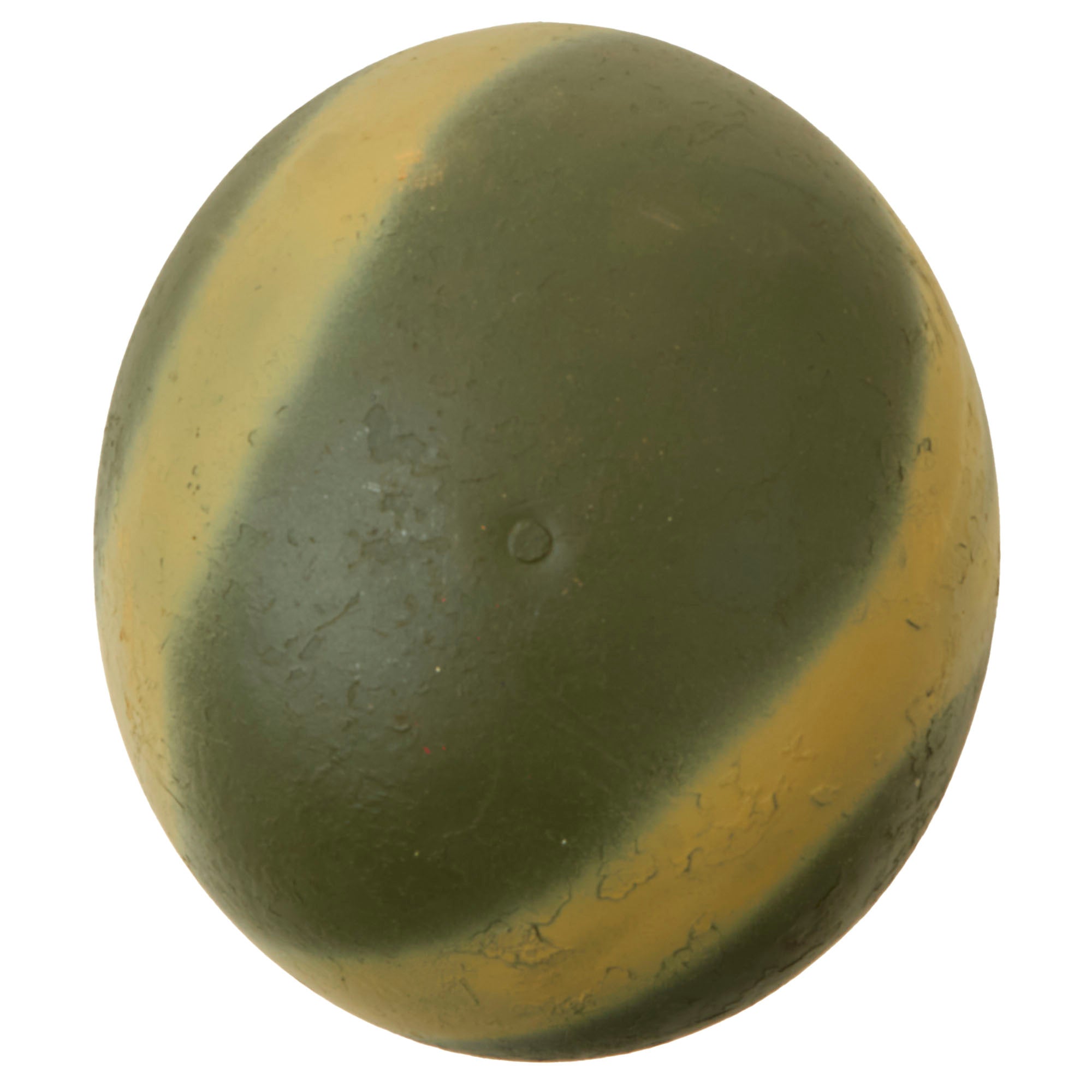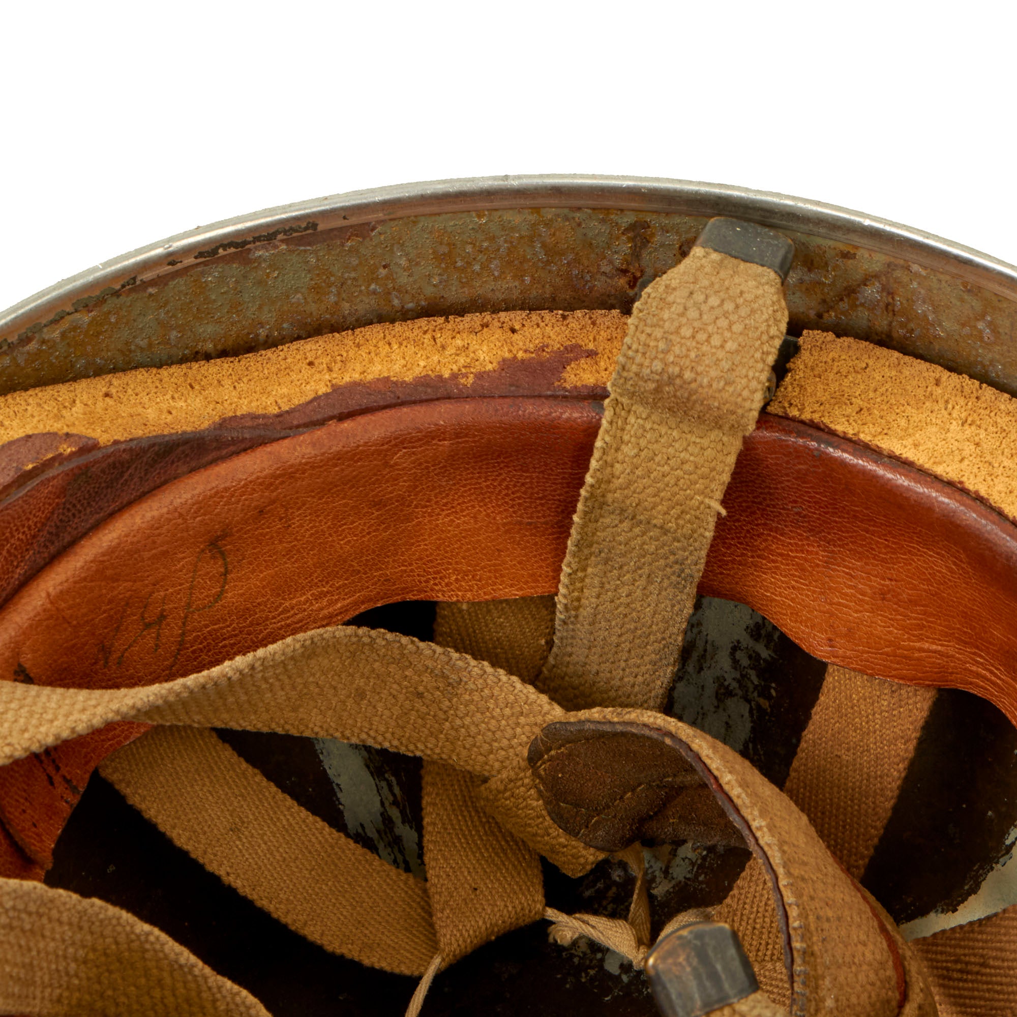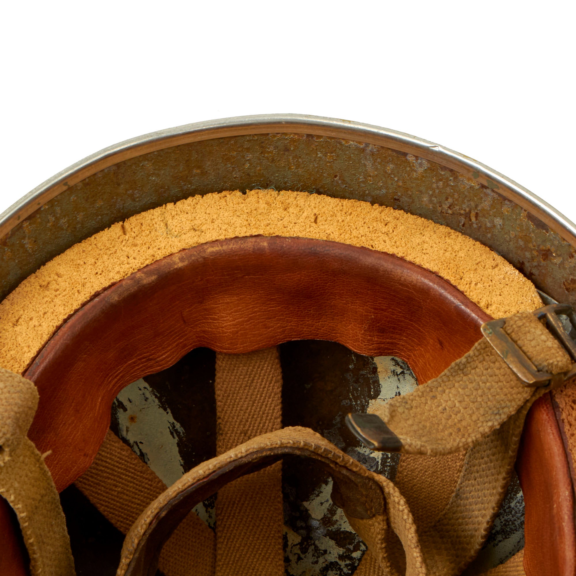 The helmet is in lovely condition and shows signs of a long service use as these were used for over 20 years. It appears to be complete and without any extensive damage. The leather is still supple but the padding has become somewhat hard and degraded a little. The camouflage paint was most certainly done recently as the paint still retains the distinct scent of canned spray paint.