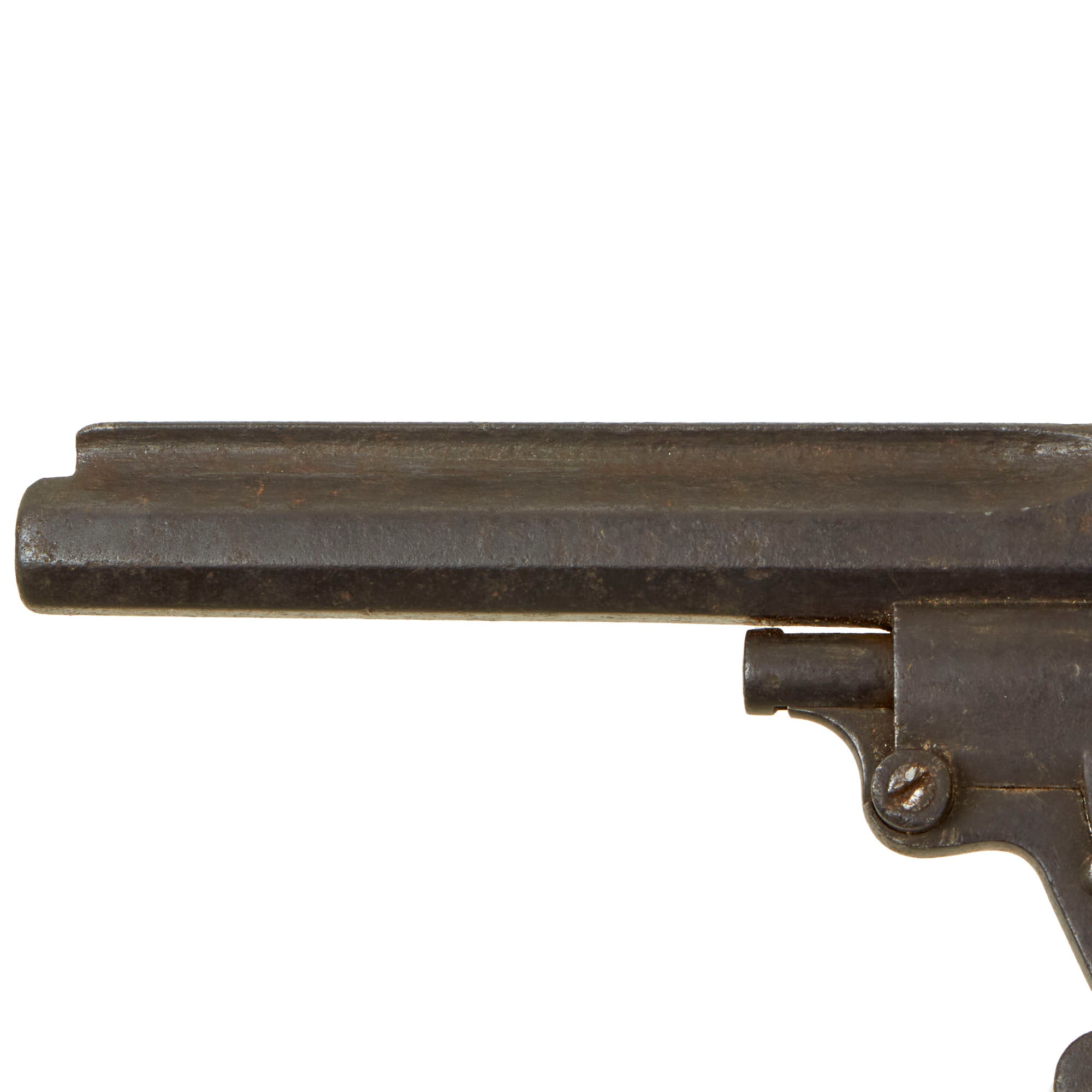There are no markings whatsoever that we can see on the revolver, though given the condition it is possible that any present were worn away. The style is very similar to that of Charles-François Galand (1832 - 1900), who worked in Liège and Paris, producing some revolutionary revolver designs. These were known for often utilizing the trigger guard as a lever to open the action, and the style of the grip and hammer are very reminiscent of his style.