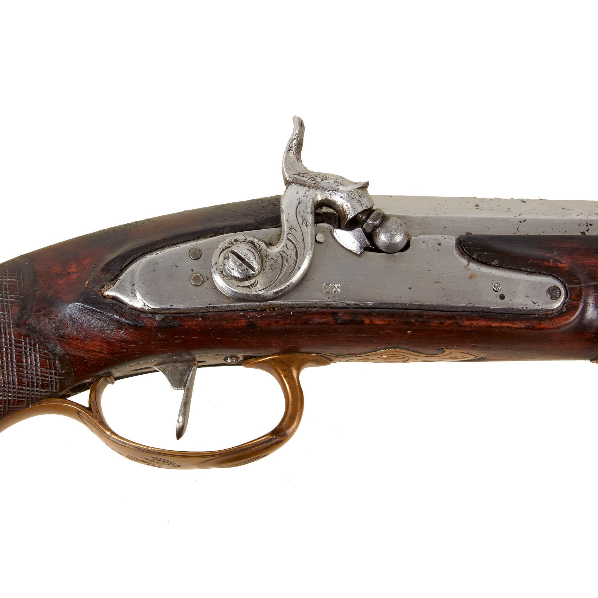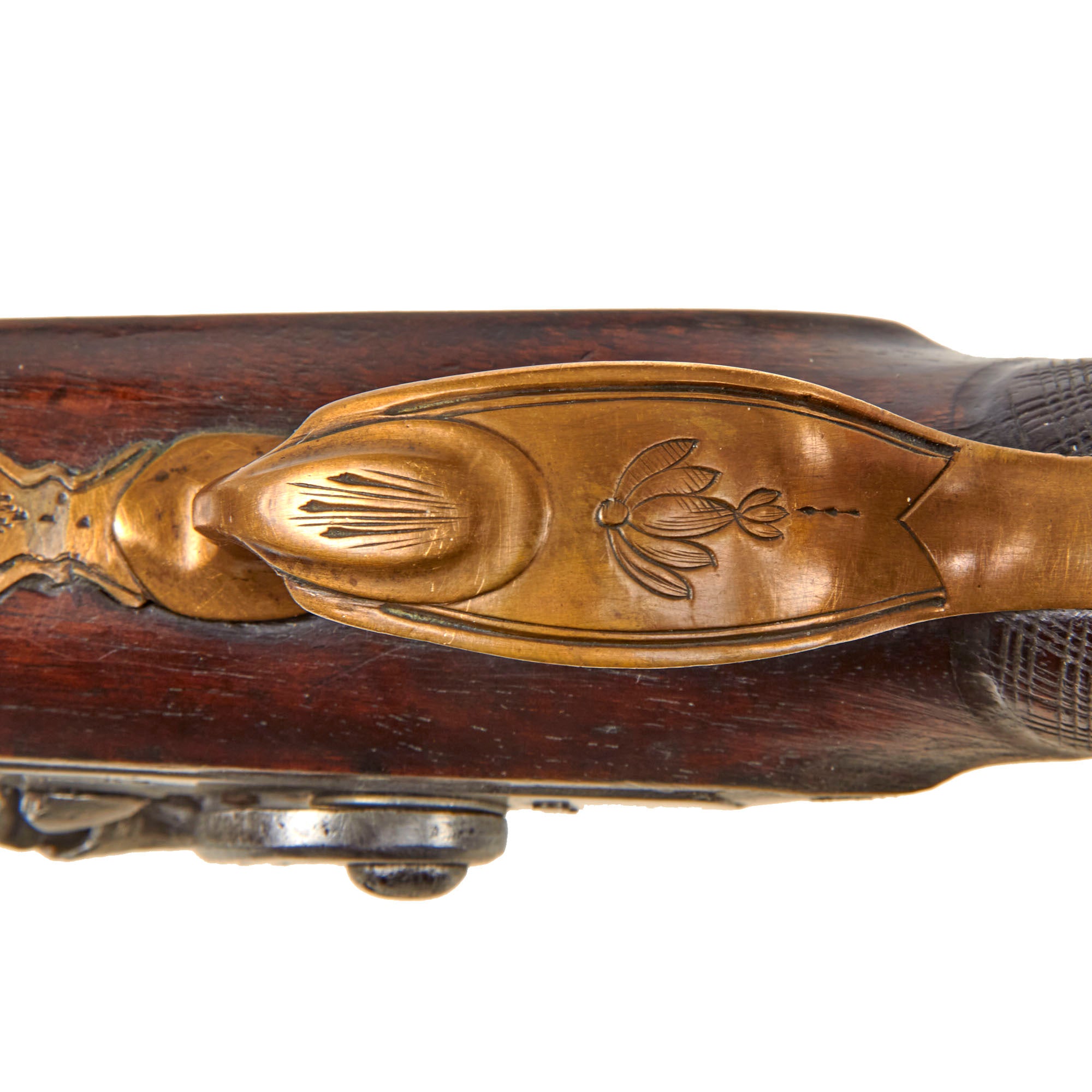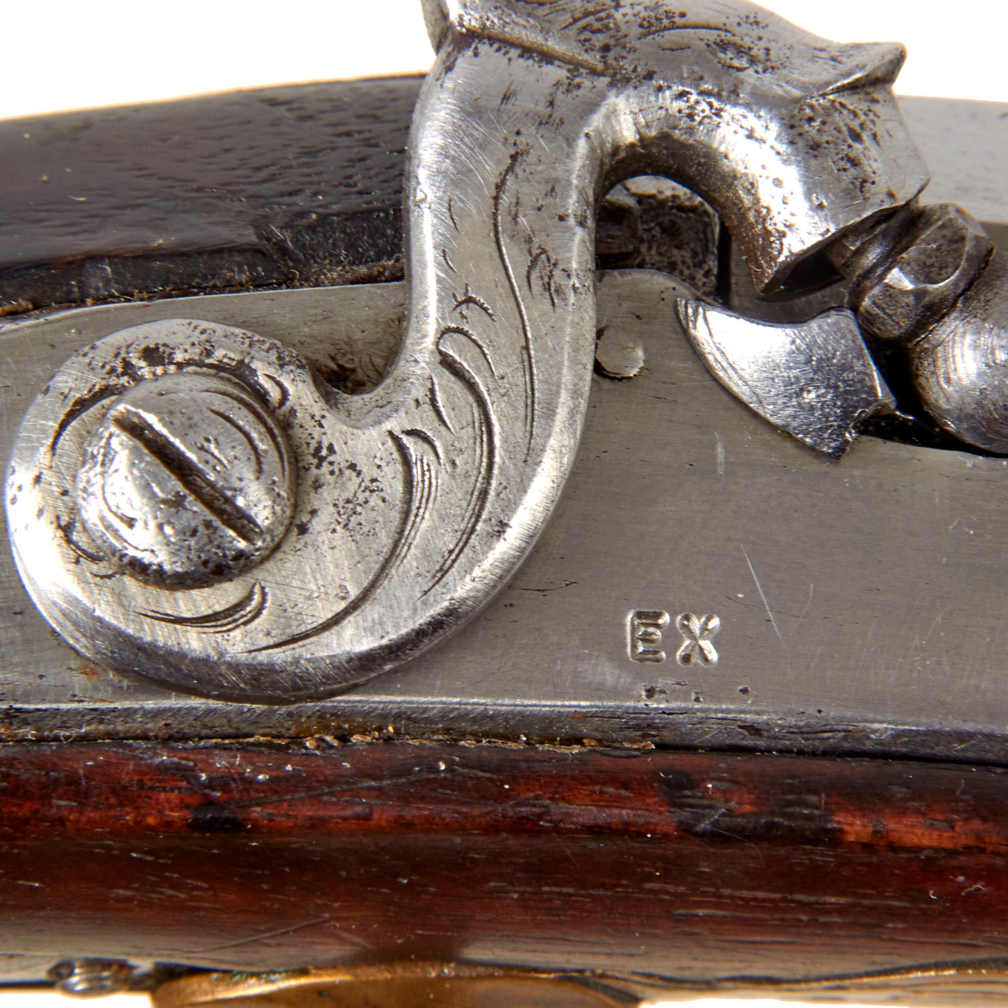The overall length is 14 inches, and the pistol is all bronze mounted, including the bronze-tipped ramrod. The trigger guard and octagonal butt cap features some lovely engraved designs. There are some faded markings on the top of the barrel, but we are not able to read them accurately, except for a faded EX marking, which matches the marking on the lock plate. The iron work definitely looks to have been polished and cleaned over the years, which definitely would have removed markings and engraving if present. The lock is still fully functional, holding correctly at half cock, and the cap nipple cone does show wear from use.