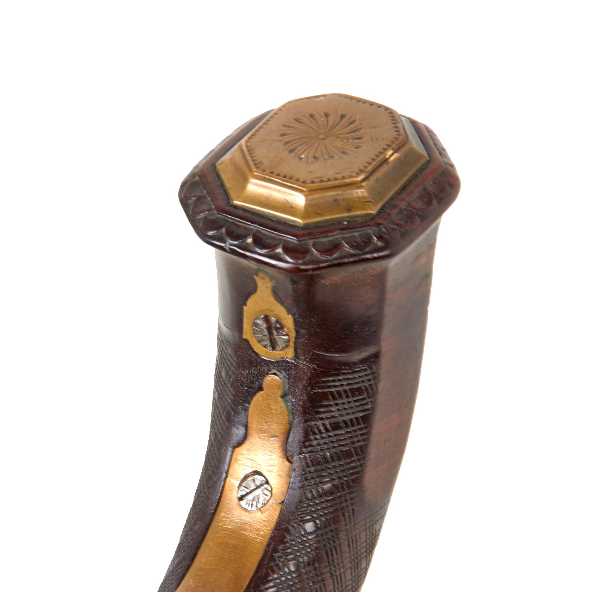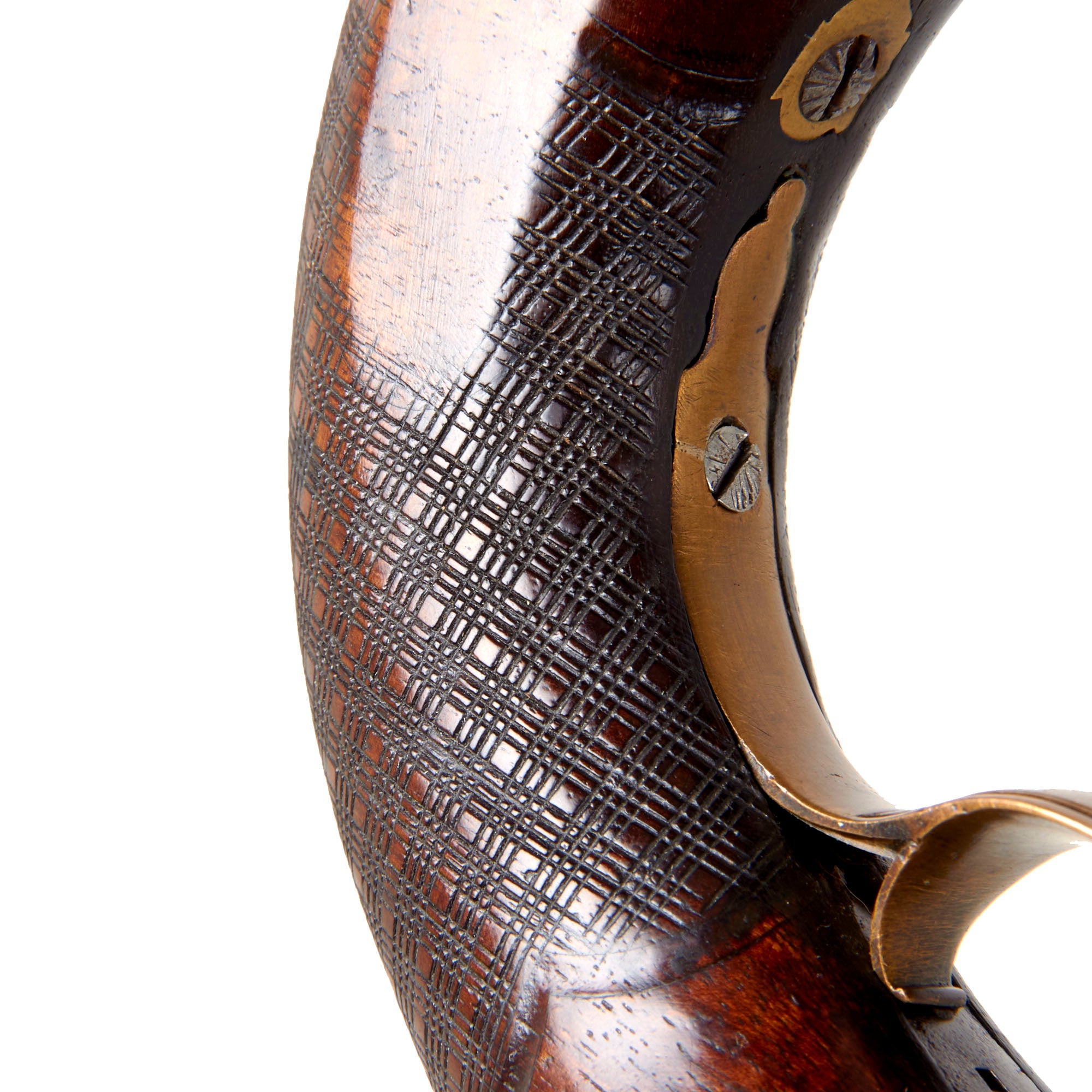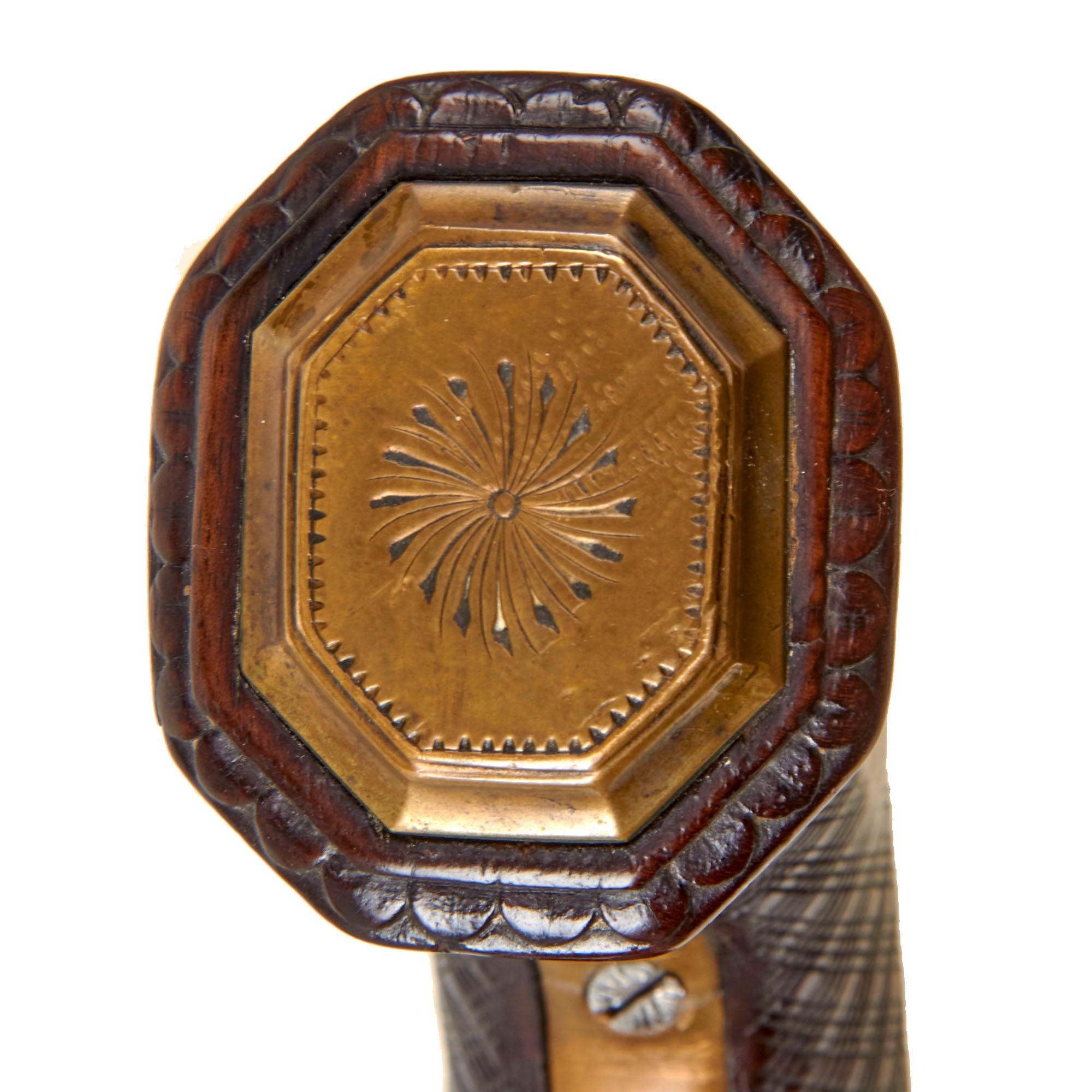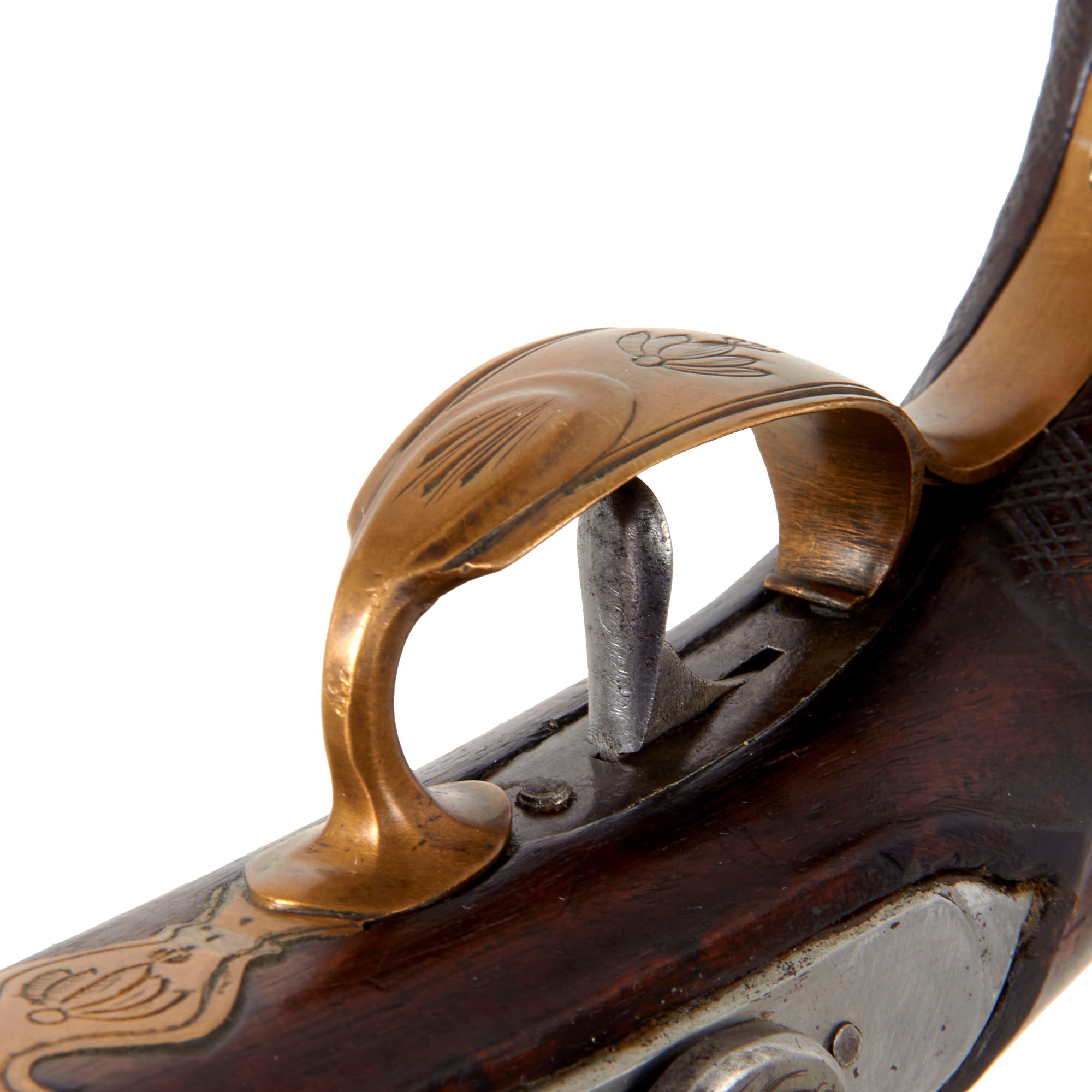 The overall length is 14 inches, and the pistol is all bronze mounted, including the bronze-tipped ramrod. The trigger guard and octagonal butt cap features some lovely engraved designs. There are some faded markings on the top of the barrel, but we are not able to read them accurately, except for a faded EX marking, which matches the marking on the lock plate. The iron work definitely looks to have been polished and cleaned over the years, which definitely would have removed markings and engraving if present. The lock is still fully functional, holding correctly at half cock, and the cap nipple cone does show wear from use.
