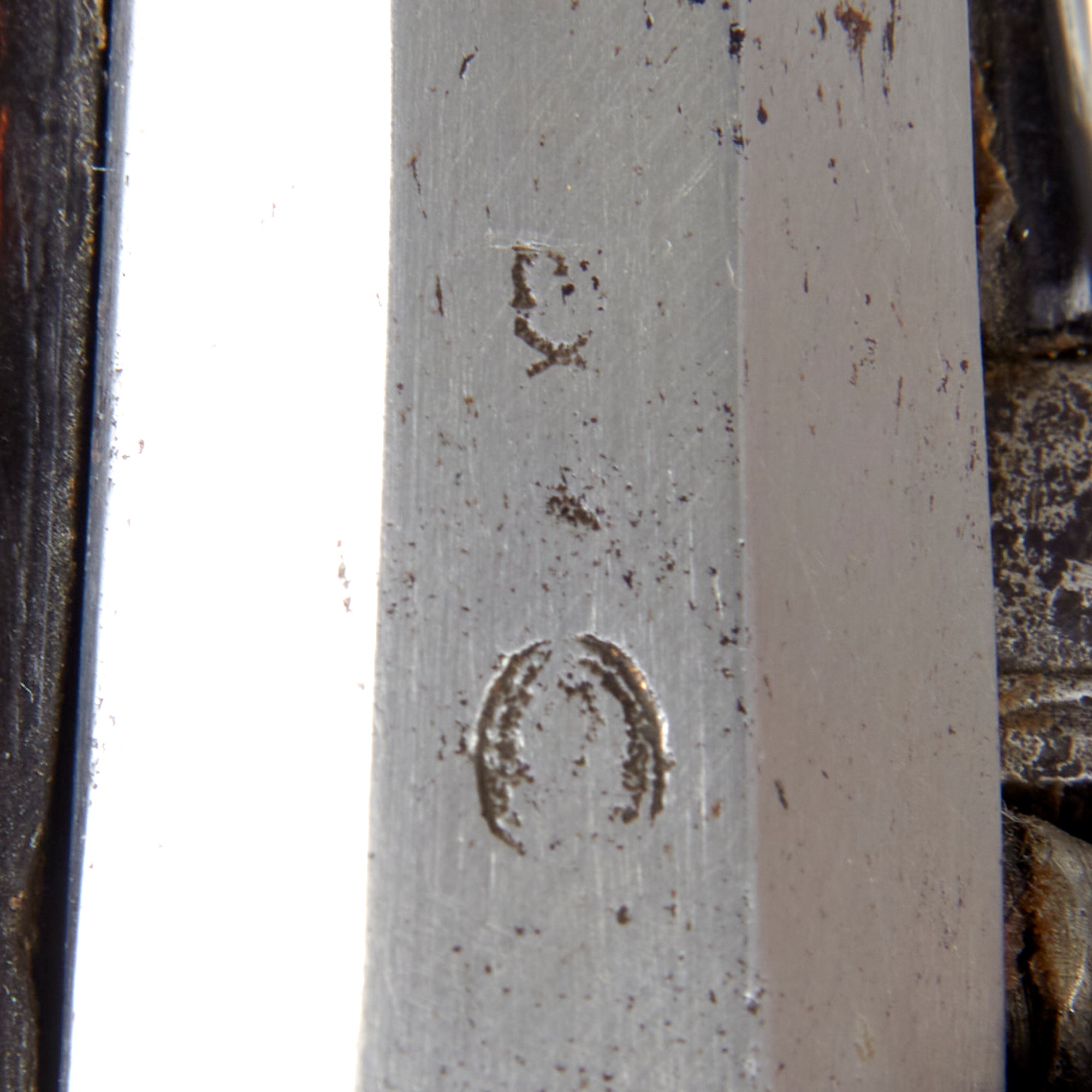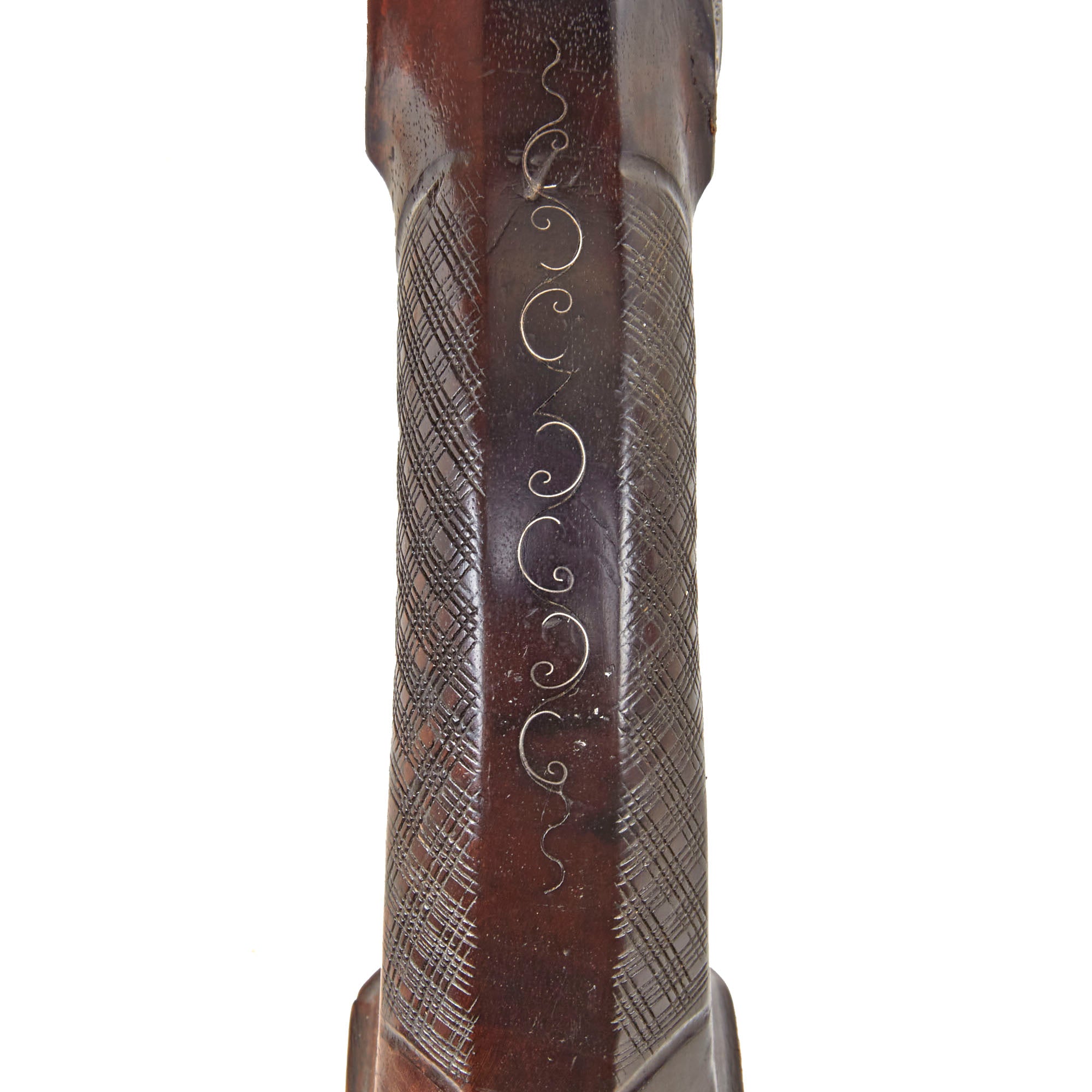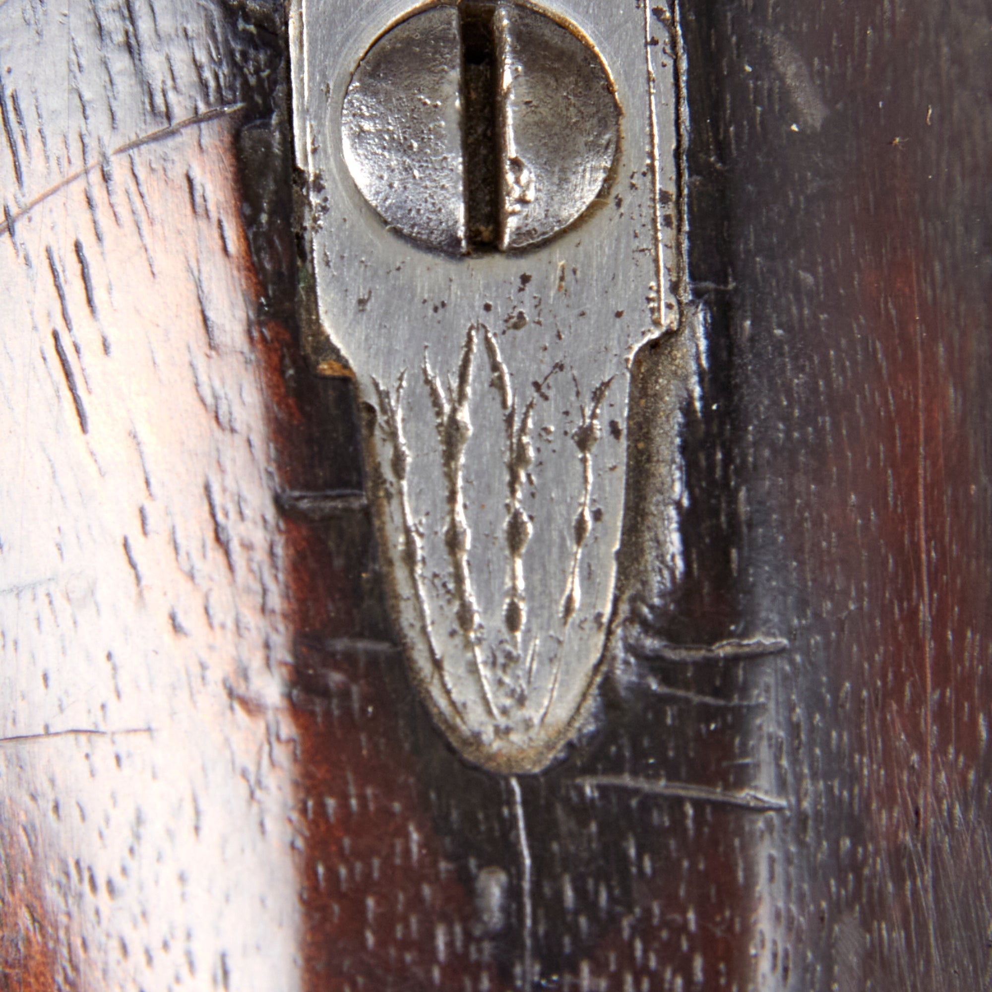 The walnut stock is checkered around the wrist and terminates in a lovely wide ring of the Versailles style. We can also see some lovely figuring to the wood, which shows some lovely chatoyancy in the light. There is even some silver wire inlay down the back of the wrist, though it is worn and incomplete. Both sides of the fore stock near the muzzle show cracking and past repairs, with a wood graft repair on the right side measuring about 4 inches long along the woodline. The pistol definitely looks to have seen a good amount of use, followed by cleaning and restoration.