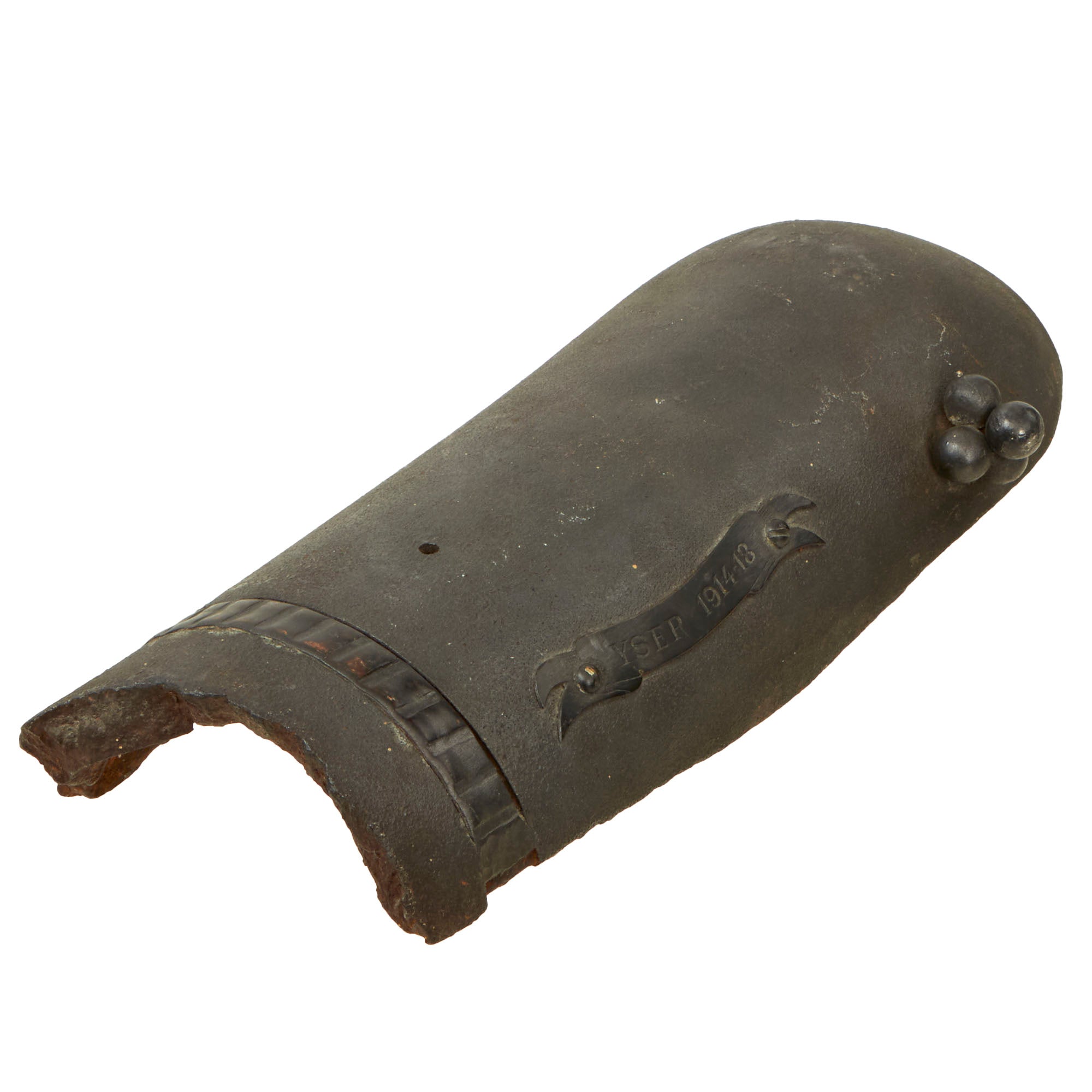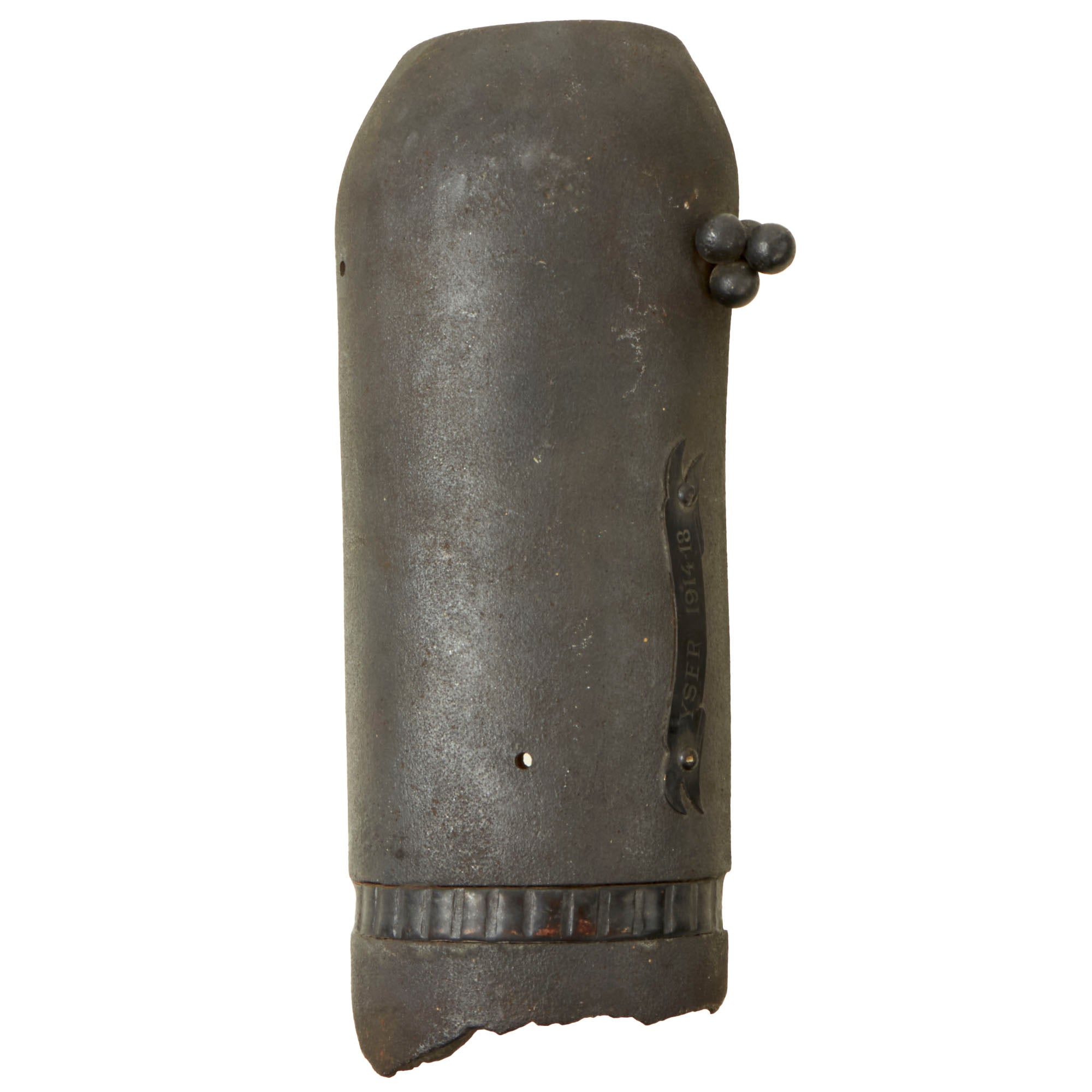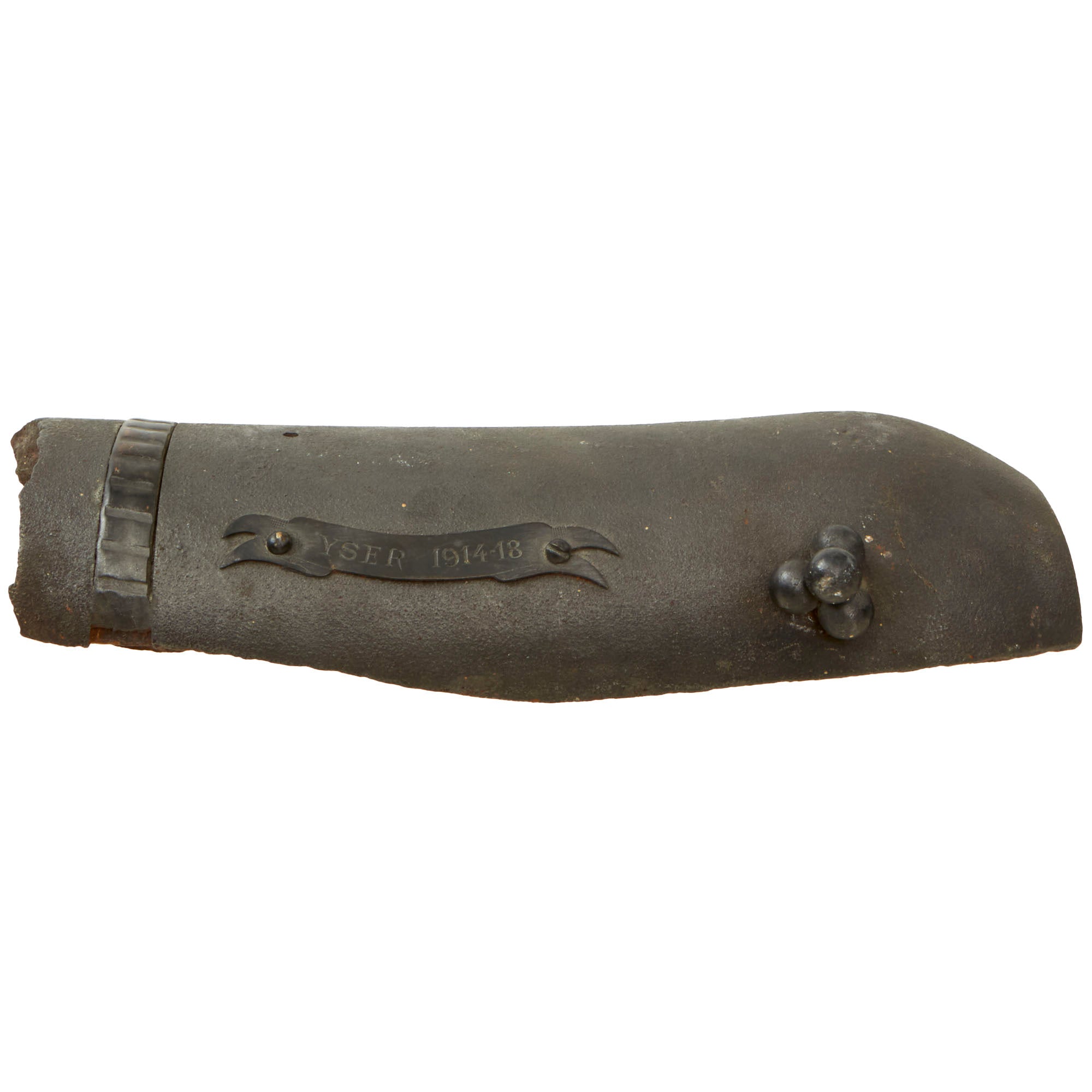 The shell fragment is very large, roughly 4½ x 11½ x 1¾” with the height coming from the shell’s curvature. The shell’s driving band is still retained in the majority of where it is visible. There have been several holes drilled for placement of small clusters of shrapnel balls, of which only one cluster of 4 remains. There is a small ribbon-shaped plaque riveted to the side of the shell reading YSER 1914-1918.