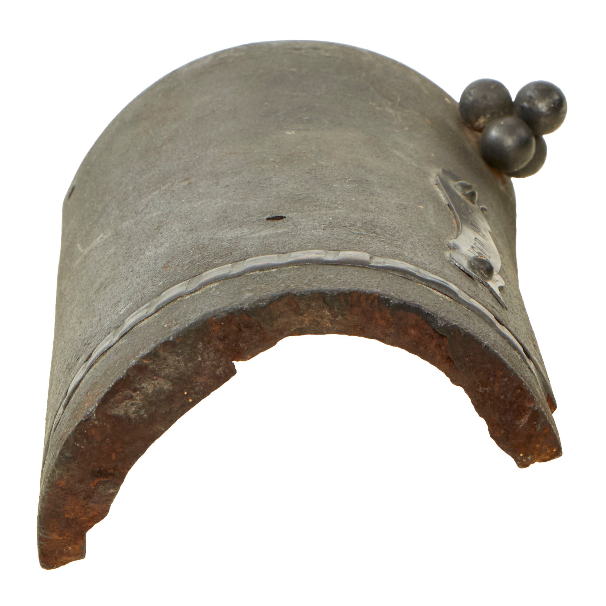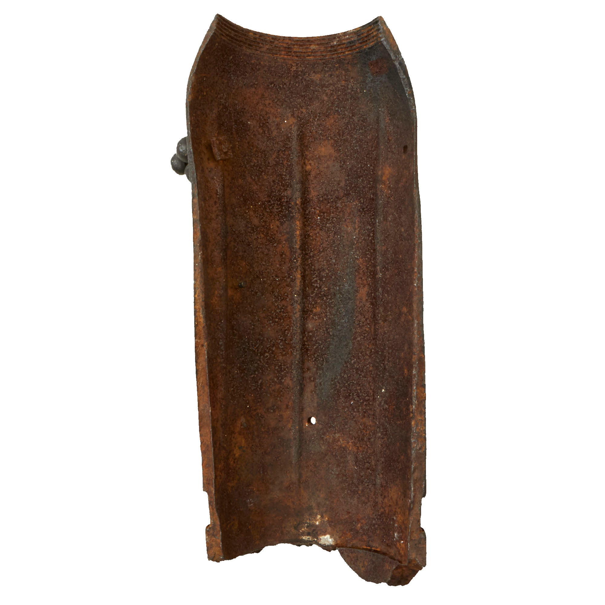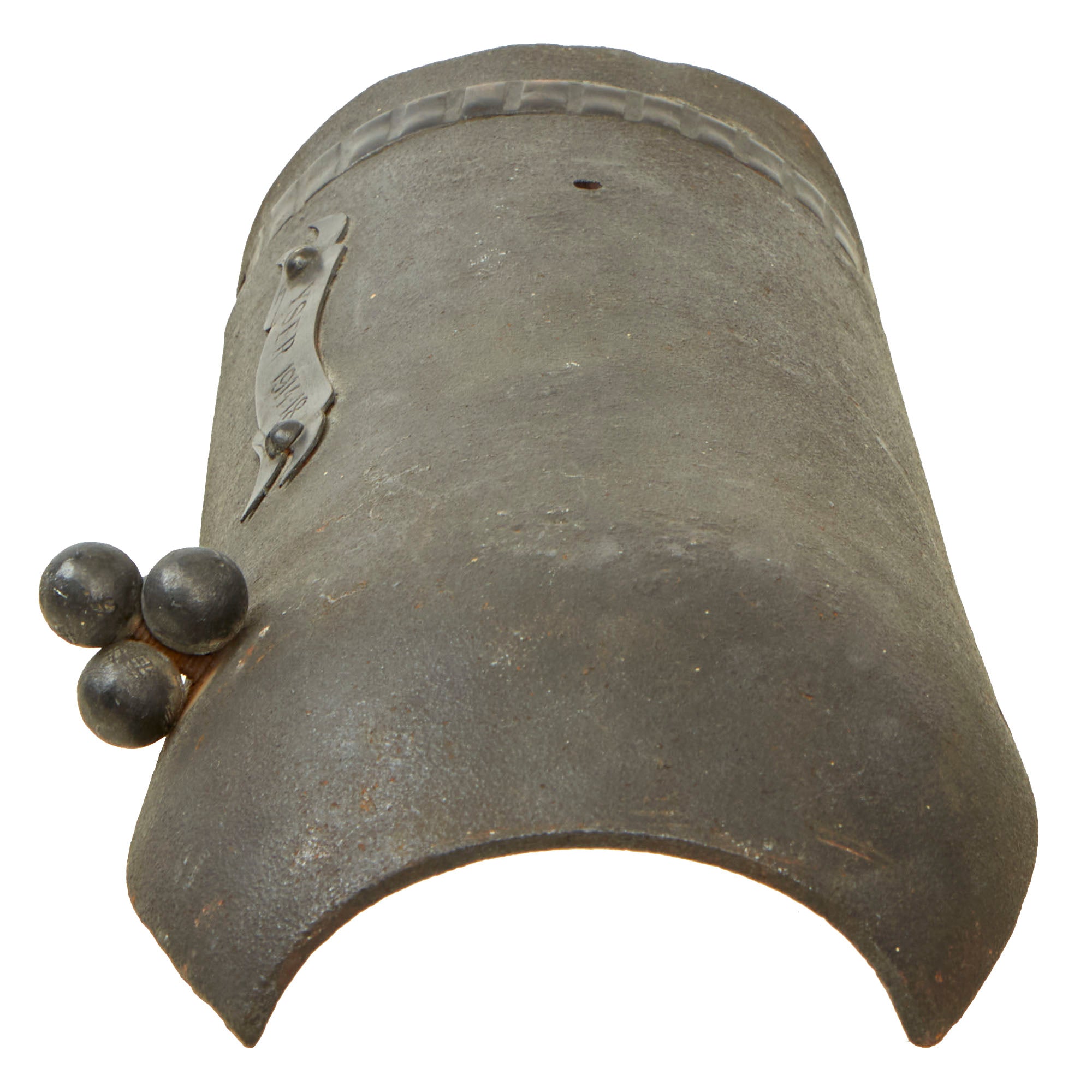 The shell fragment is very large, roughly 4½ x 11½ x 1¾” with the height coming from the shell’s curvature. The shell’s driving band is still retained in the majority of where it is visible. There have been several holes drilled for placement of small clusters of shrapnel balls, of which only one cluster of 4 remains. There is a small ribbon-shaped plaque riveted to the side of the shell reading YSER 1914-1918.