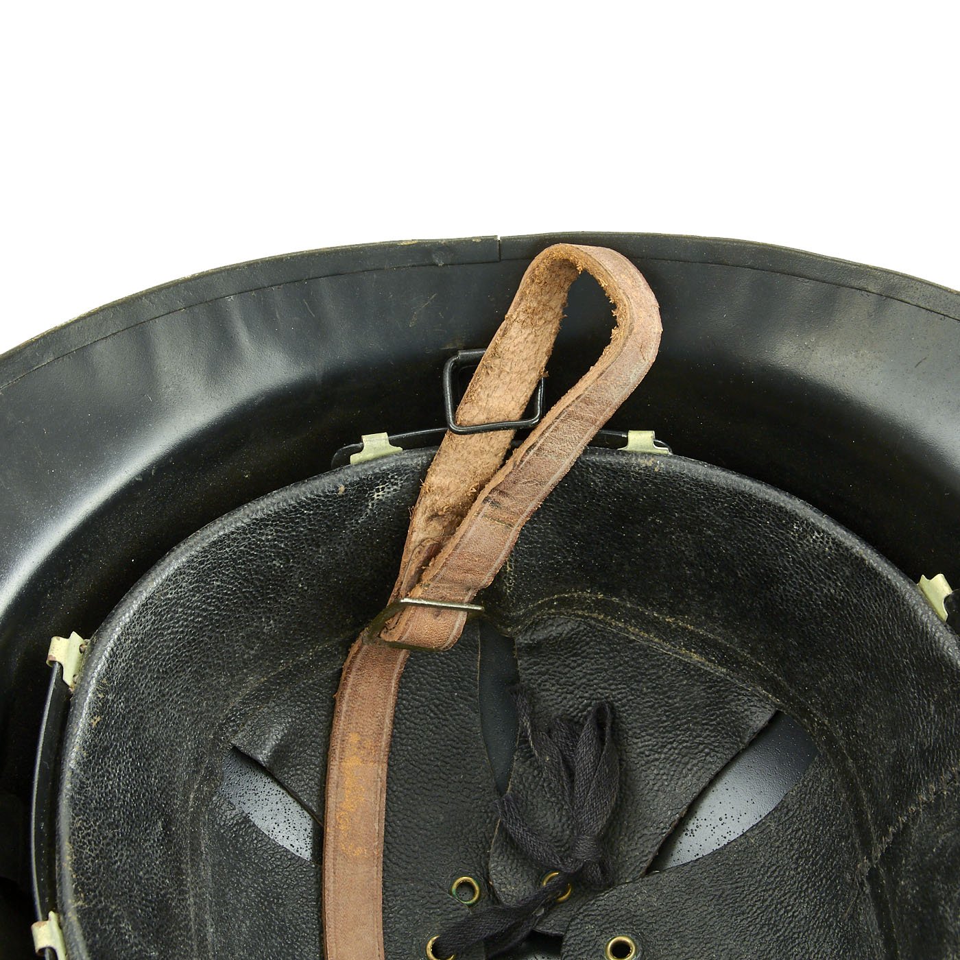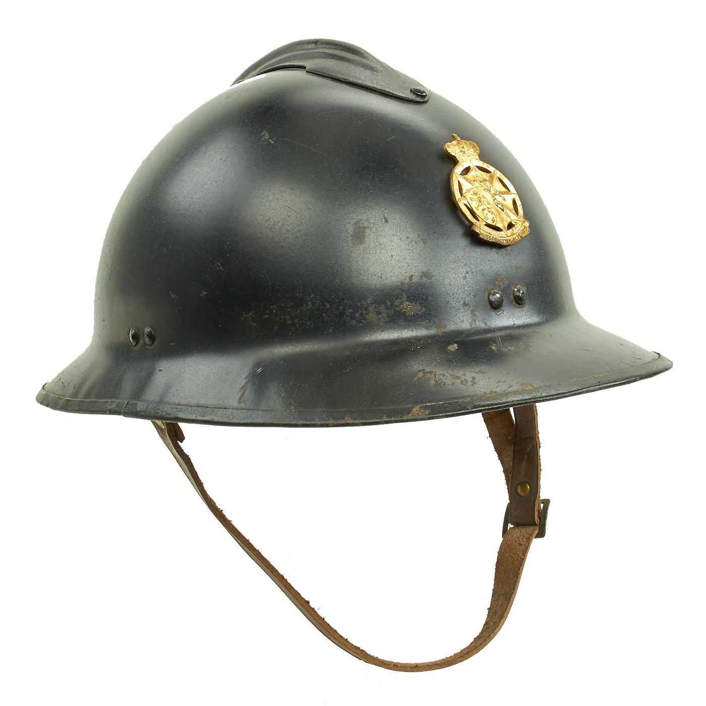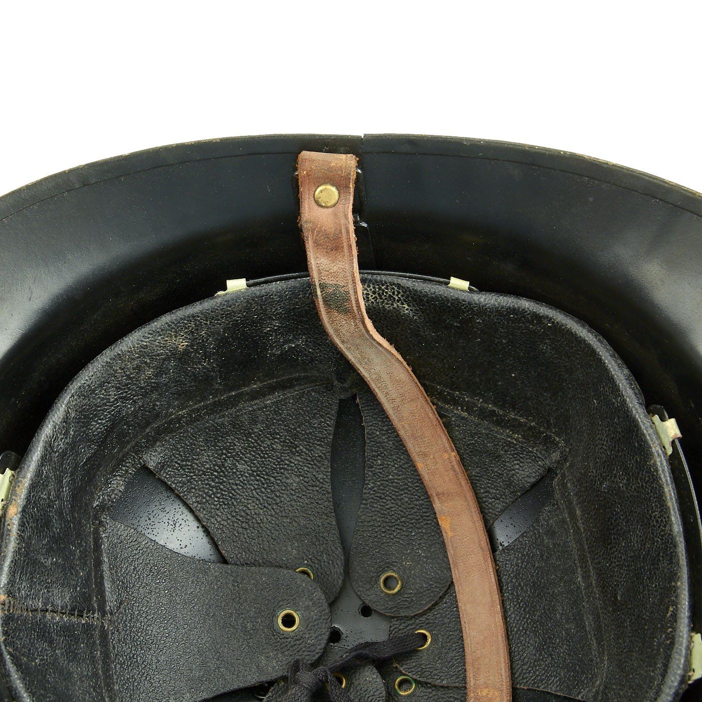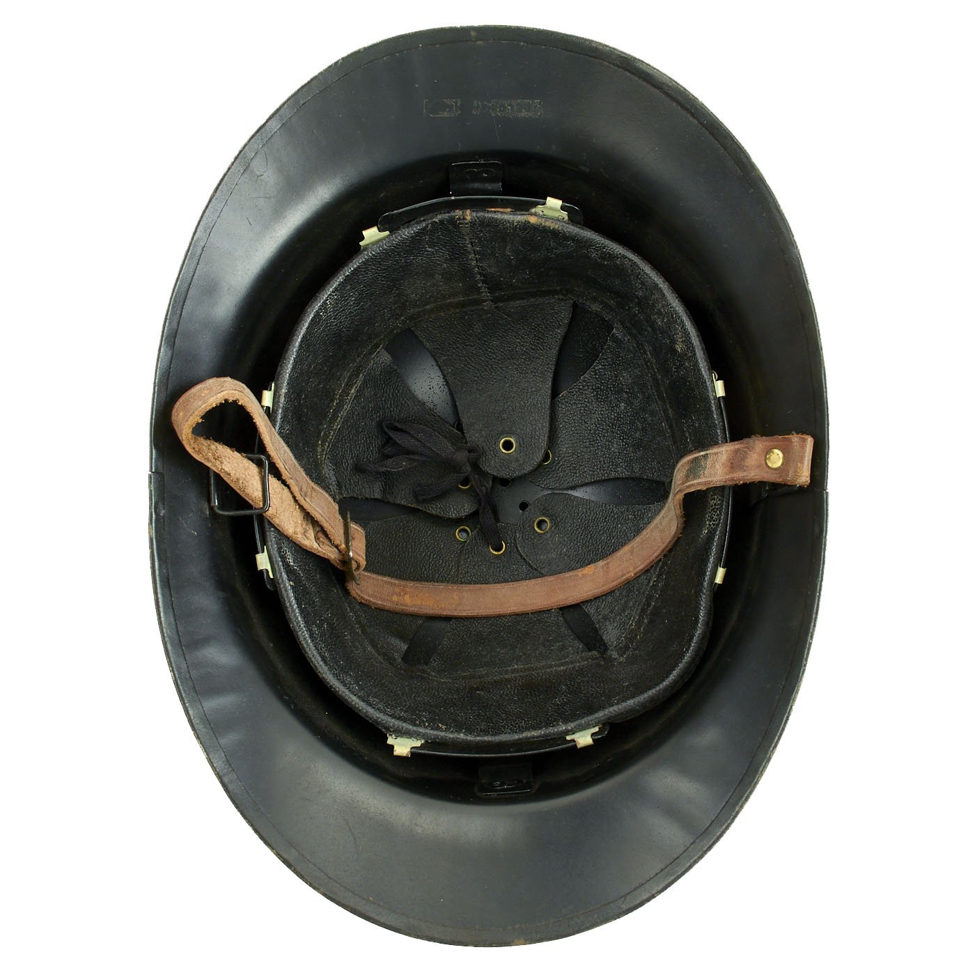 Original Item: Only One Available. Made prior to WWII, this is a black painted steel French "Adrian" style helmet, with a Civil Defense badge attached to the front. These helmets were issued before, during and after the fall of Belgium in 1940 to the NSDAPs. The helmet is in very good condition, with great paint, and an original liner and chin strap, which show little to no use. This looks to be a helmet that was not really "issued" during wartime, and was kept in storage. Liner size is approximately 58cm / 7 1/4.