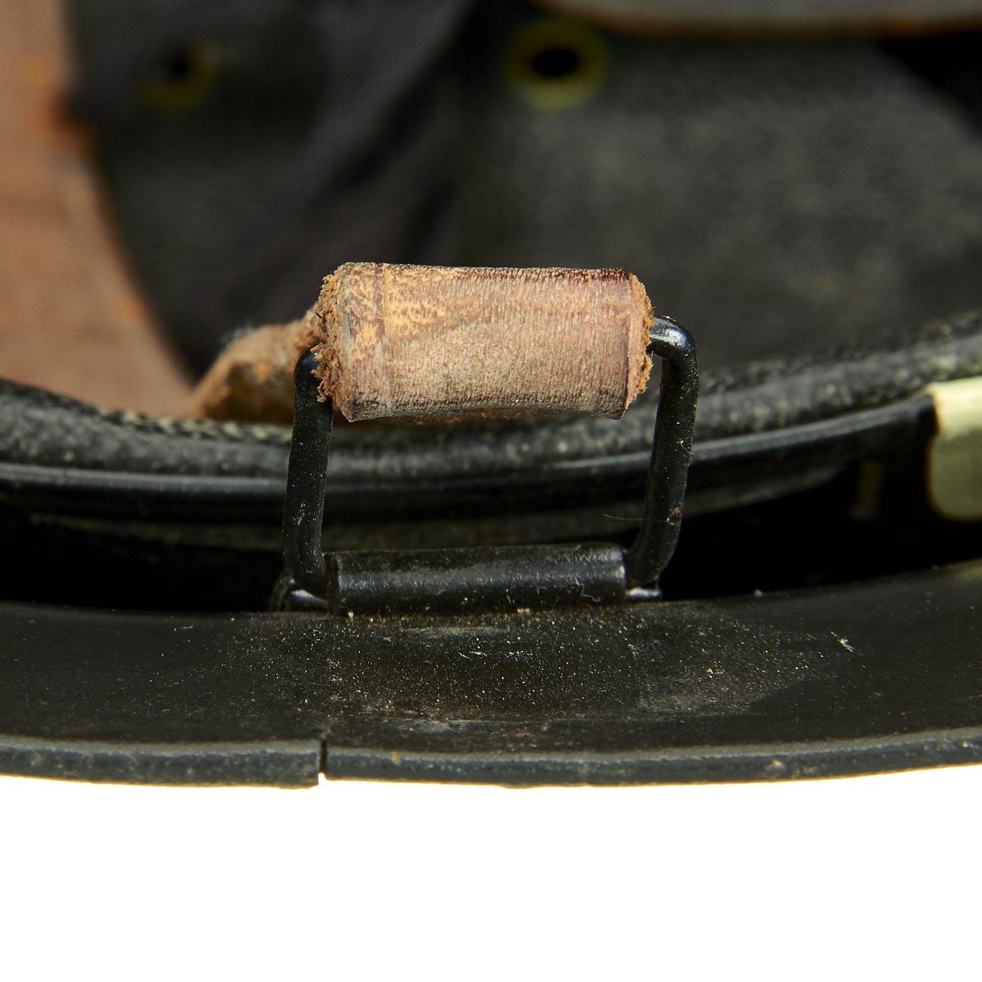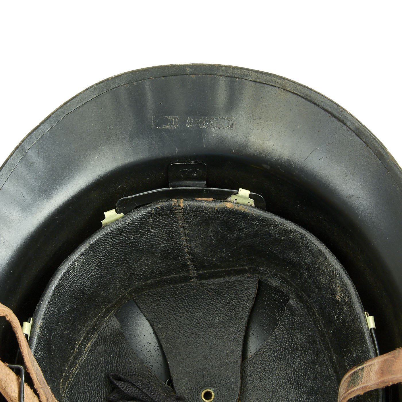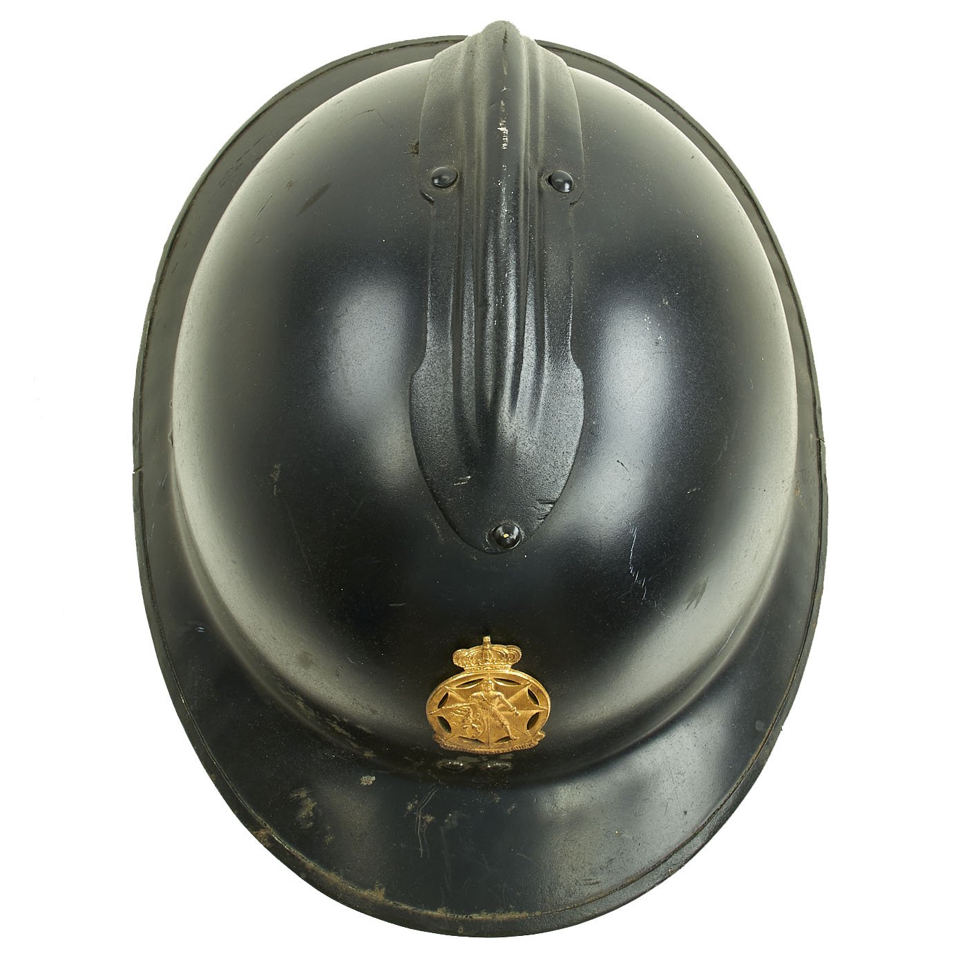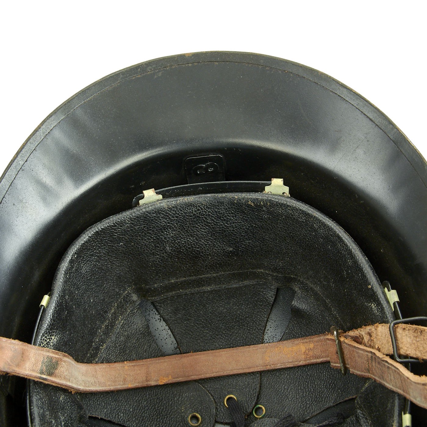 Original Item: Only One Available. Made prior to WWII, this is a black painted steel French "Adrian" style helmet, with a Civil Defense badge attached to the front. These helmets were issued before, during and after the fall of Belgium in 1940 to the NSDAPs. The helmet is in very good condition, with great paint, and an original liner and chin strap, which show little to no use. This looks to be a helmet that was not really "issued" during wartime, and was kept in storage. Liner size is approximately 58cm / 7 1/4.