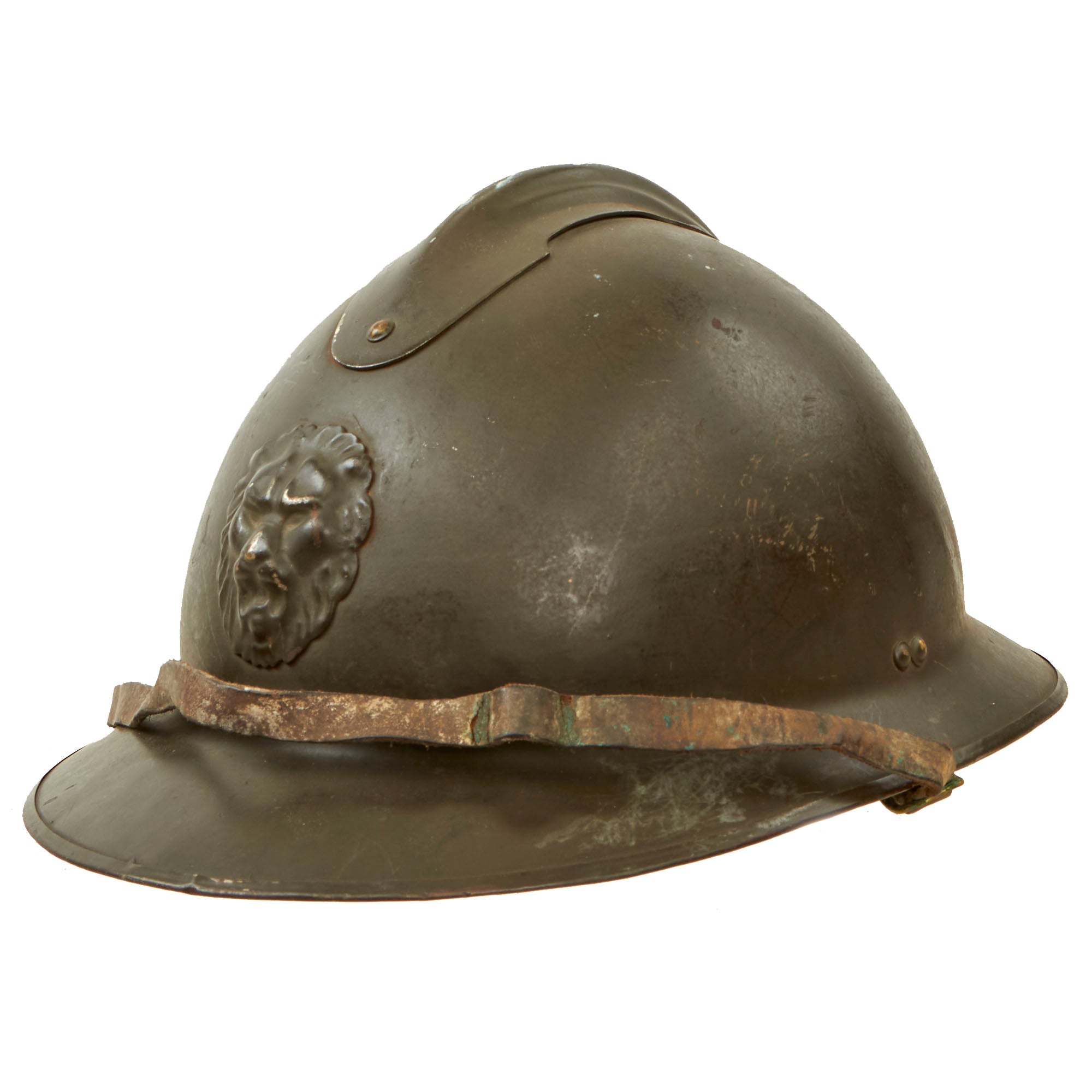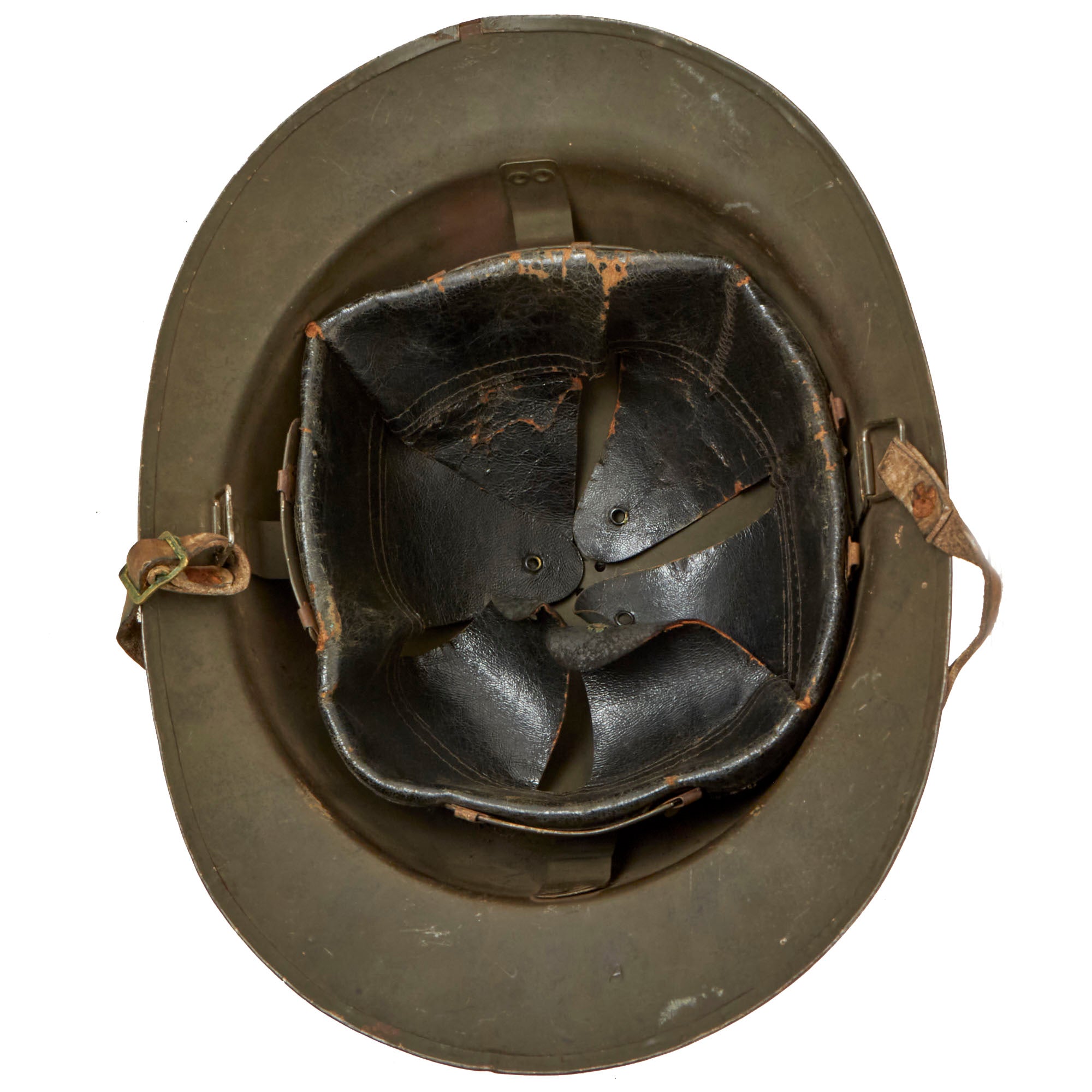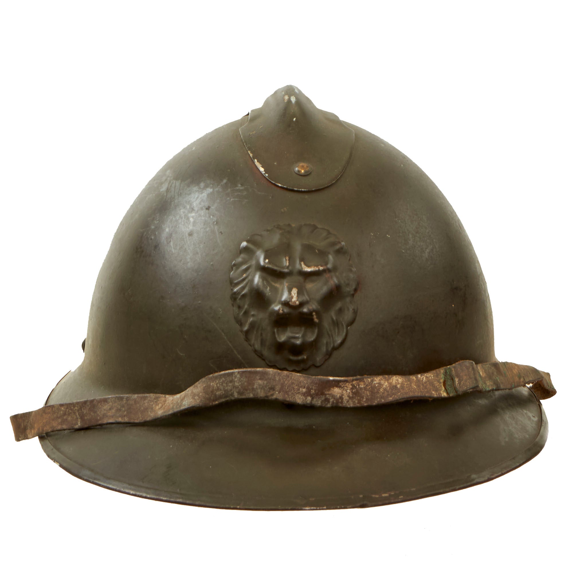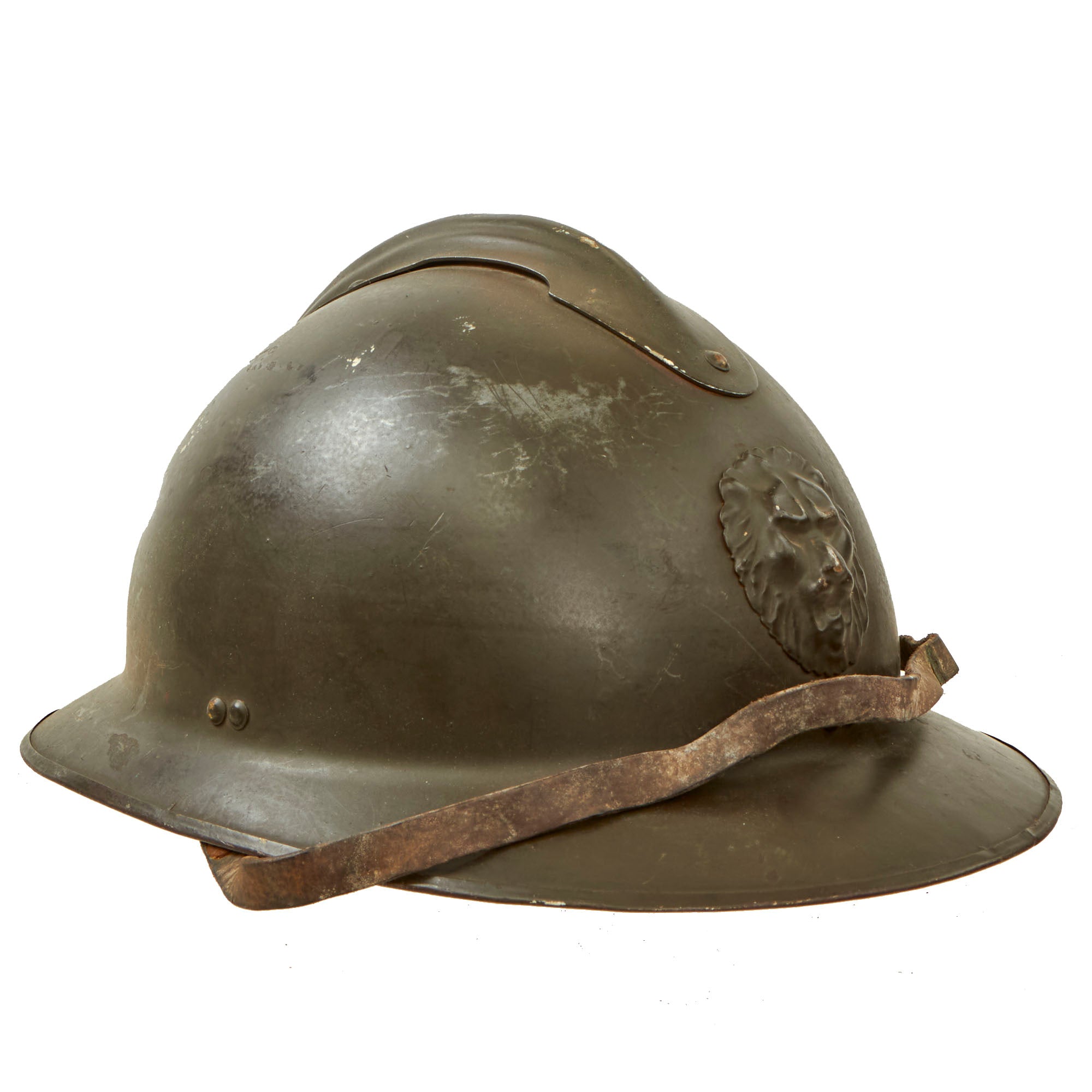 Original Item: Only One Available. Here we have a genuine World War II model 1926 Belgian Army "Adrian" helmet. The helmet retains the original olive green paint and is complete with the Belgian "Lion's Head" badge to front. The size of the helmet is approximately US 7 (56cm). Features a wonderful complete original leather liner in very good used condition, along with the original chinstrap.