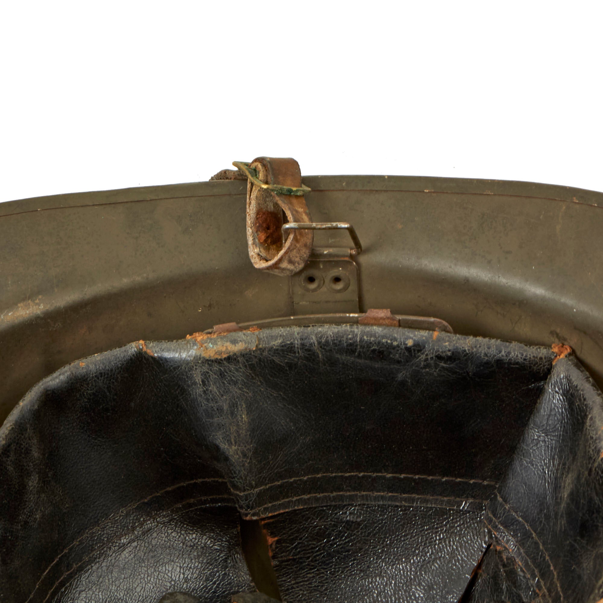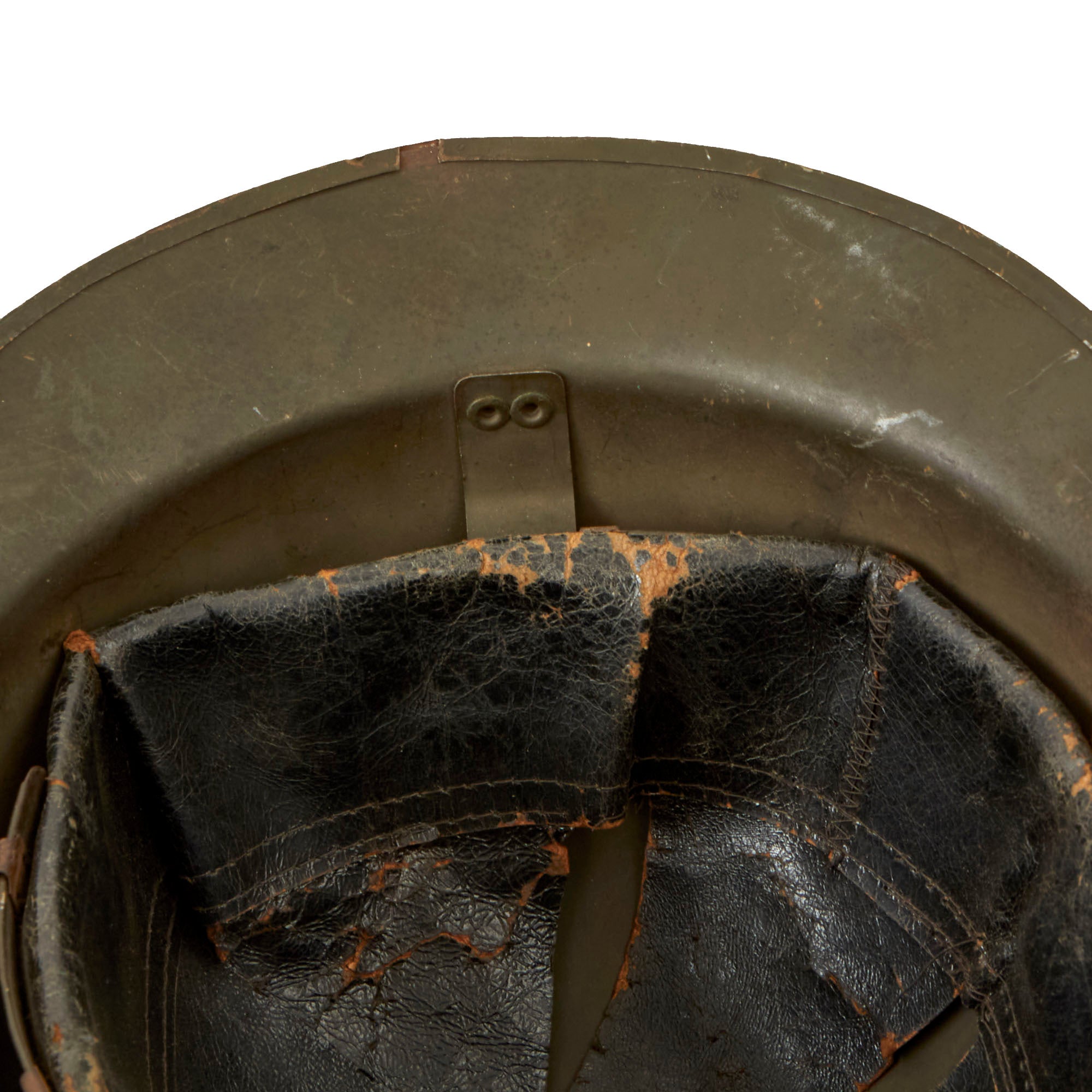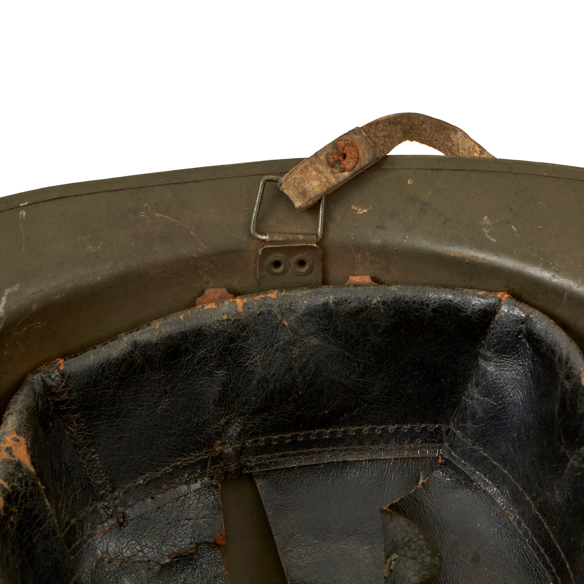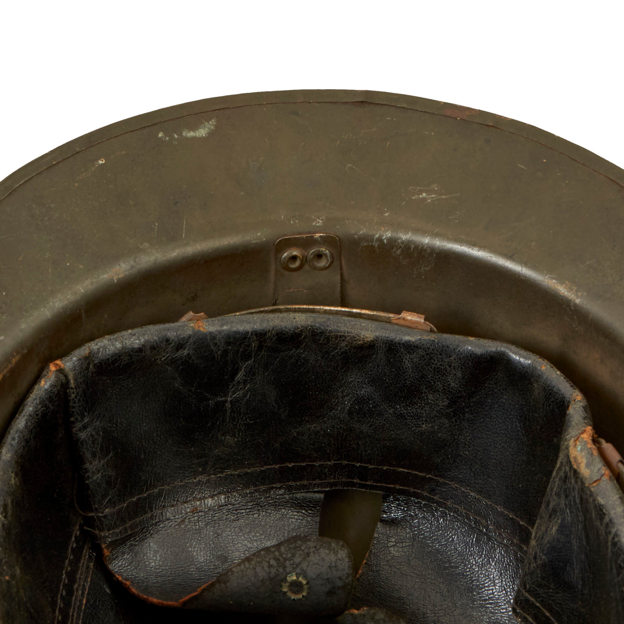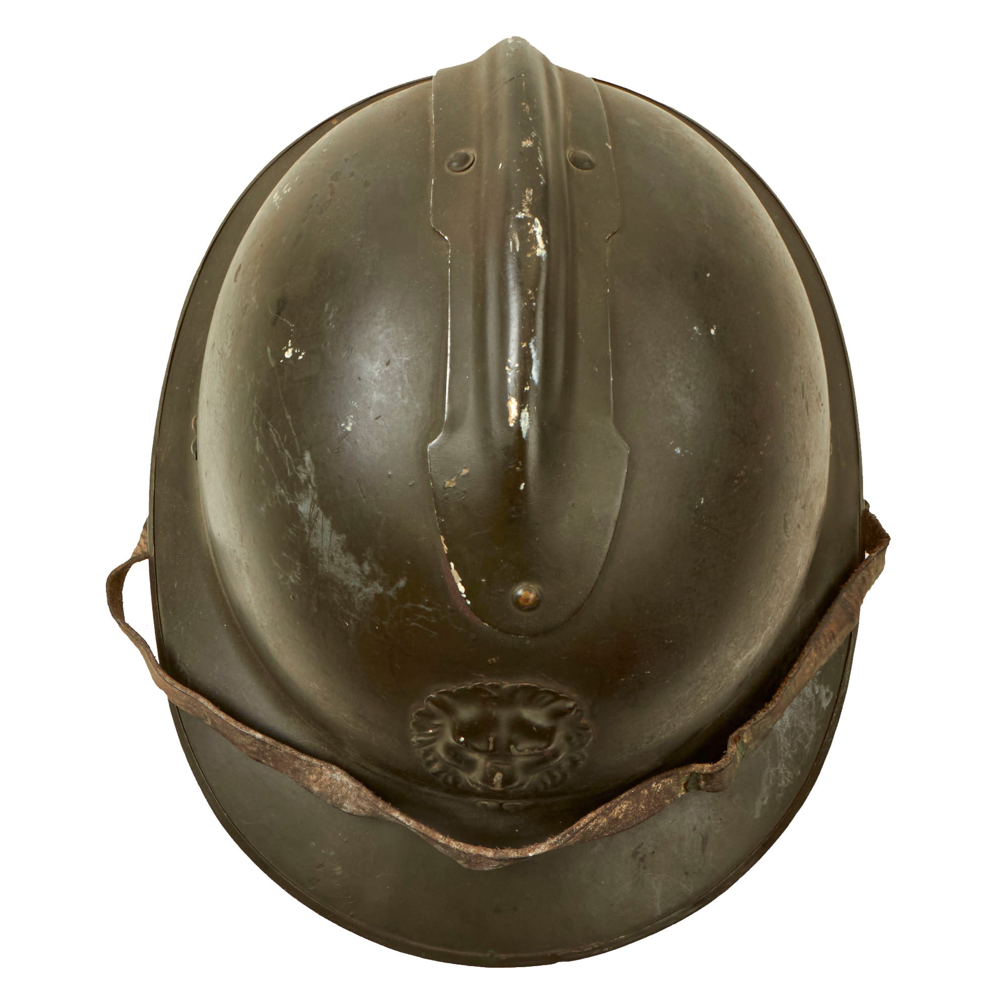 Original Item: Only One Available. Here we have a genuine World War II model 1926 Belgian Army "Adrian" helmet. The helmet retains the original olive green paint and is complete with the Belgian "Lion's Head" badge to front. The size of the helmet is approximately US 7 (56cm). Features a wonderful complete original leather liner in very good used condition, along with the original chinstrap.