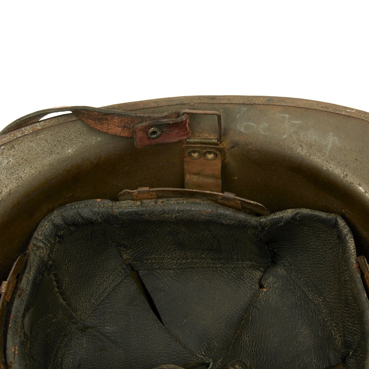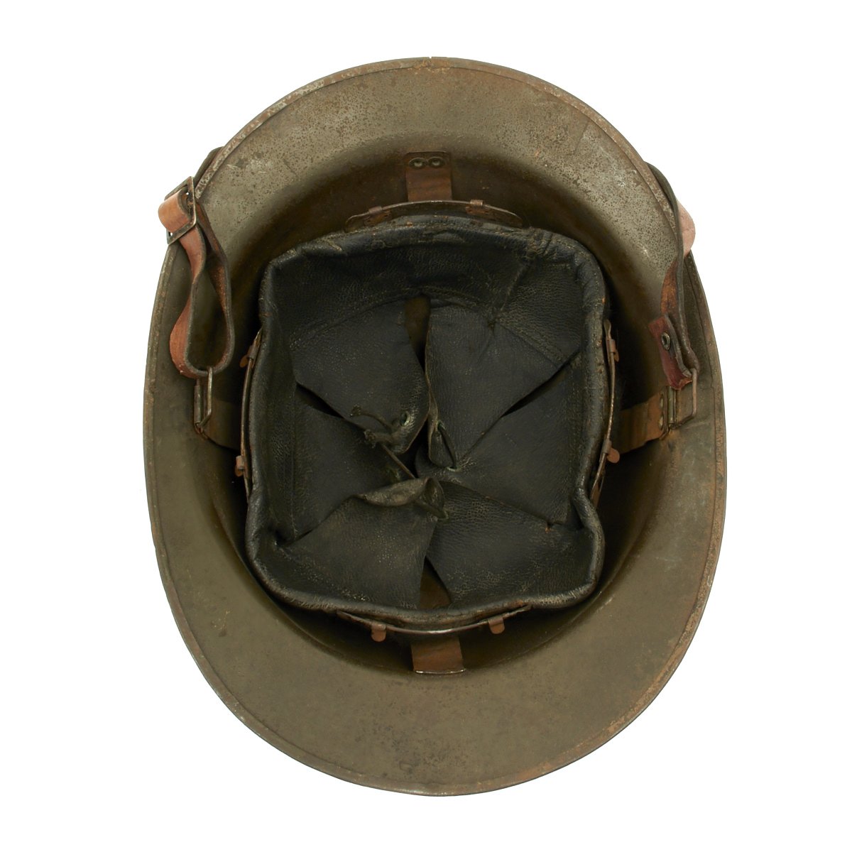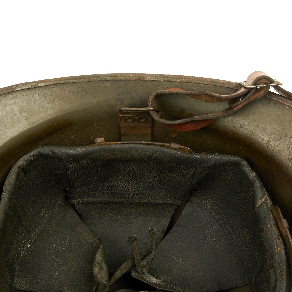 Original Item: Only One Available. Excellent genuine World War II model 1926 Belgian Army "Adrian" helmet. The helmet retains the original olive green paint and is complete with the Belgian Lion badge to front. Size is approximately US 7.25 (58cm). Features a wonderful complete original leather liner in excellent condition, complete with original chin strap. Overall condition of the helmet is very good, shell shows some minor dings, scratches and paint loss consistent with age.