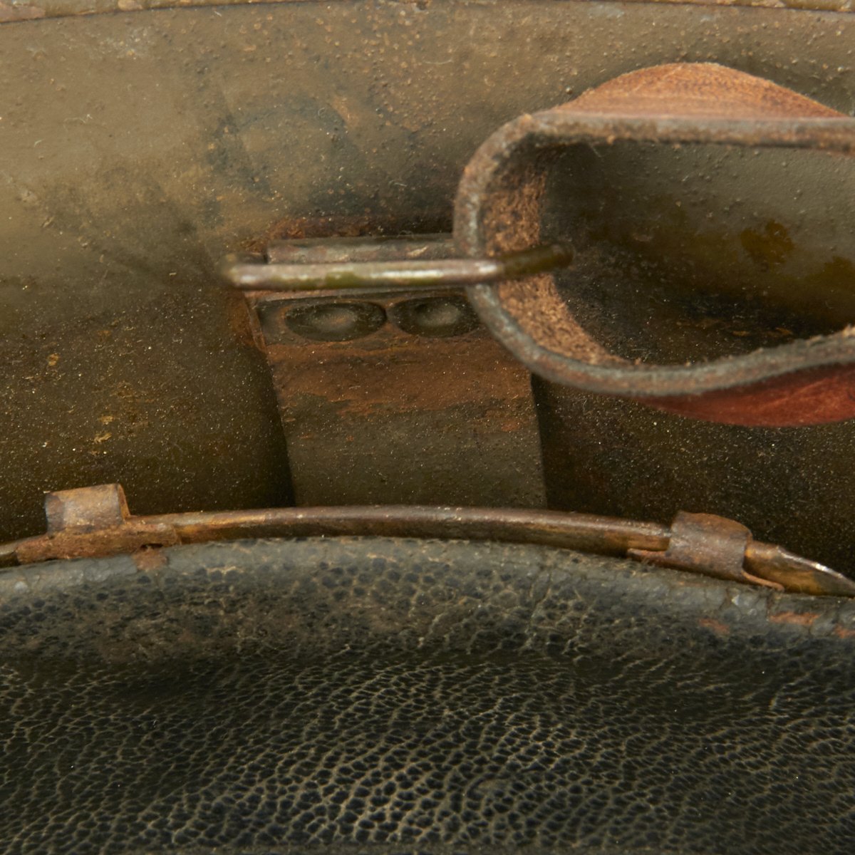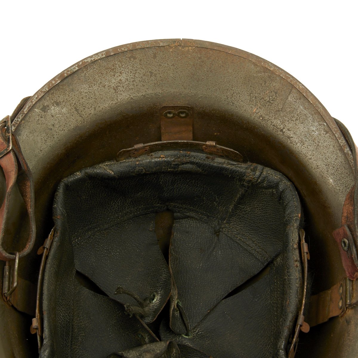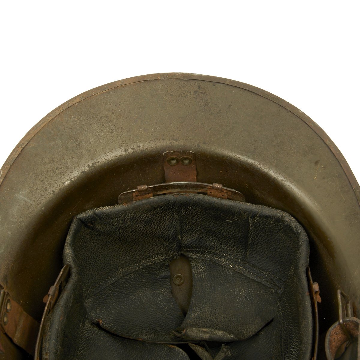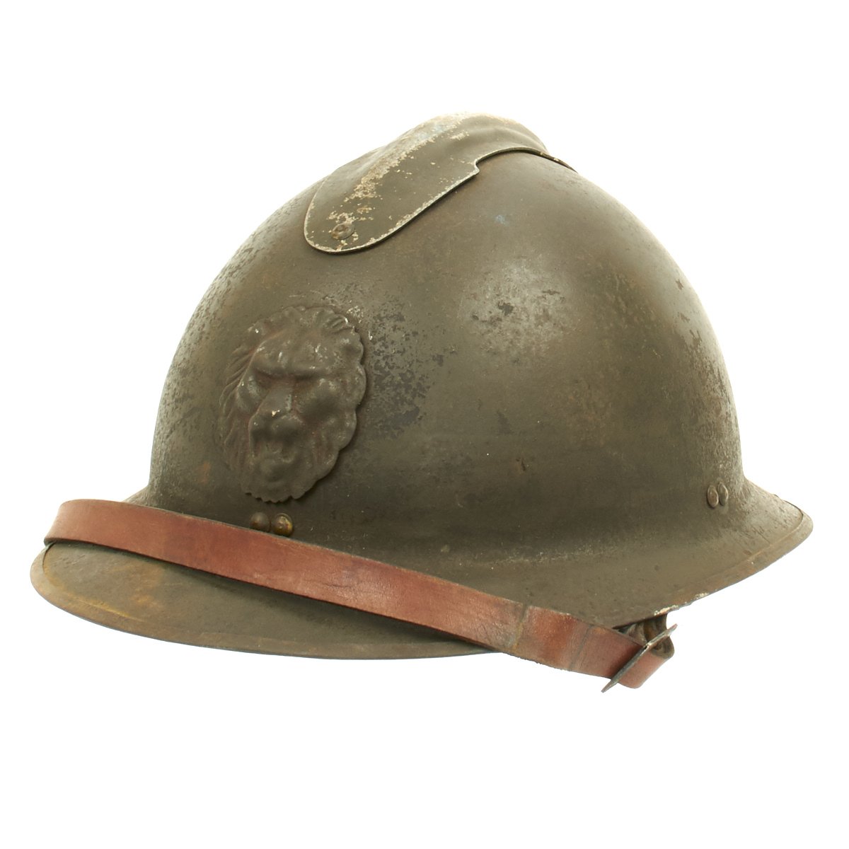 Original Item: Only One Available. Excellent genuine World War II model 1926 Belgian Army "Adrian" helmet. The helmet retains the original olive green paint and is complete with the Belgian Lion badge to front. Size is approximately US 7.25 (58cm). Features a wonderful complete original leather liner in excellent condition, complete with original chin strap. Overall condition of the helmet is very good, shell shows some minor dings, scratches and paint loss consistent with age.