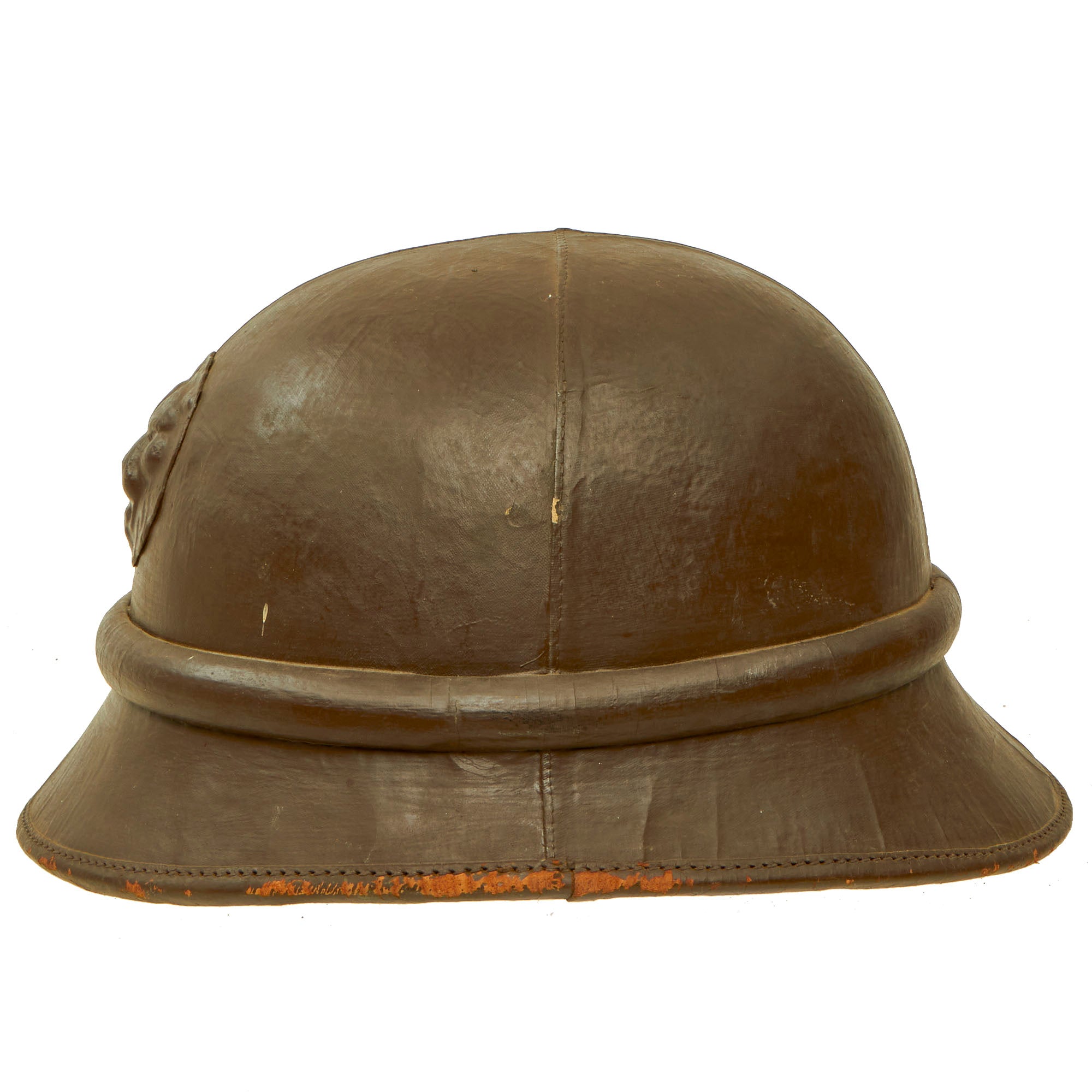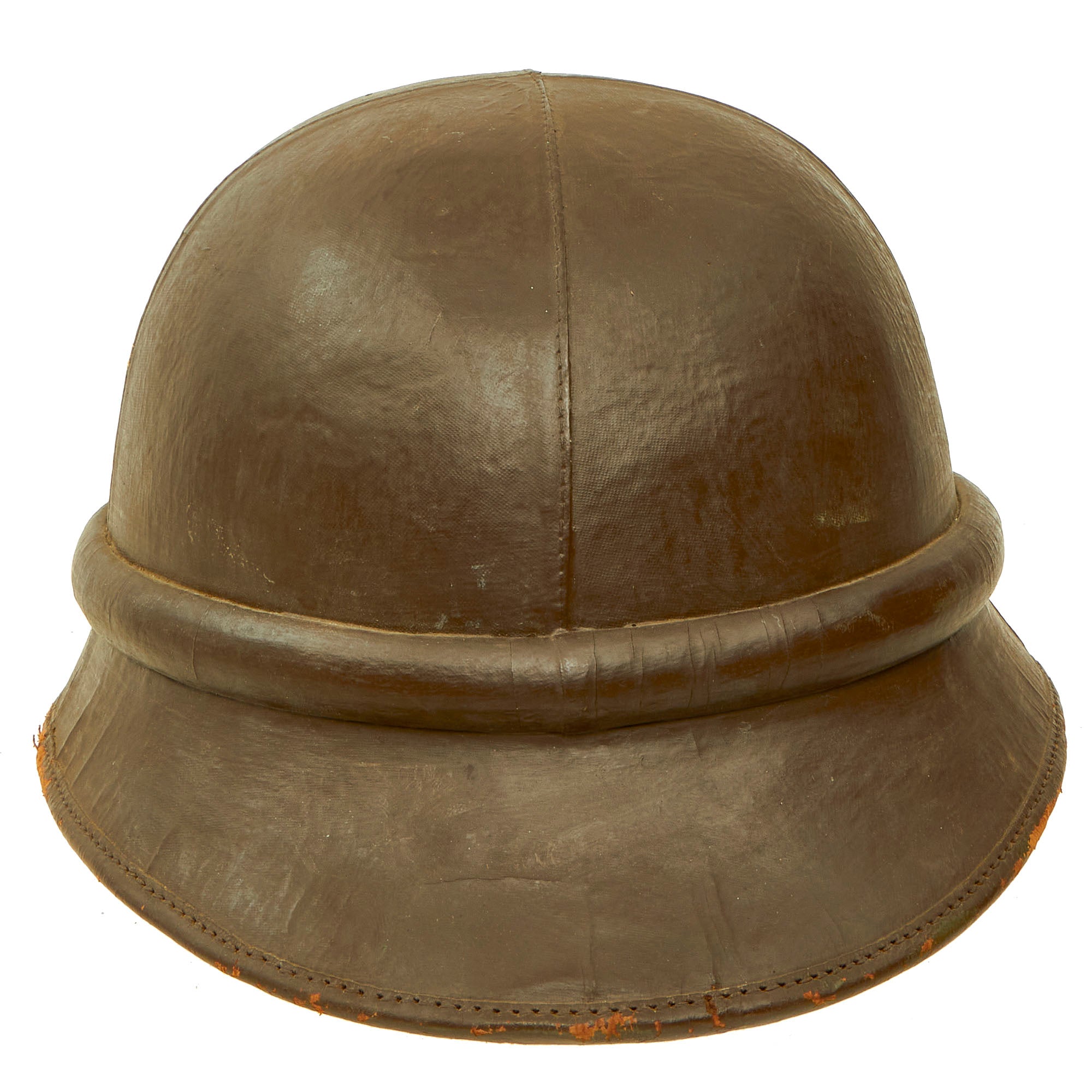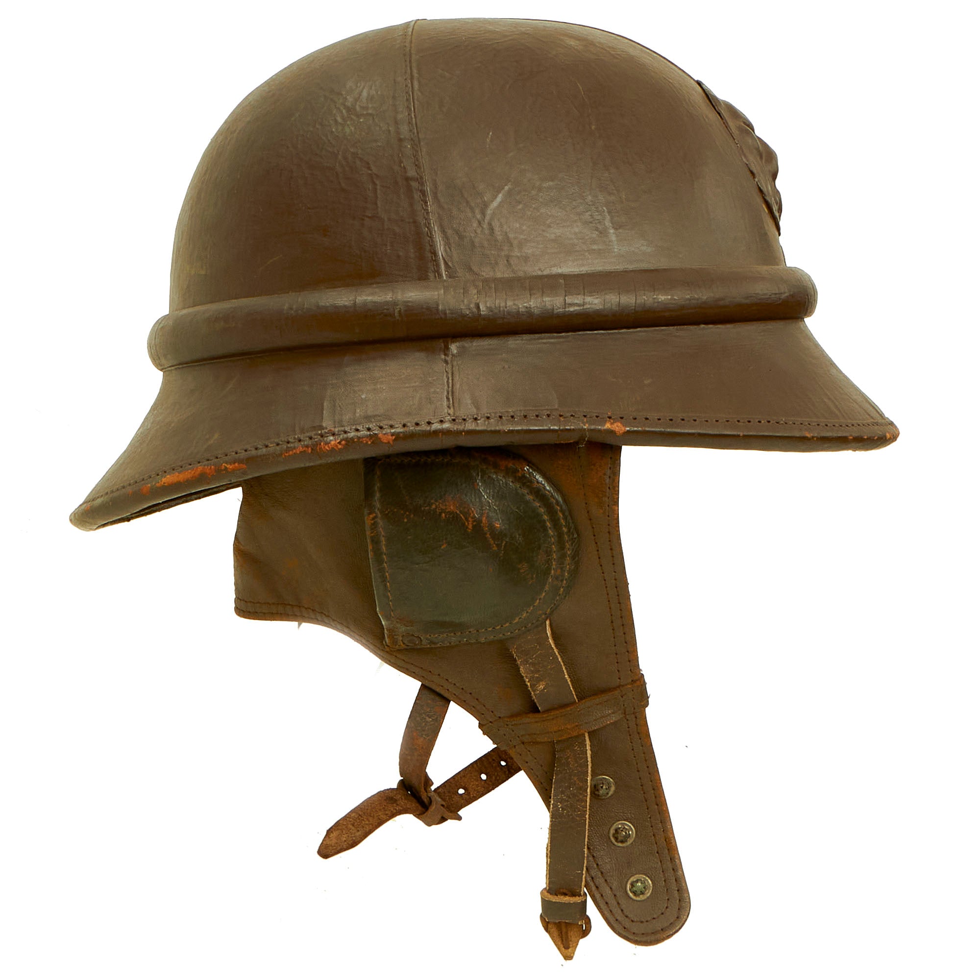 Original Item: Only One Available. Much like other countries during the WWII Period, Belgium developed a relatively lightweight helmet designed for wear by motorcycle dispatch riders, who had to move at a relatively high speed to deliver messages. Due to the lack of wind production that the motorcycle provided, this protection needed to be built into the liner of the helmet, in this case the leather protector for the ears and neck. This was especially important during the colder months. There are also ear cups facing rearward, which provided wind protection while still allowing the rider to hear. We have found period photographs online of these helmets in use, apparently during a parade, which are shown for historical purposes, and are not included.