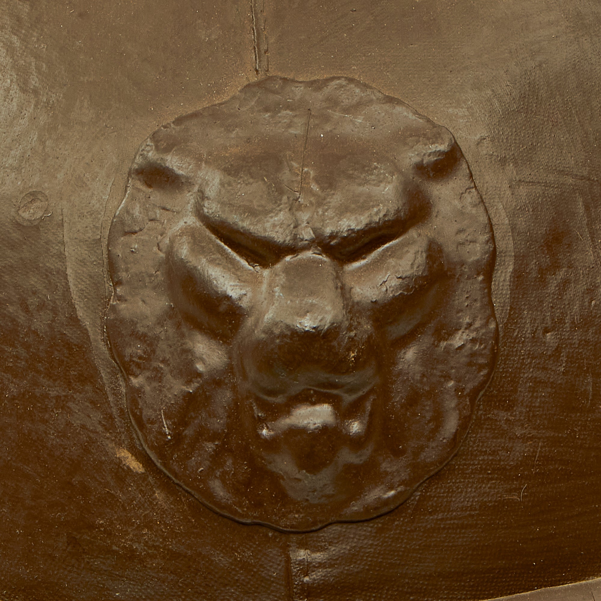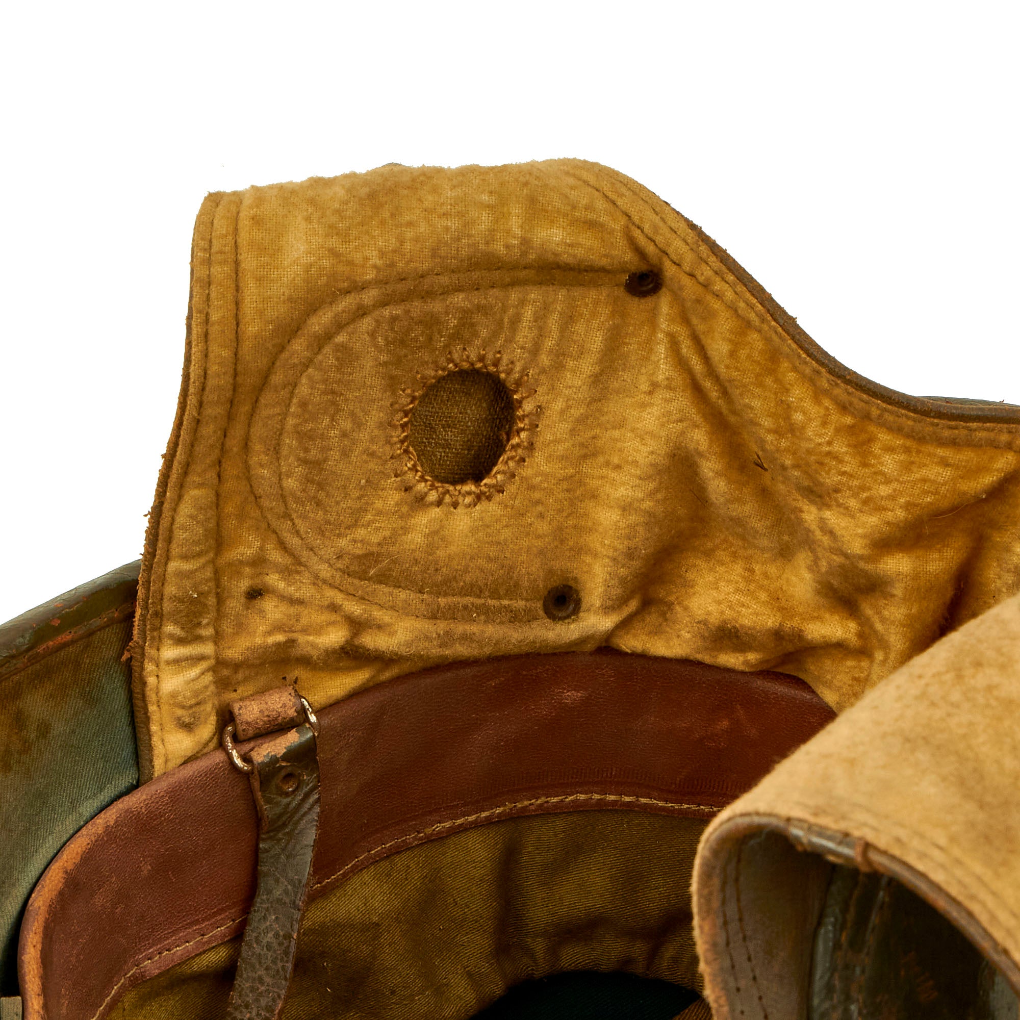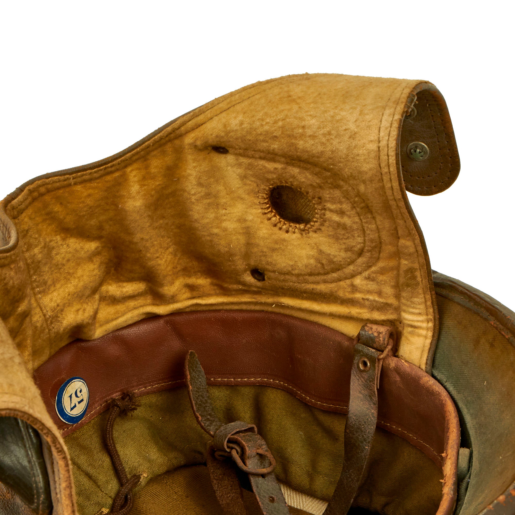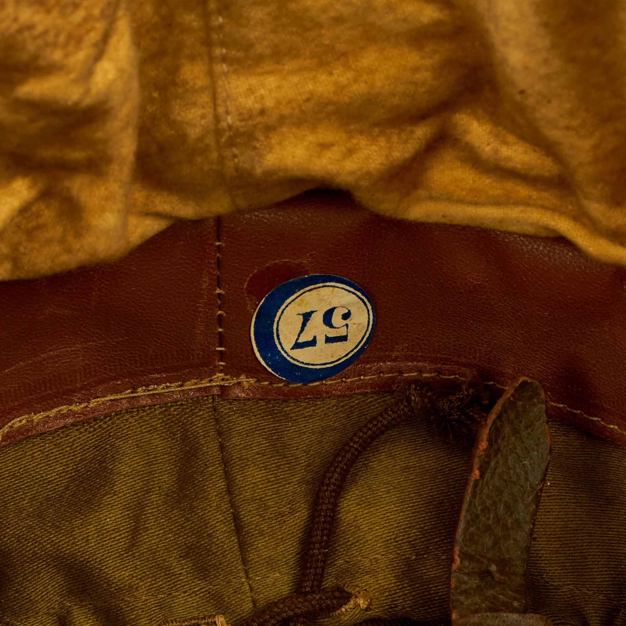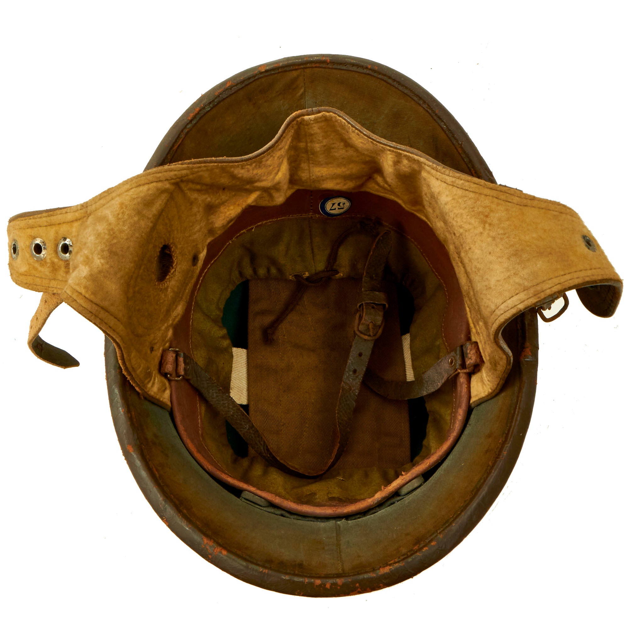 The Belgian design looks to be pretty much a more substantial version of a pith or sun helmet, made of fiber or cork and covered with fabric. In this case the fabric and leather shell has been painted with brown paint matching the color of the neck protector, and there is a stamped steel Belgian "Lion" badge on the front of the helmet. The liner is canvas and leather, with a size 57 sticker on the rear. It has both a regular chin strap as well as another that is part of the neck protector, which also has a snap attachment. This helmet must have been secure indeed when completely fastened!