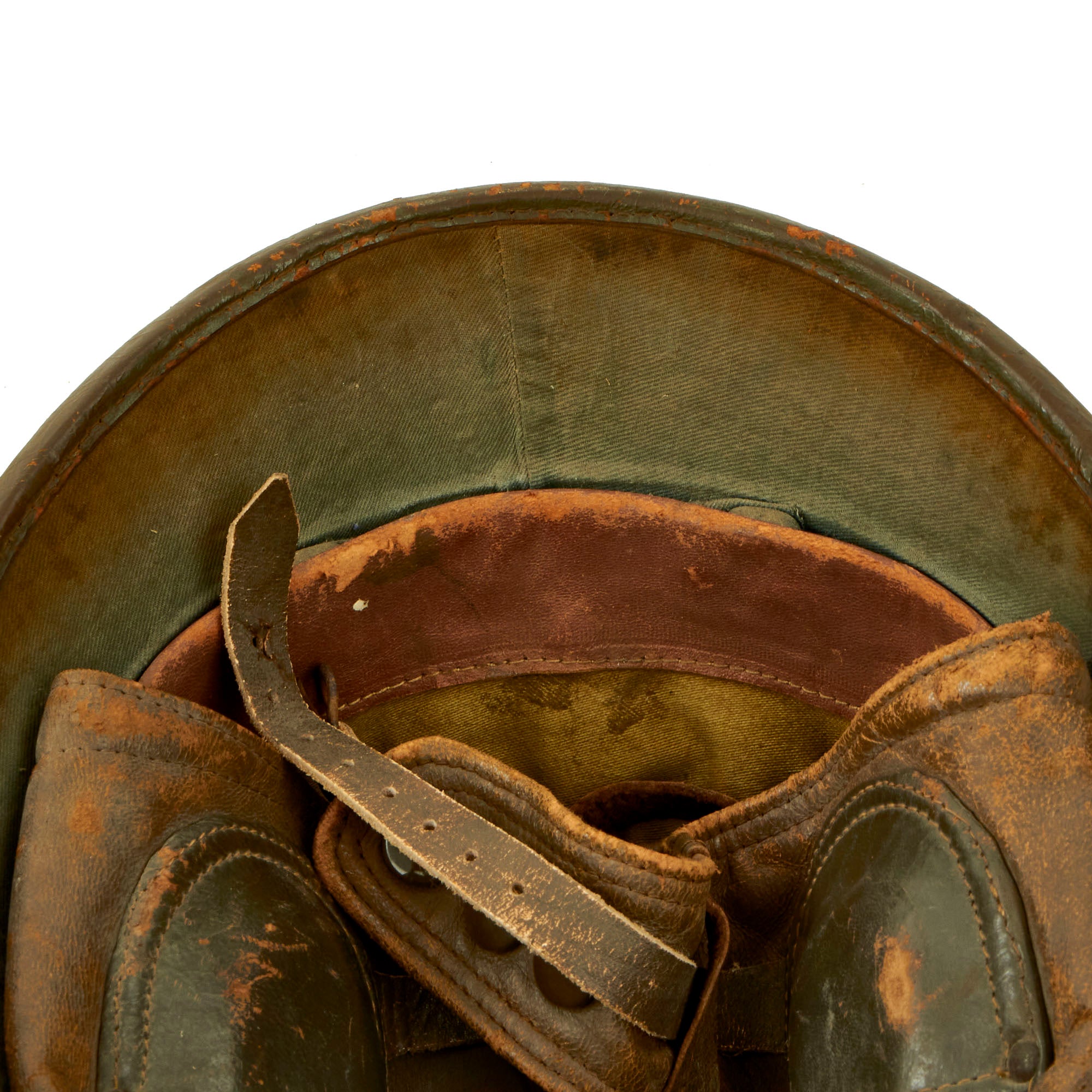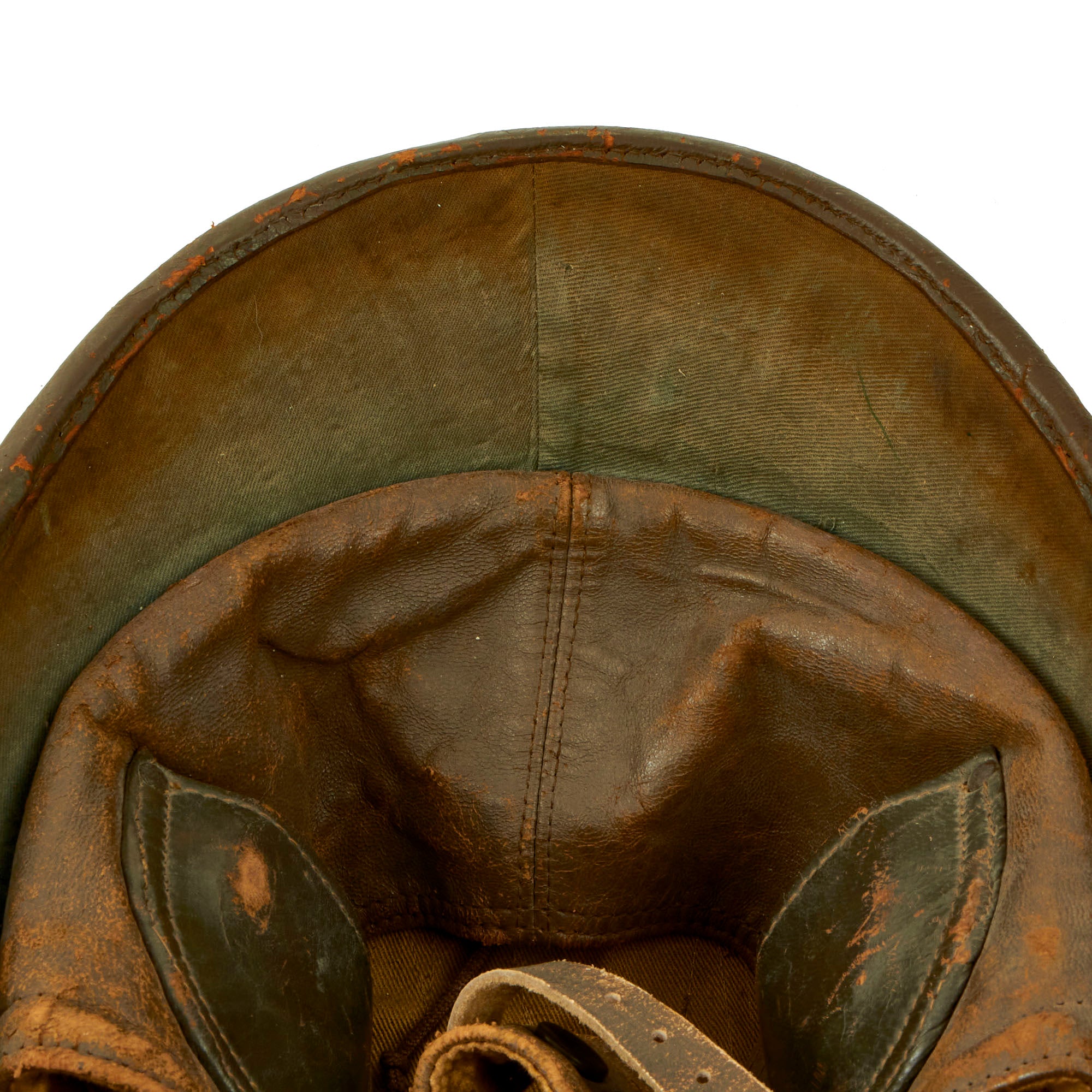 Overall condition is very good, showing the expected wear from age and use. There is some deterioration to the leather of the standard chin strap, while the other leather components are still in very good shape. A great example of a hard to find WWII helmet!