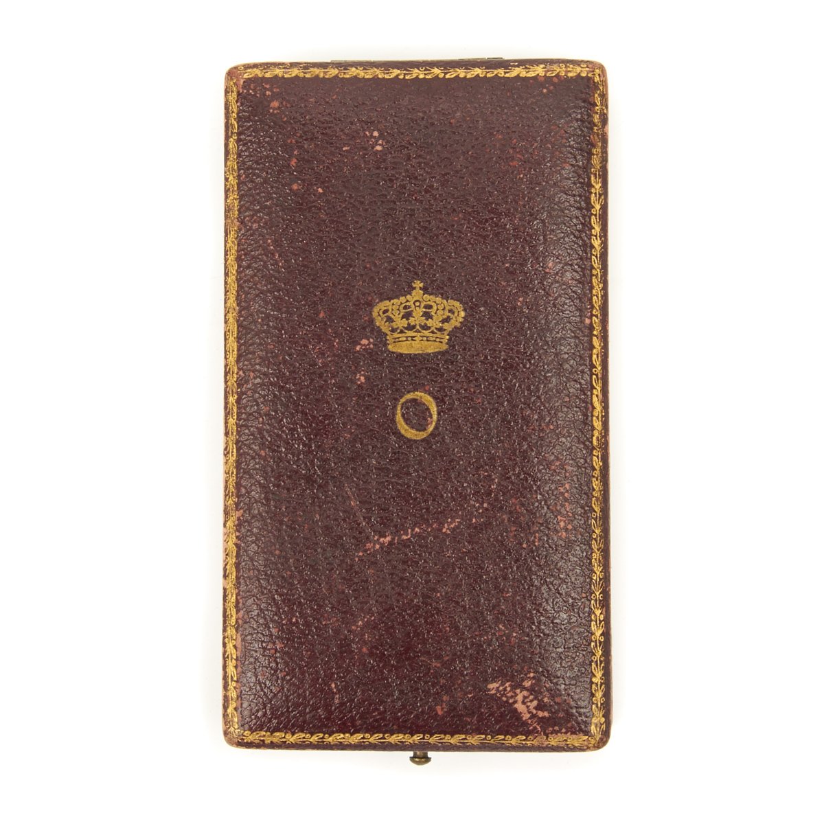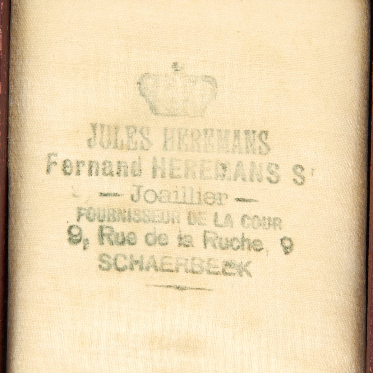 This example with "Gold" gilt and enamel in very good condition also has its original case that is maker marked "JULES HEREMANS Sr SCHAERBEEK" on the inside lid, velvet medal bed, light wear on the exterior, case near extremely fine.