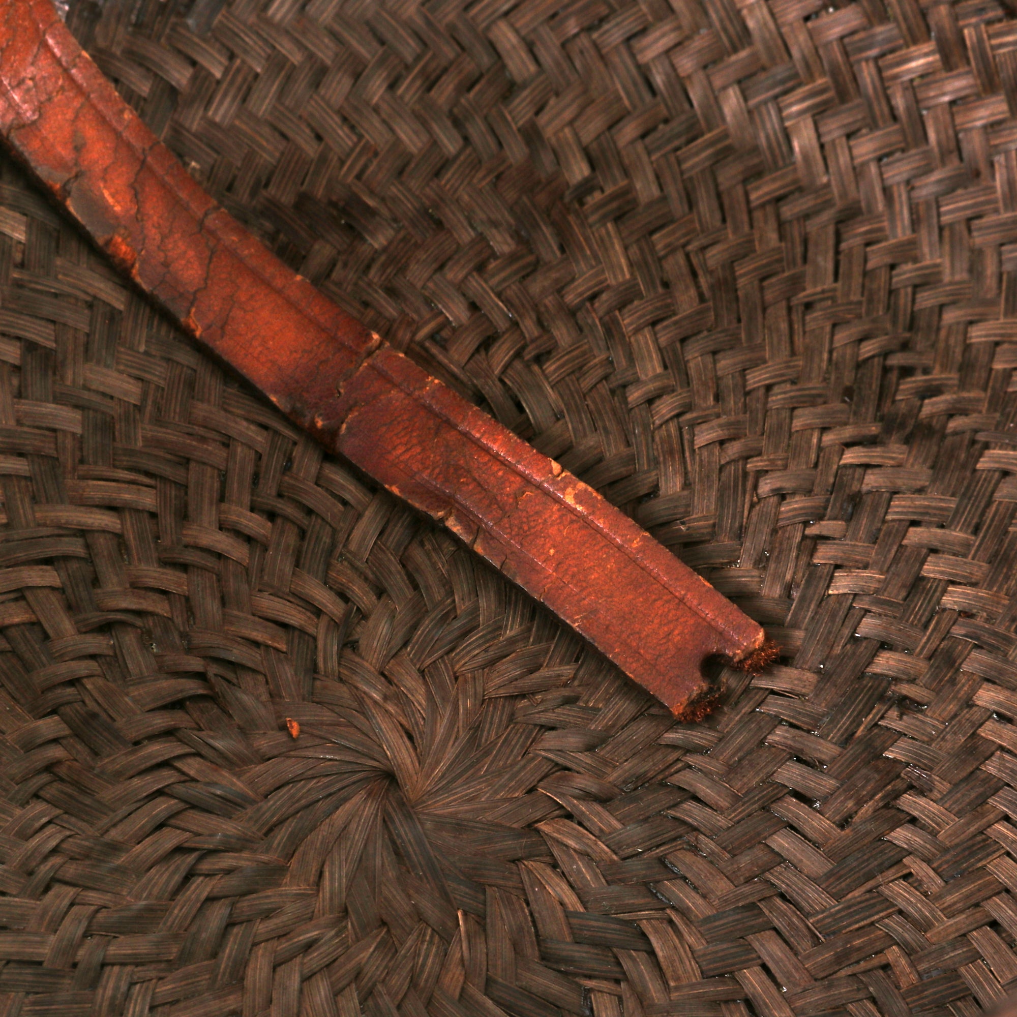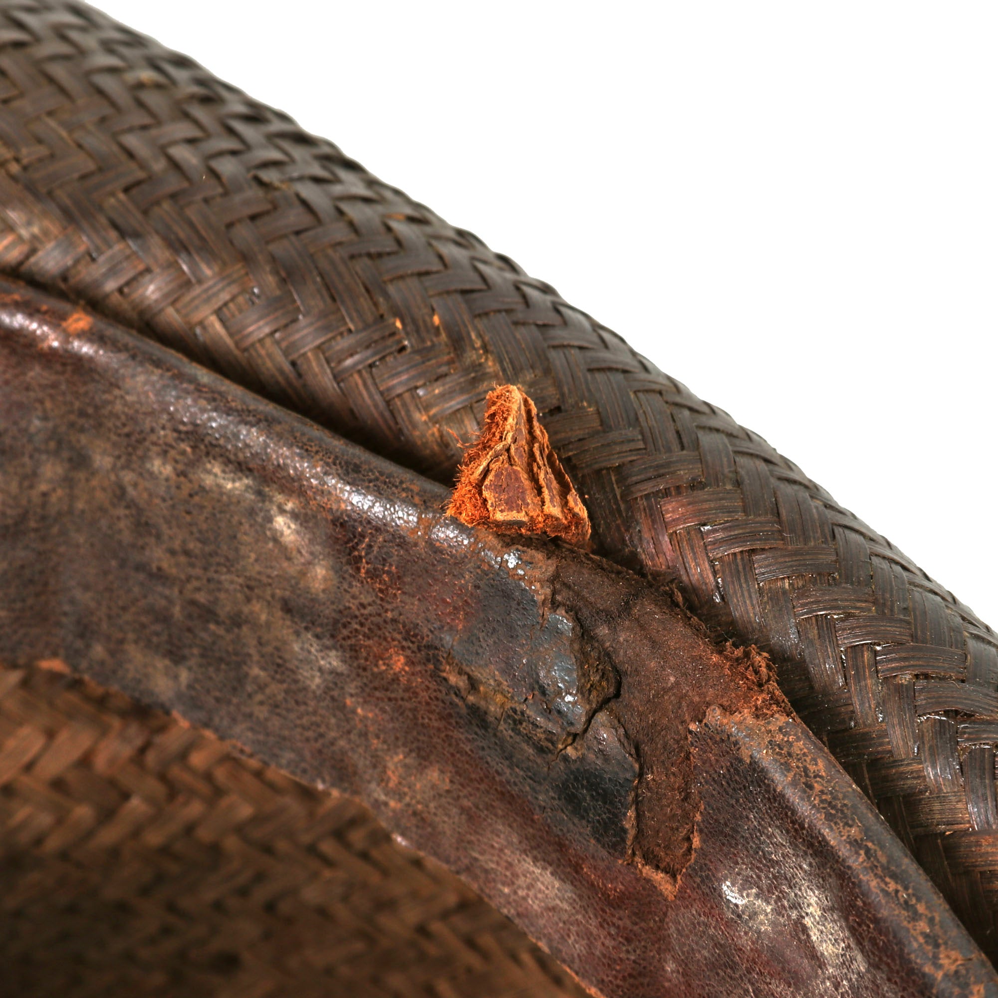 The hat is of a very large size, but due to the aging of the material, it has no pliability. There are two metal grommet vents on each side, with both slouches affixed with a cockade and small leather washer under it. The brim of the hat is very well-retained. The interior is in good condition with the real leather sweatband entirely retained but very worn. The chinstrap has broken off of one side and now hangs as shown.