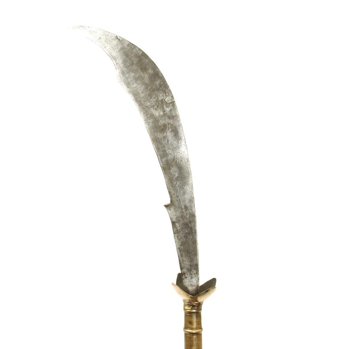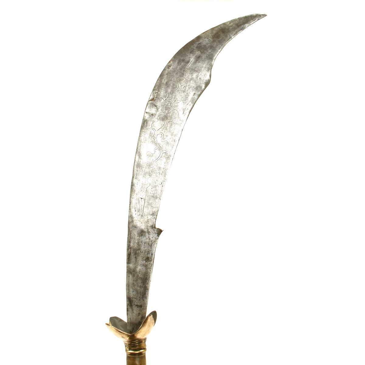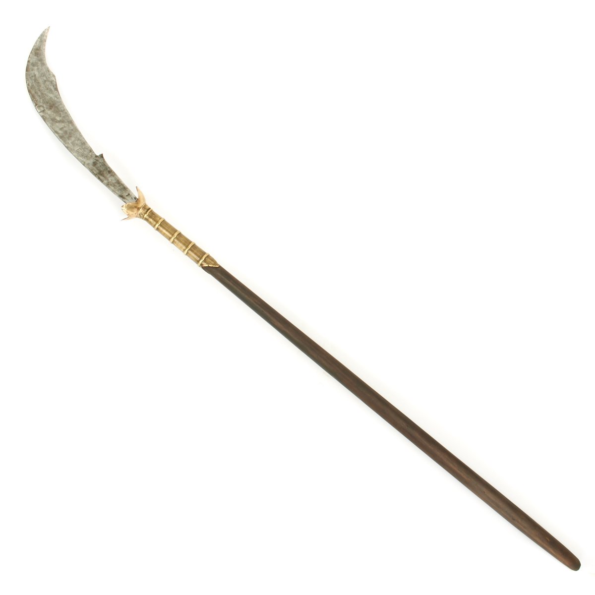 We recently acquired a small collection of Boxer Rebellion items. This is example is a typical Boxer Rebellion era Pole Arm known as a GUANDAO. Although of similar design no two were identical. This example measures 67" in height which includes the 28 blade. The wood shaft measures 39, having been shortened, most likely before transit to the West.