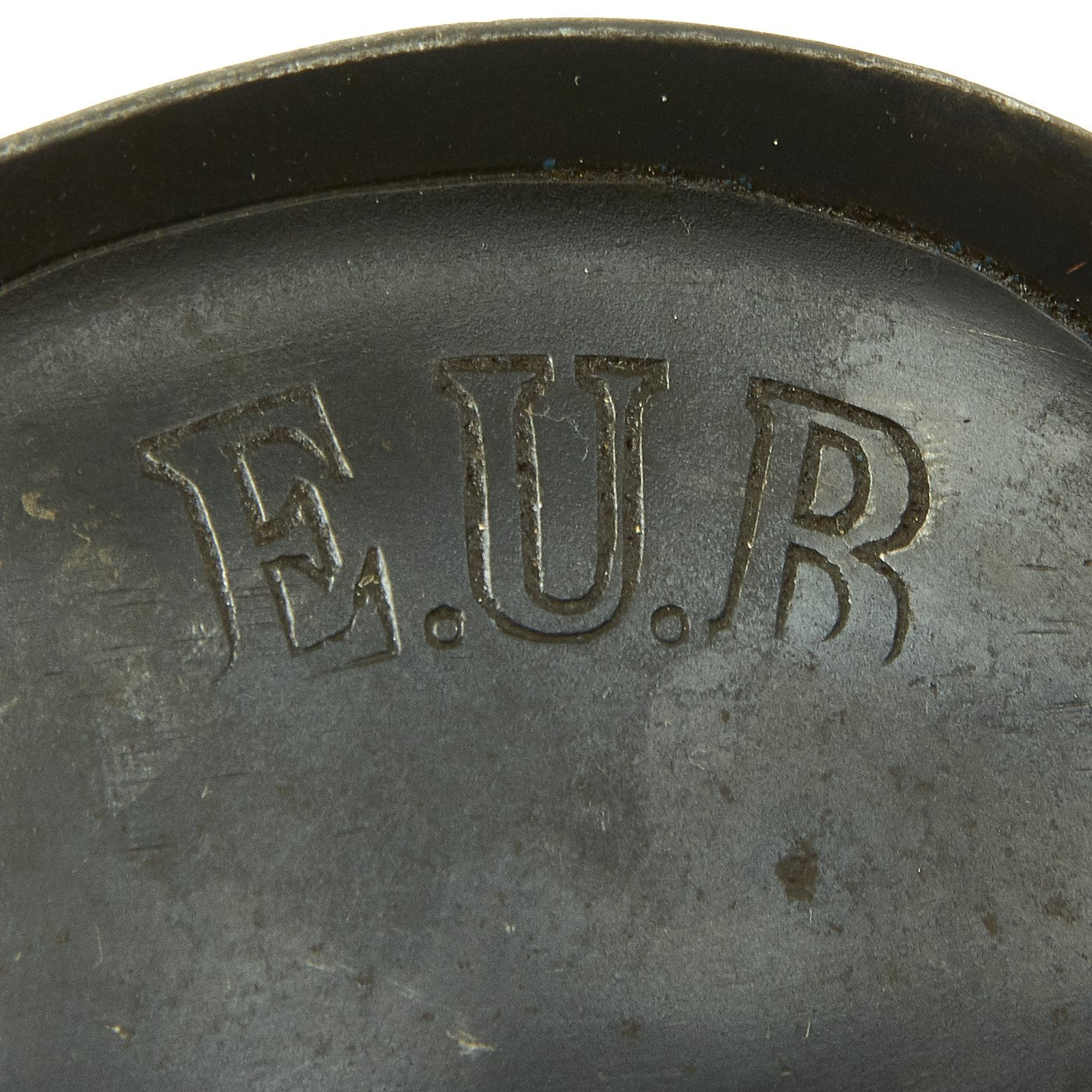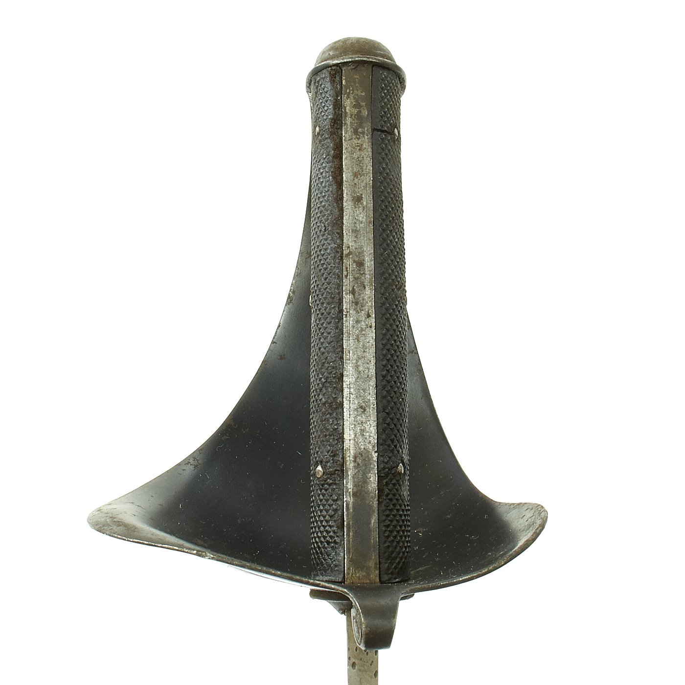 The blade surface is clean and bright, without pitting and is unsharpened, displaying only a tiny bit of staining along its 31 1/2 inch length, and has the correct M proof mark on the spine. The cupped steel guard is marked with the letters E.U.B. for Estados Unidos Brasil (United States of Brazil), and early name for the country. The hilt has pressed black leather grips secured with five steel rivets, with a crack in one side near the lower double rivets, which is commonly seen on these. Overall length of the sword is 37 1/2 inches.