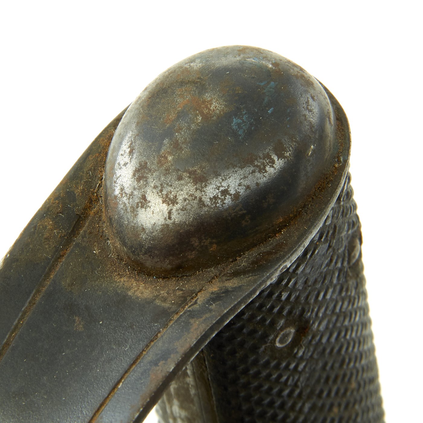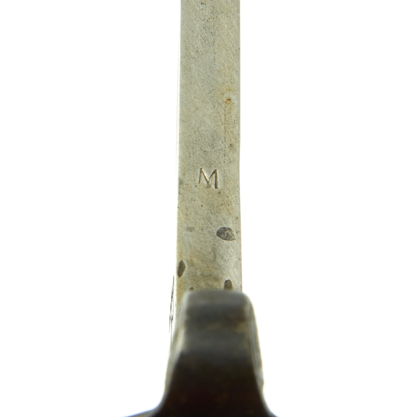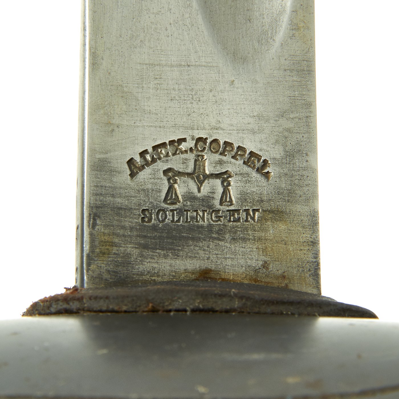 The blade ricasso is maker marked ALEX. COPPEL / SOLINGEN, indicating manufacture by Alexander Coppel & Co. located in the legendary "City of Blades", Solingen. This company made large amounts of export bayonets during the 19th century, and also manufactured bayonets for many years and up through WWII under the name Alcoso. Sadly, as the Coppel family was Jewish, they saw their company stolen from them and "Aryanized" during WWII by the NSDAP.