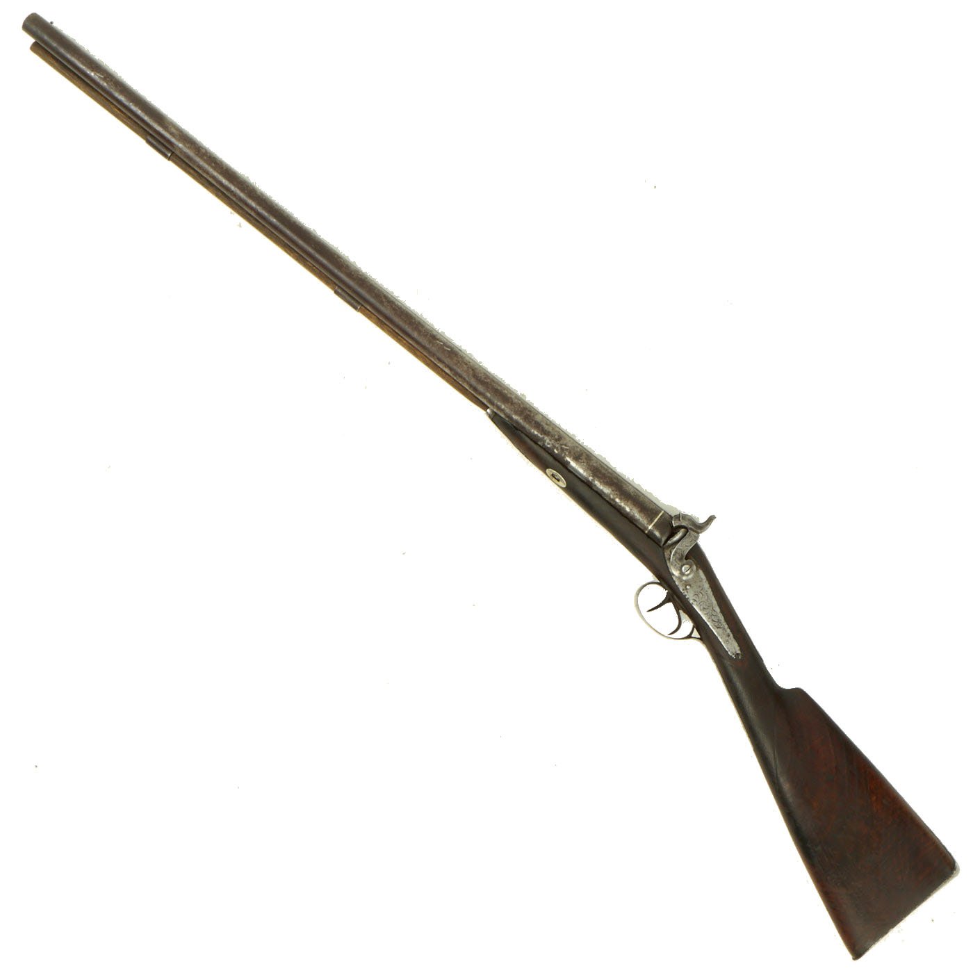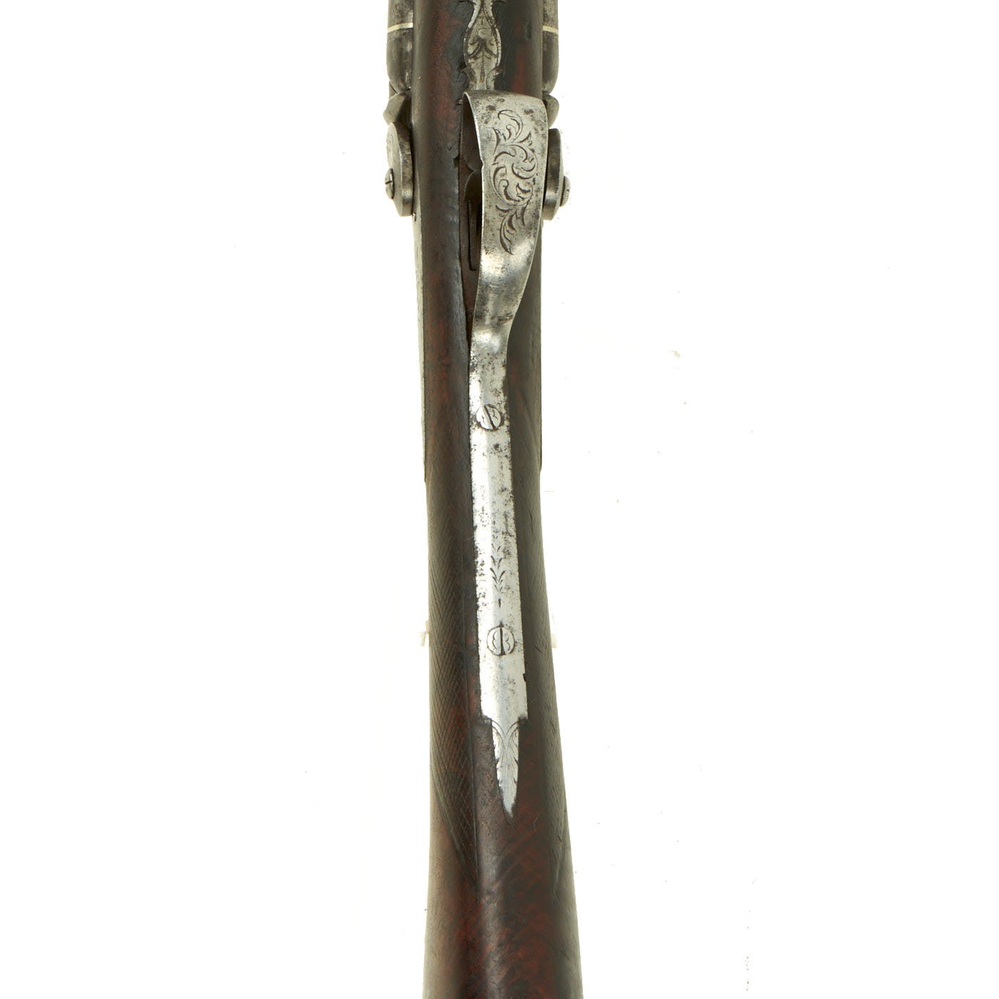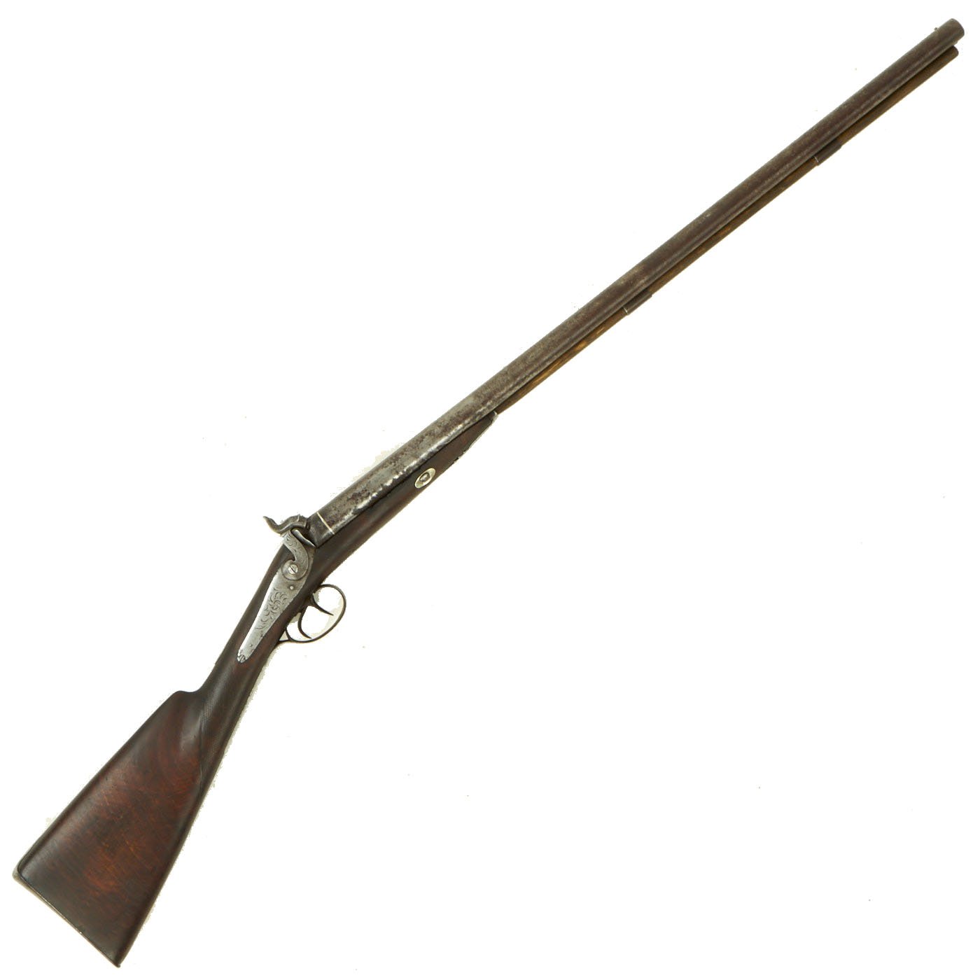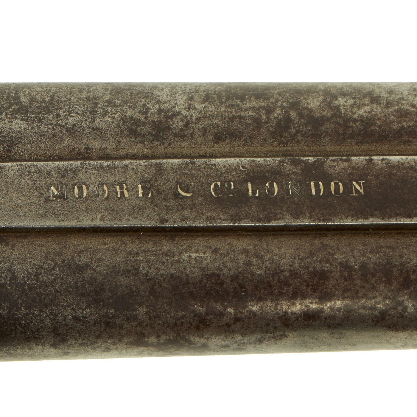 Original Item: Only One Available. Here we have a very nice British Double Barrel percussion shotgun, in what looks to be 12 bore, a very popular size then. It is fitted with a 30" double barrels and measures 45 1/2" in overall length. There is light engraving on both locks and most of the metalwork. The breech of the barrel is decorated with some silver inlay, and forward of this is a faint silver inlay reading MOORE & CO. LONDON.