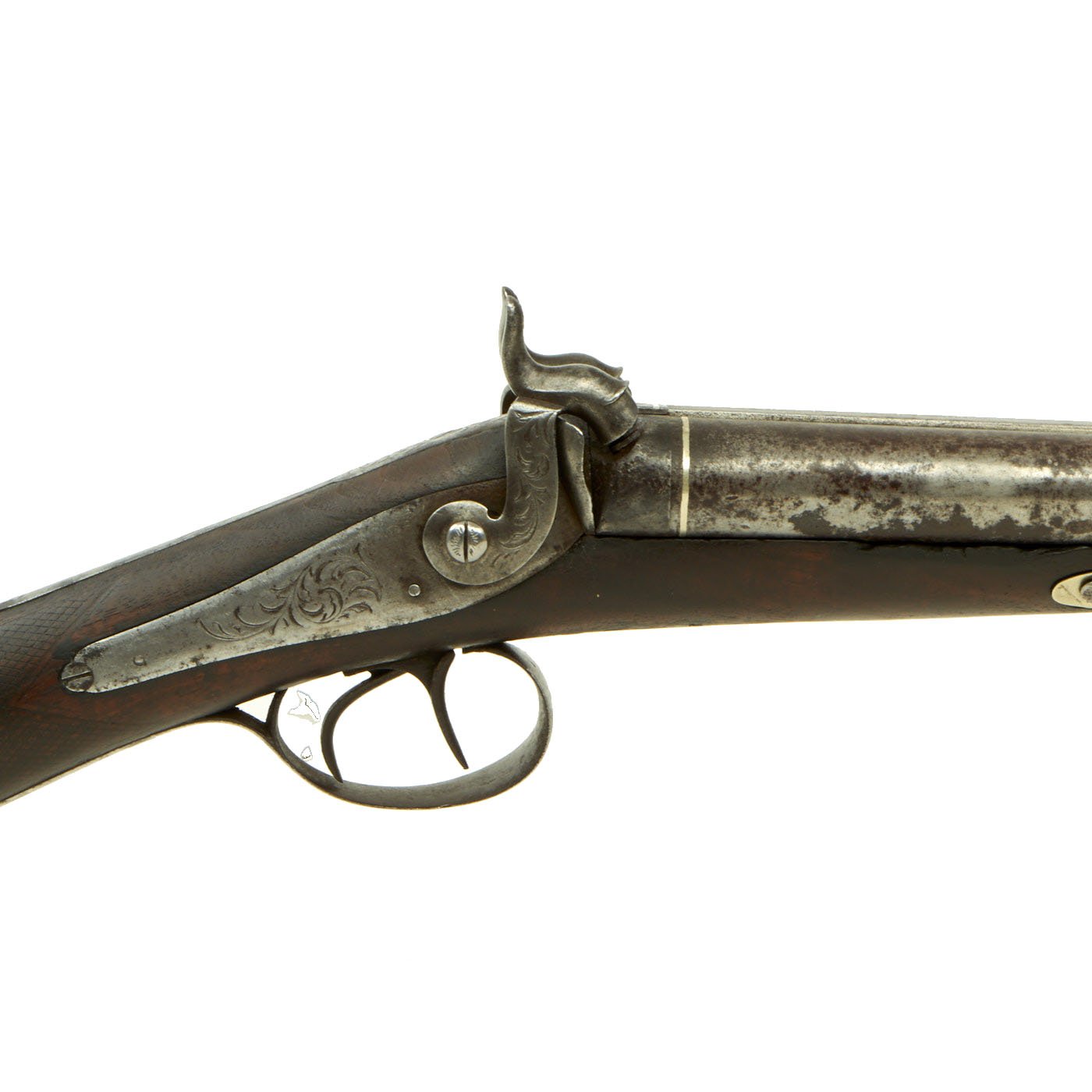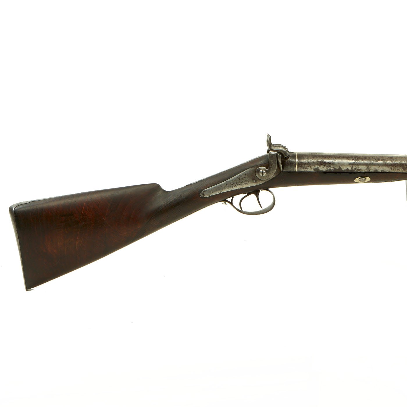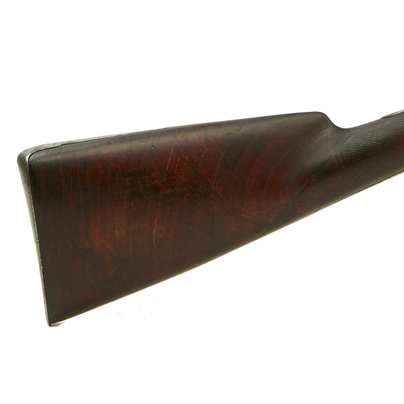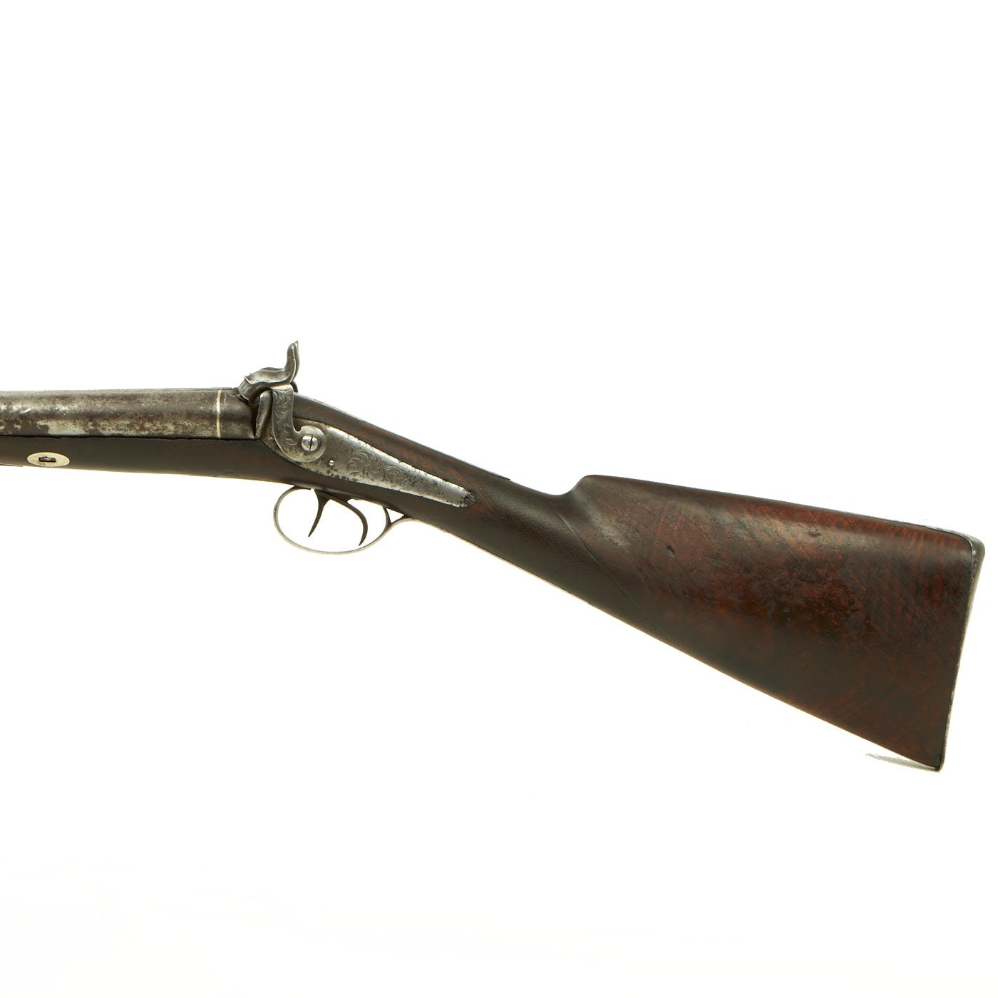 Original Item: Only One Available. Here we have a very nice British Double Barrel percussion shotgun, in what looks to be 12 bore, a very popular size then. It is fitted with a 30" double barrels and measures 45 1/2" in overall length. There is light engraving on both locks and most of the metalwork. The breech of the barrel is decorated with some silver inlay, and forward of this is a faint silver inlay reading MOORE & CO. LONDON.
