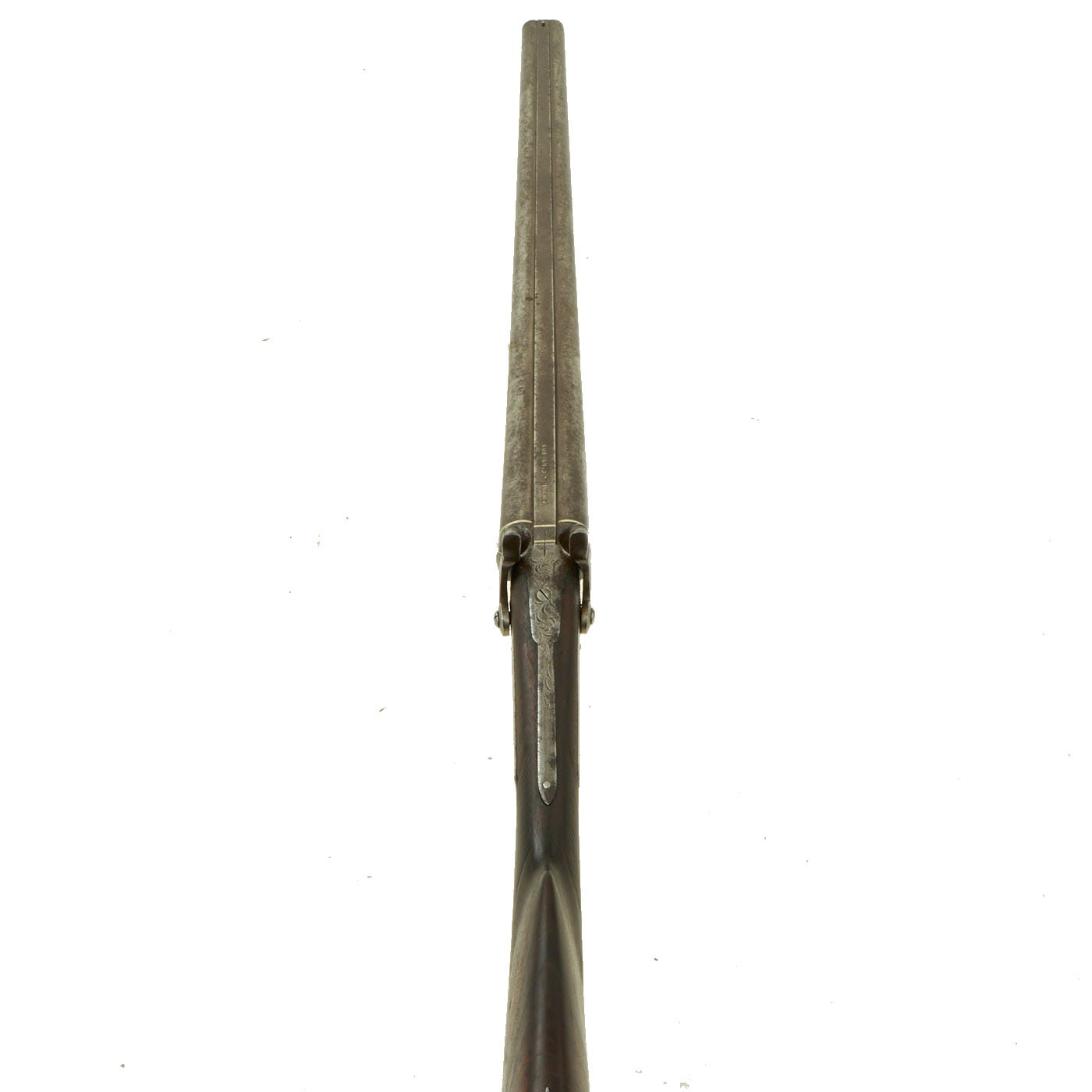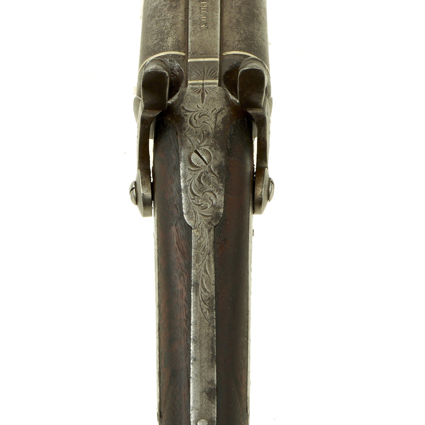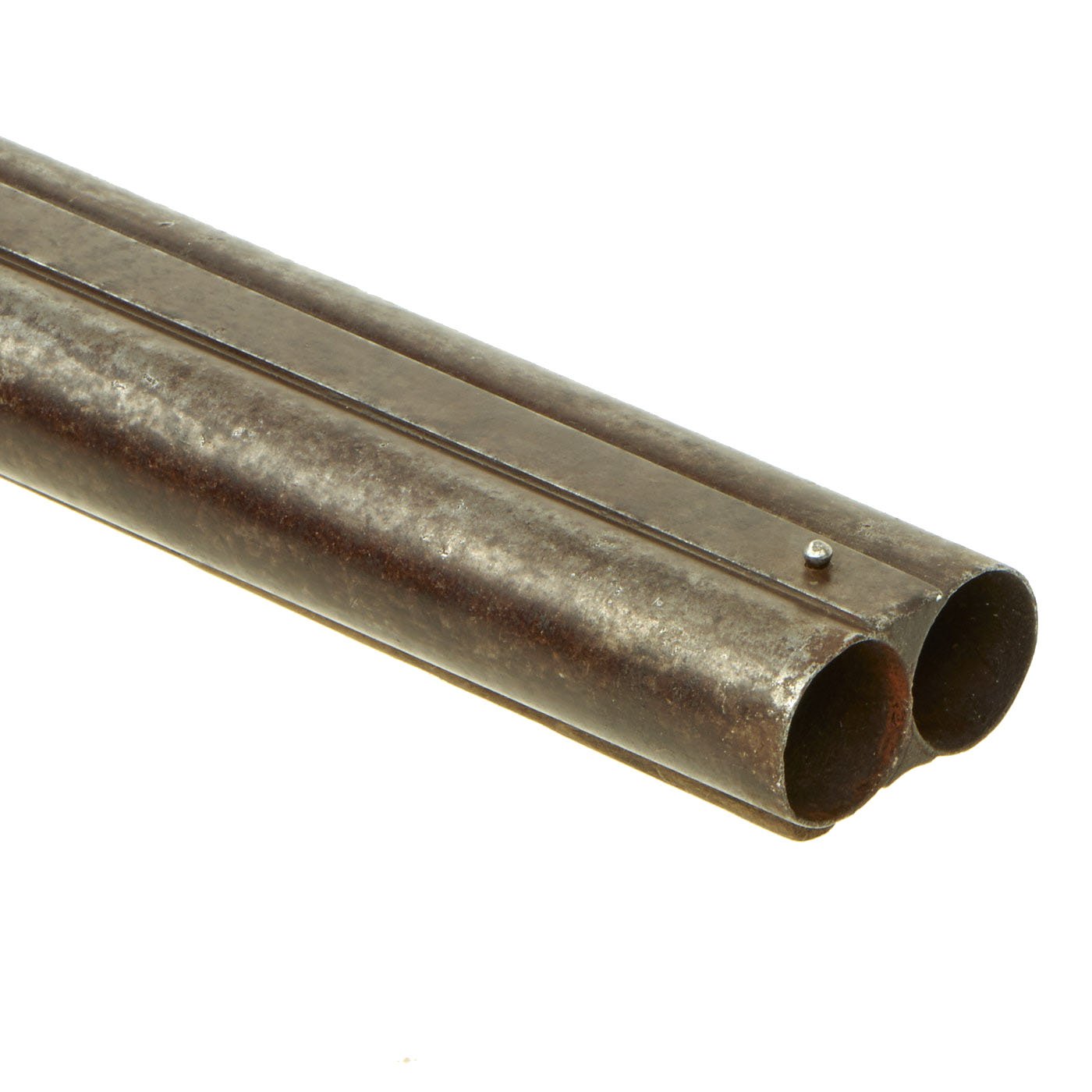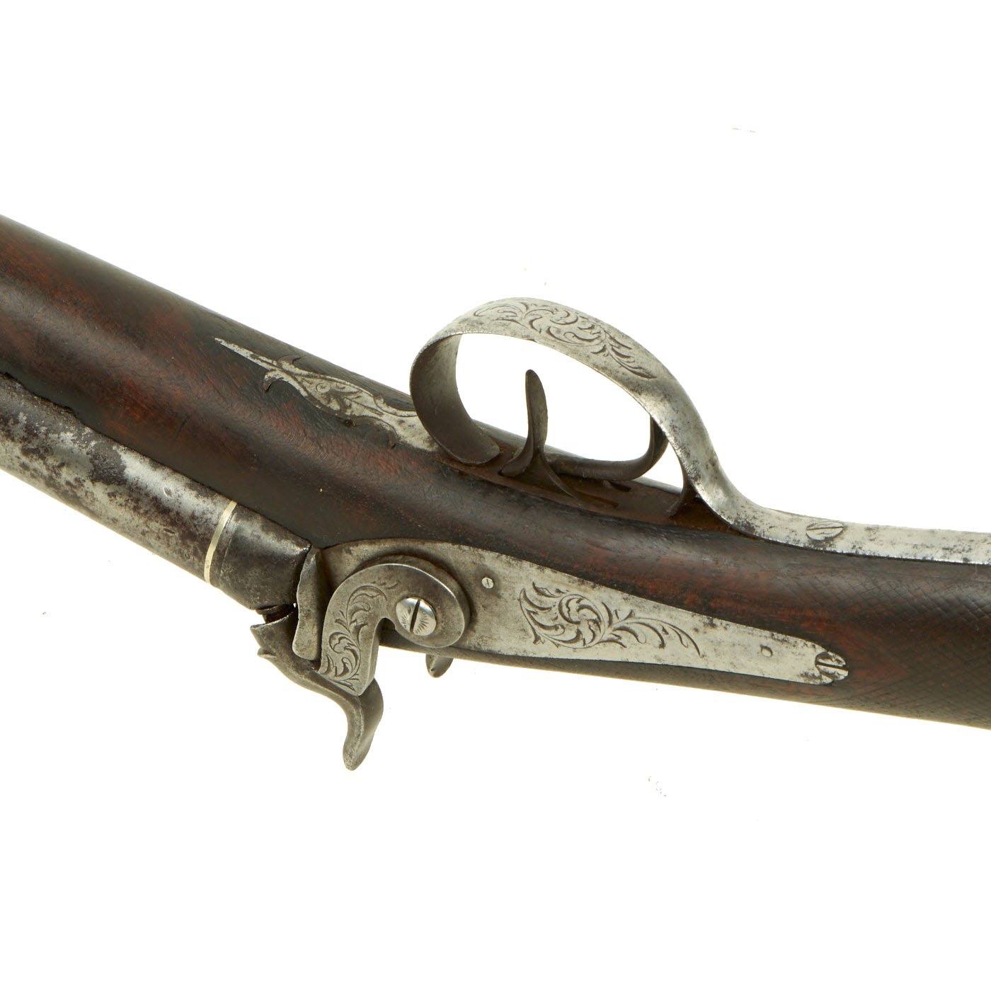 Original Item: Only One Available. Here we have a very nice British Double Barrel percussion shotgun, in what looks to be 12 bore, a very popular size then. It is fitted with a 30" double barrels and measures 45 1/2" in overall length. There is light engraving on both locks and most of the metalwork. The breech of the barrel is decorated with some silver inlay, and forward of this is a faint silver inlay reading MOORE & CO. LONDON.