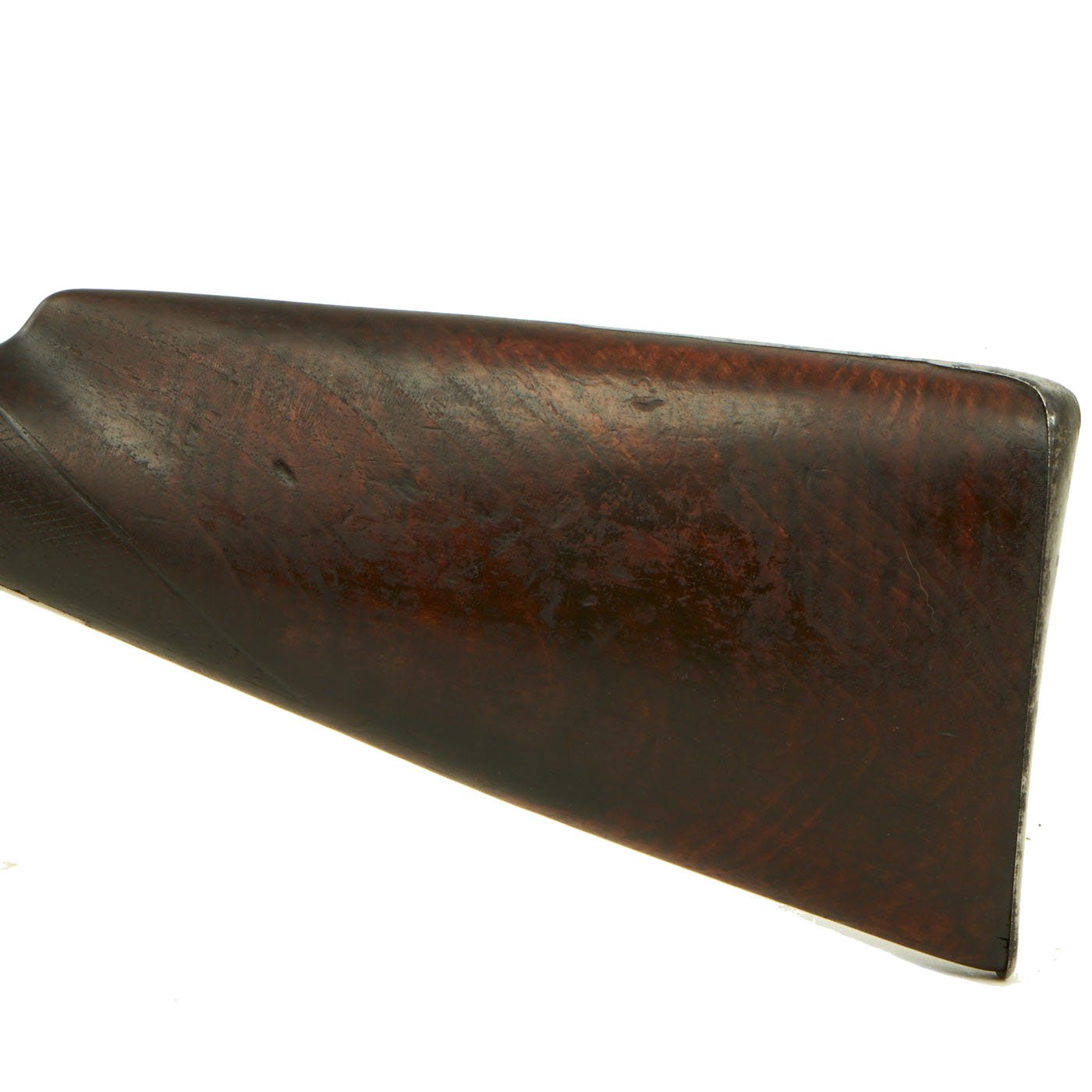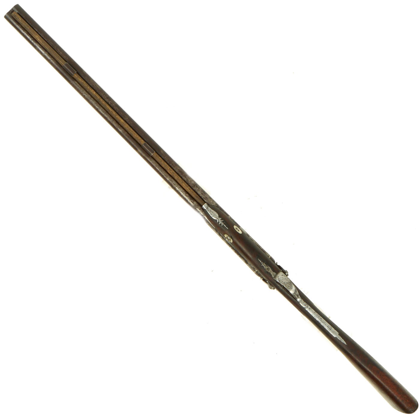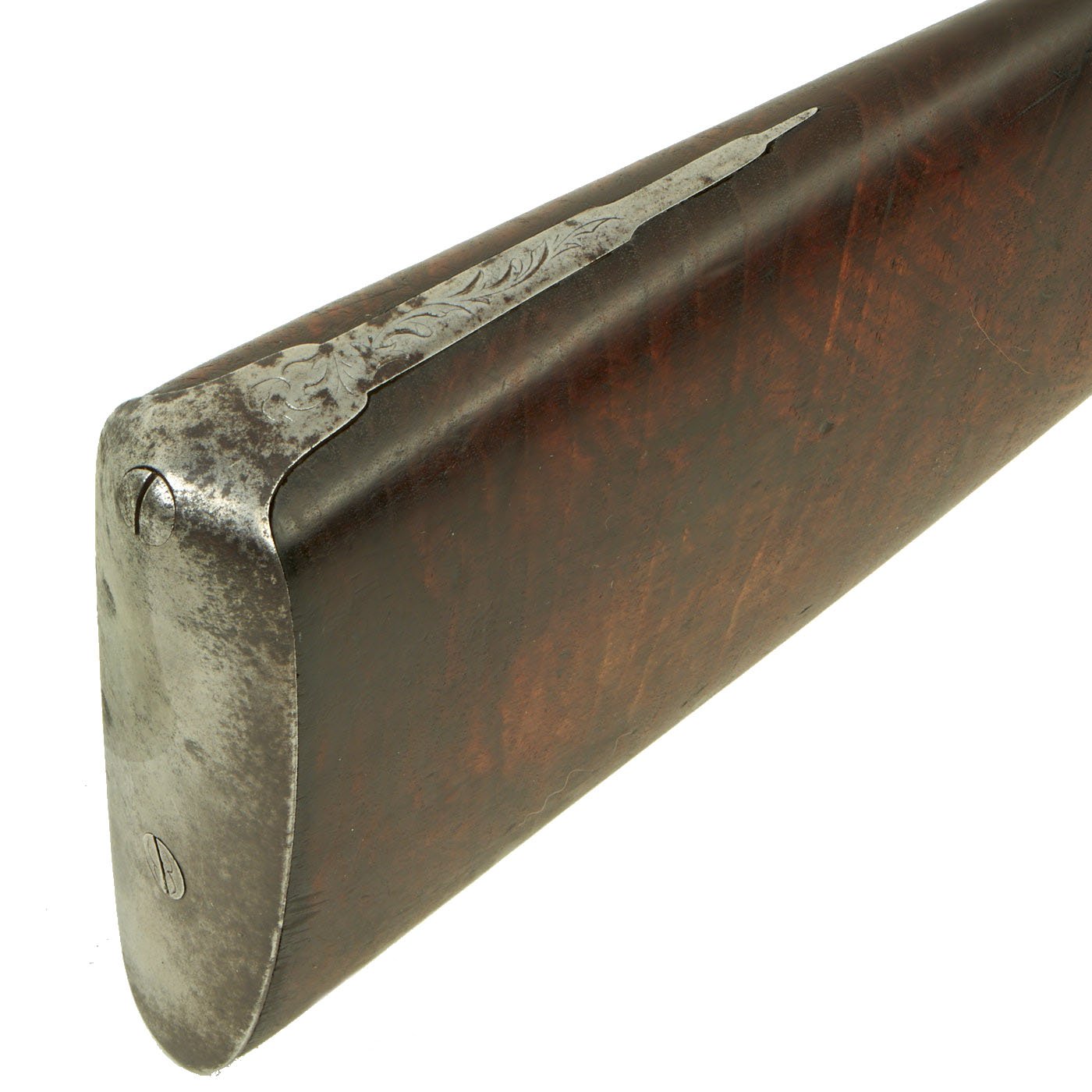 The locks both function however neither will hold correctly at half cock. Both cap nipples are present, but worn, and we have not checked to see if they are clear. The wood stock is in very good condition, with no major cracking or damage that we can see. There is some lovely figuring to the wood in the butt stock area, and there is still checkering present on the wrist, though it is now worn and somewhat faint. The original ramrod is unfortunately missing, now replaced with a stained wooden dowel.