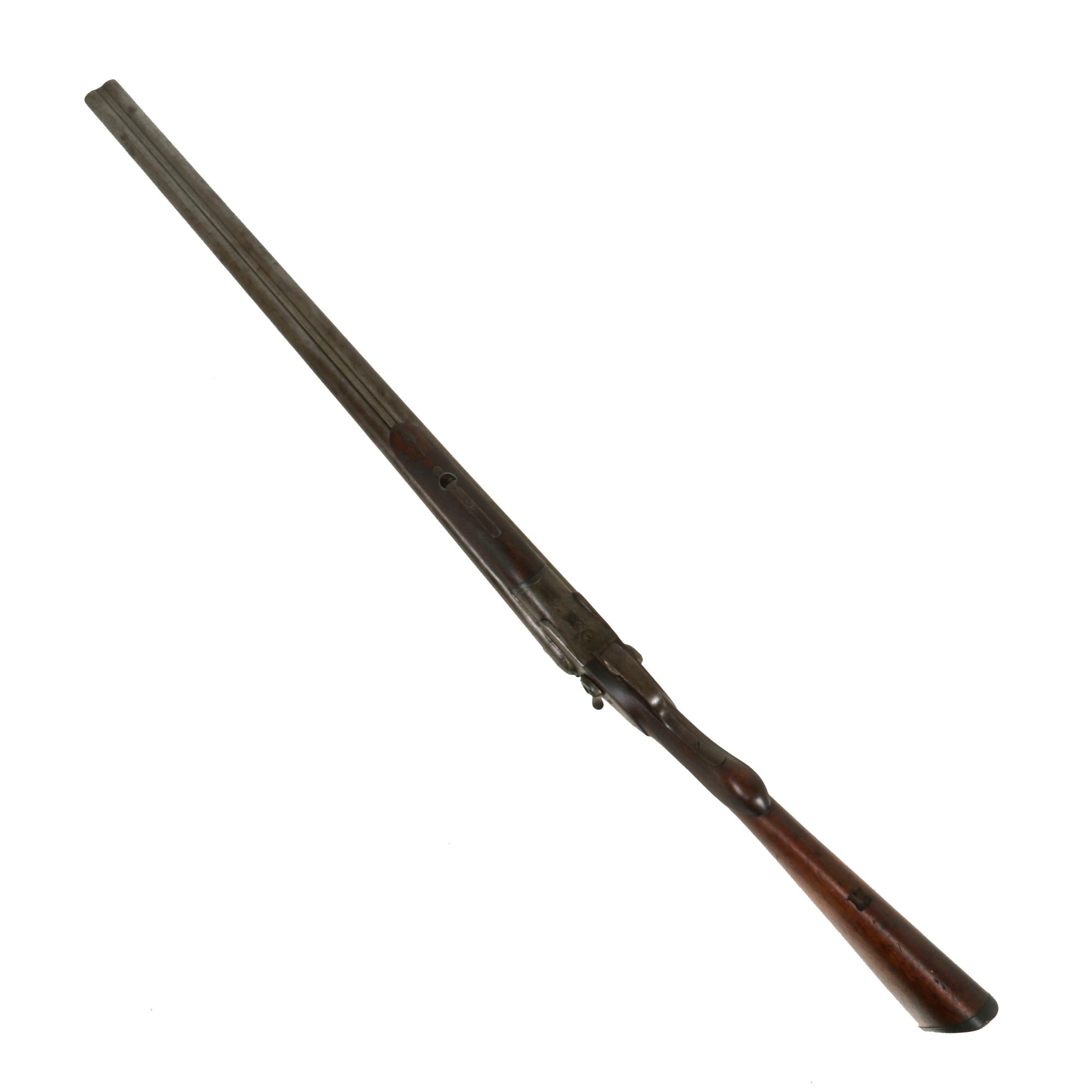 The use of a "choke" in the barrel was intended to help with the spread of shot, and came into use during the three decades or so of the 19th century. The shotgun is also serial number marked with 18237 on the bottom of both barrels, on the fitting for the fore stock, and on the receiver "table" inside the hinge joint, so no parts have been lost or swapped out over the years.
