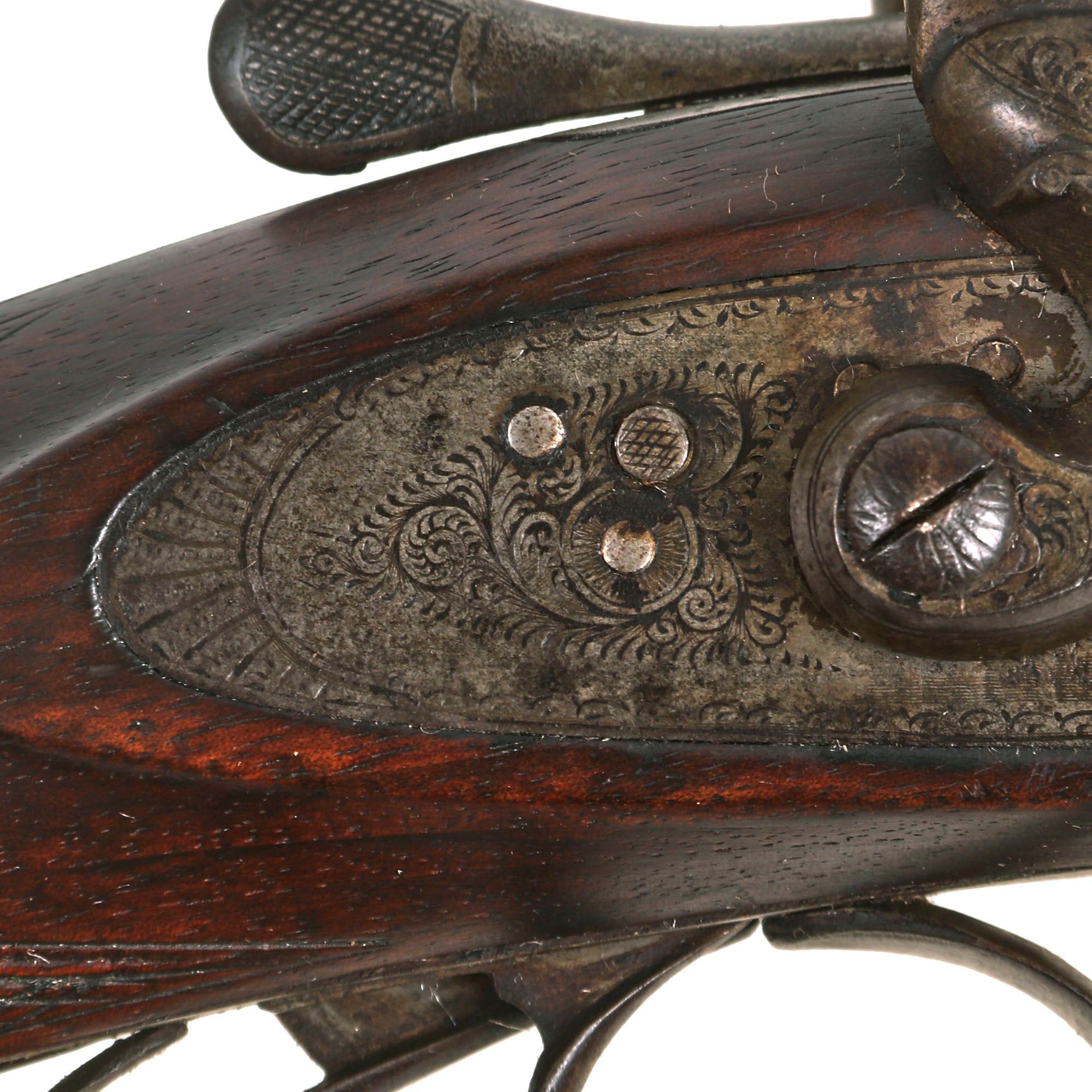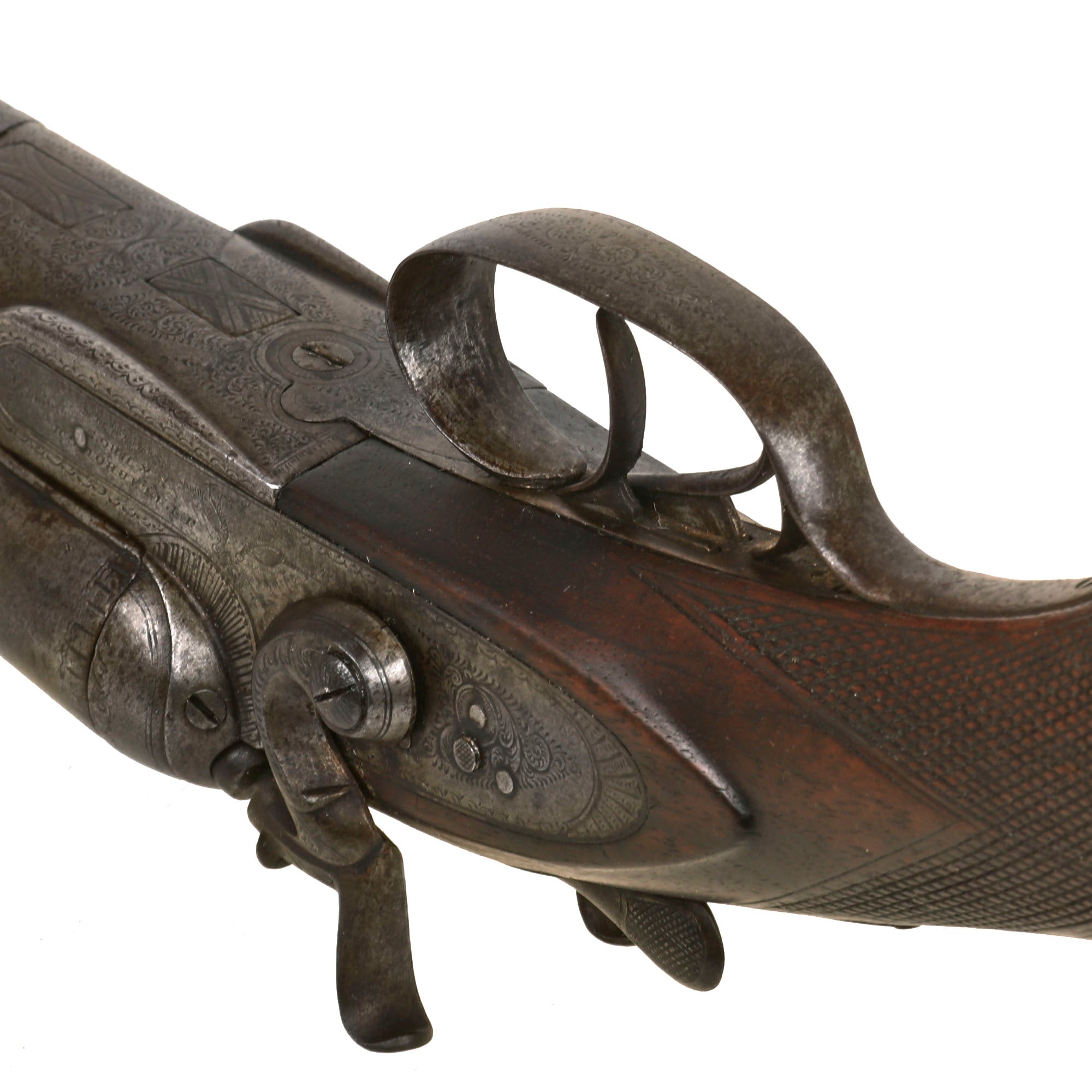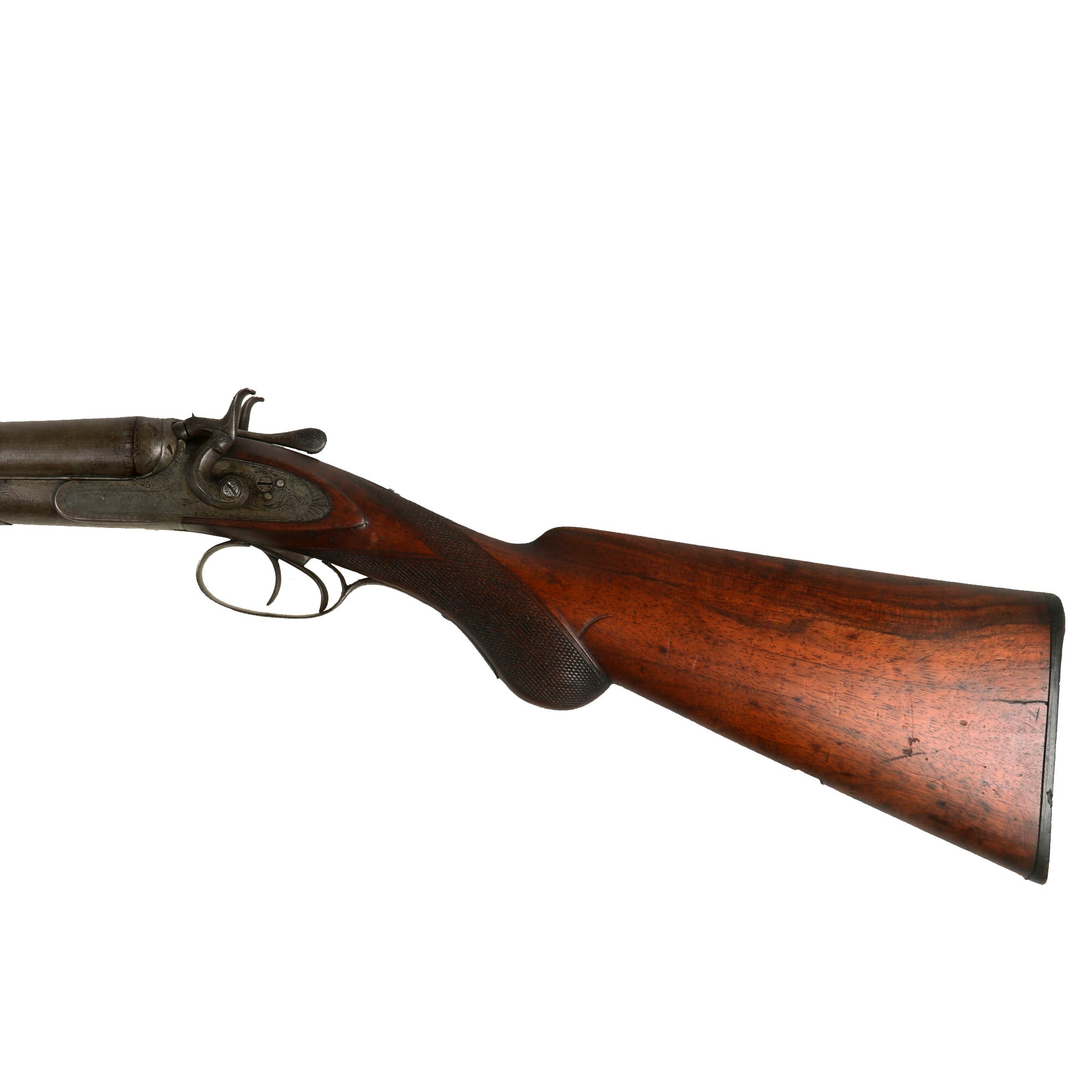 This lovely upmarket DOUBLE BARREL 12 gauge Hammer Shotgun presents very nicely, with a lovely patina of age, showing much handling and probably moderate use. It is all iron mounted, and features lovely ornate engraving on almost all of the hardware, particularly the frame and side action locks. The original finish has faded, and there is a bit of wear on the engraving, but it still looks great. It has a great checkered "pistol grip" style butt stock, and the fore stock is checkered as well. Originally intended for hunting and home defense these saw a lot of use on the Frontier and were supplied to both Stage Coach Lines and Railroads.