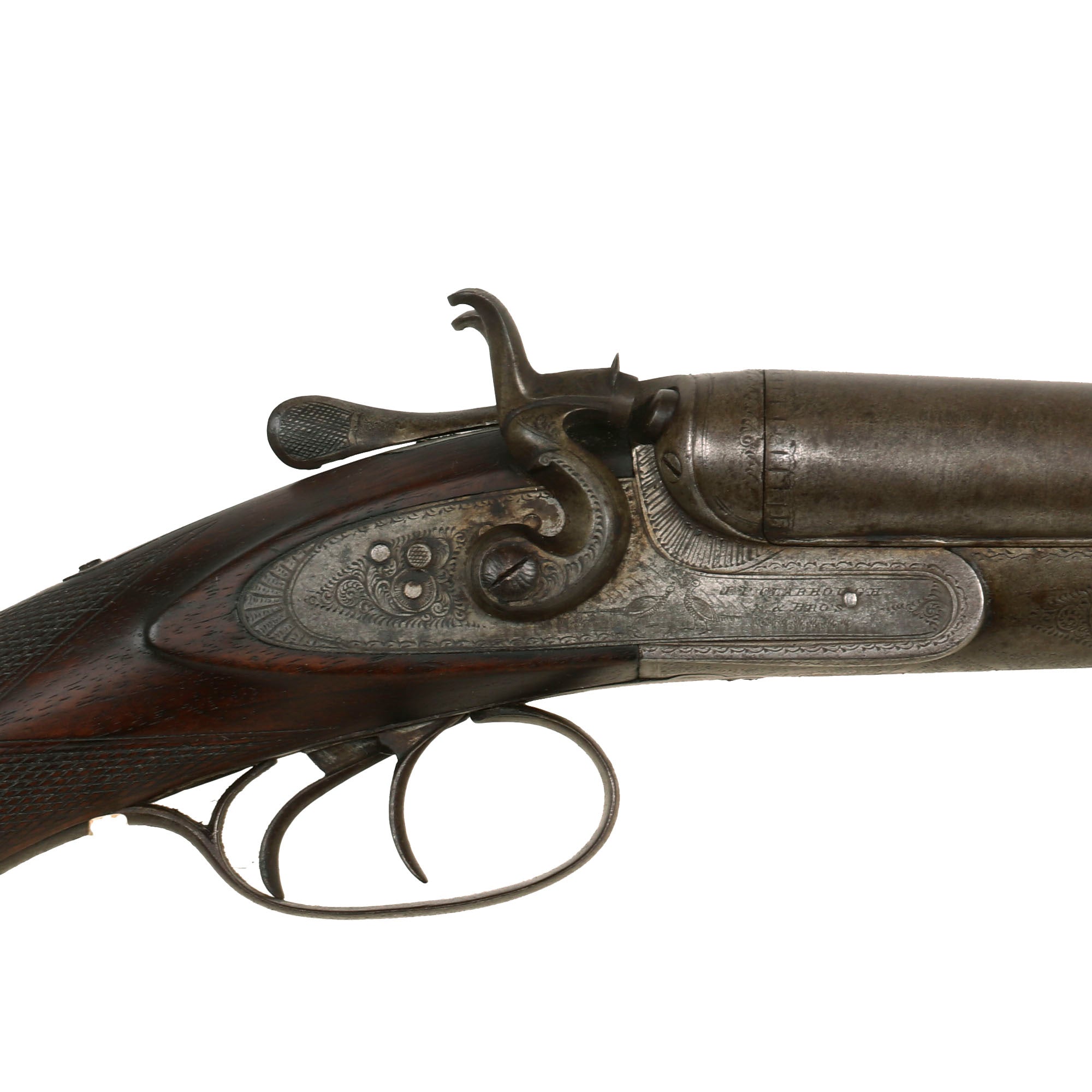Original Item: Only One Available. Here we have a very nice upmarket British-made Double Barreled Hammer shotgun, probably intended for the large U.S. import market. It is marked on banners on both lock plates with J.P. CLABROUGH & BRO'S, a large producer and importer of British firearms from Birmingham, England, with addresses in San Francisco, California as well as London and Birmingham.