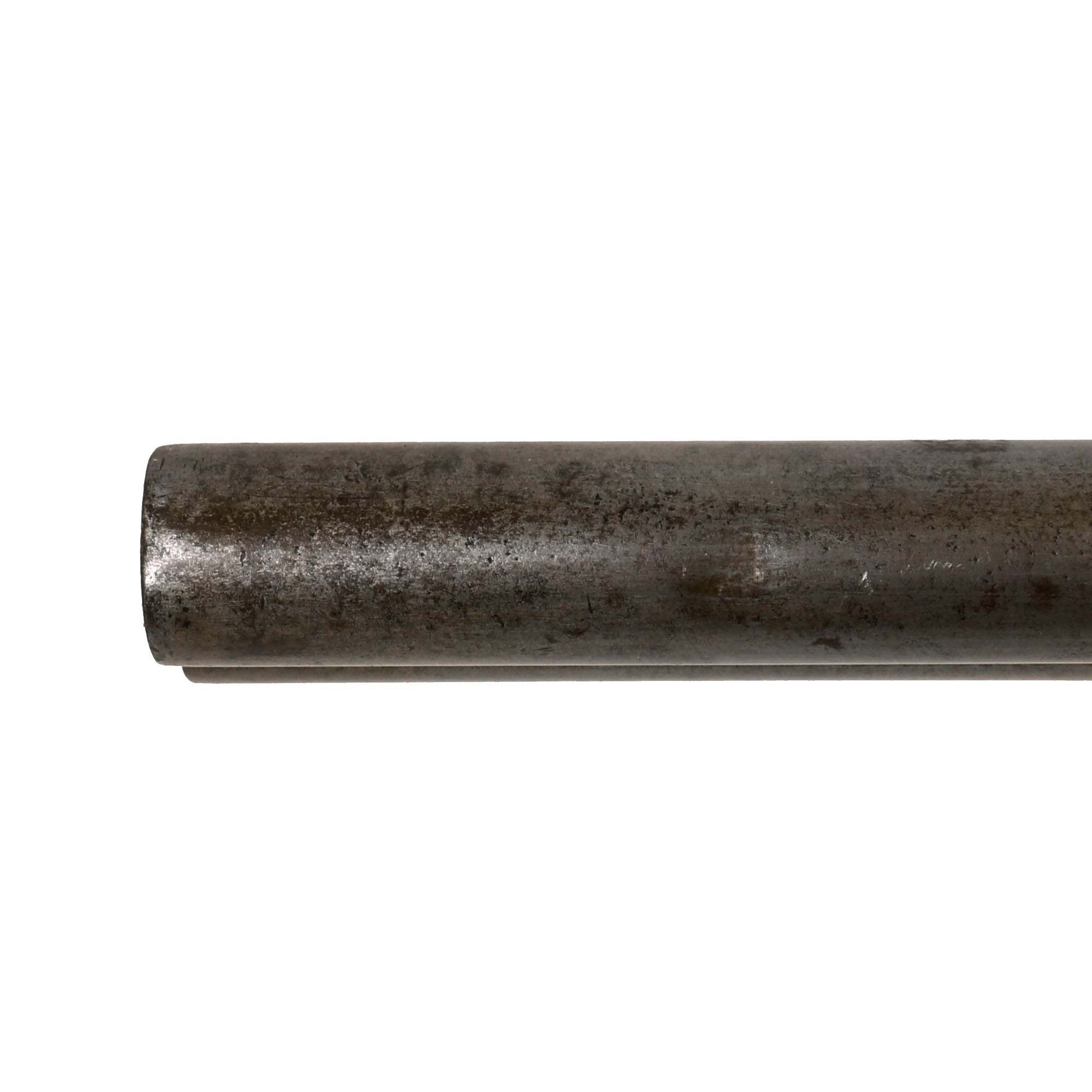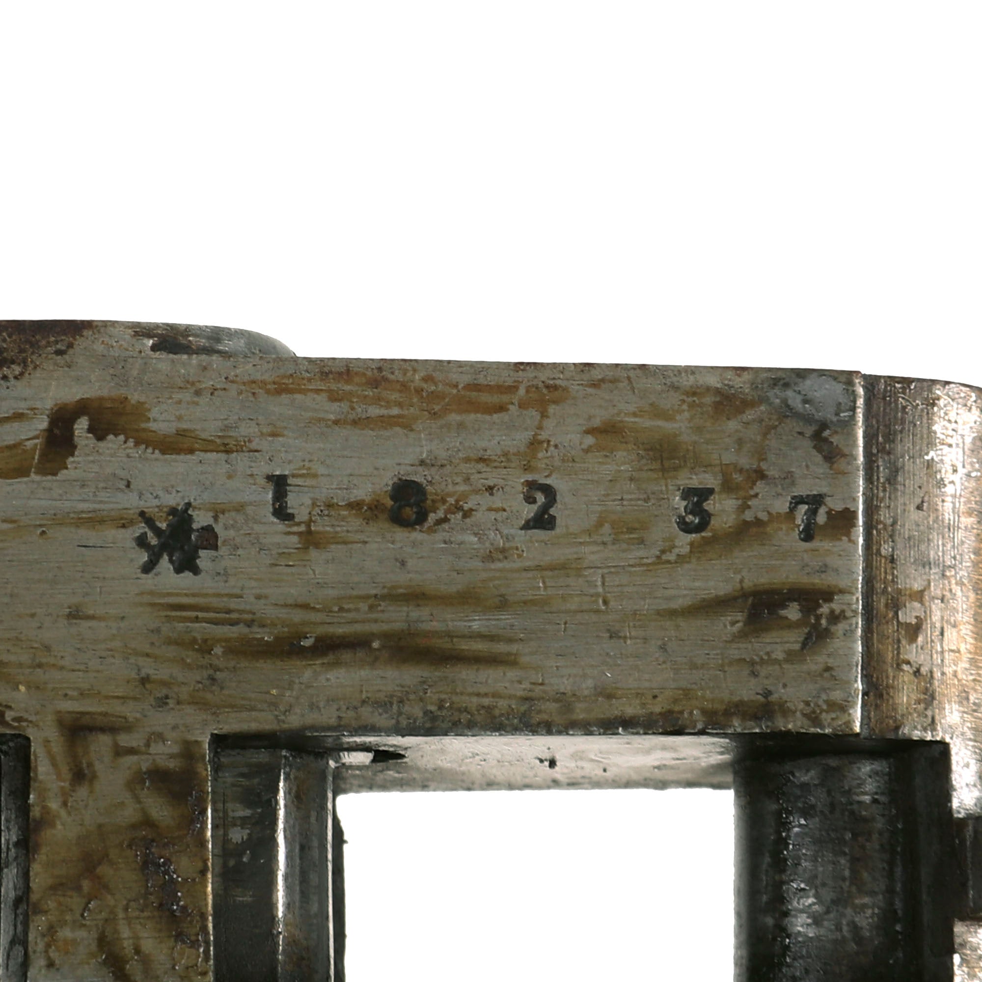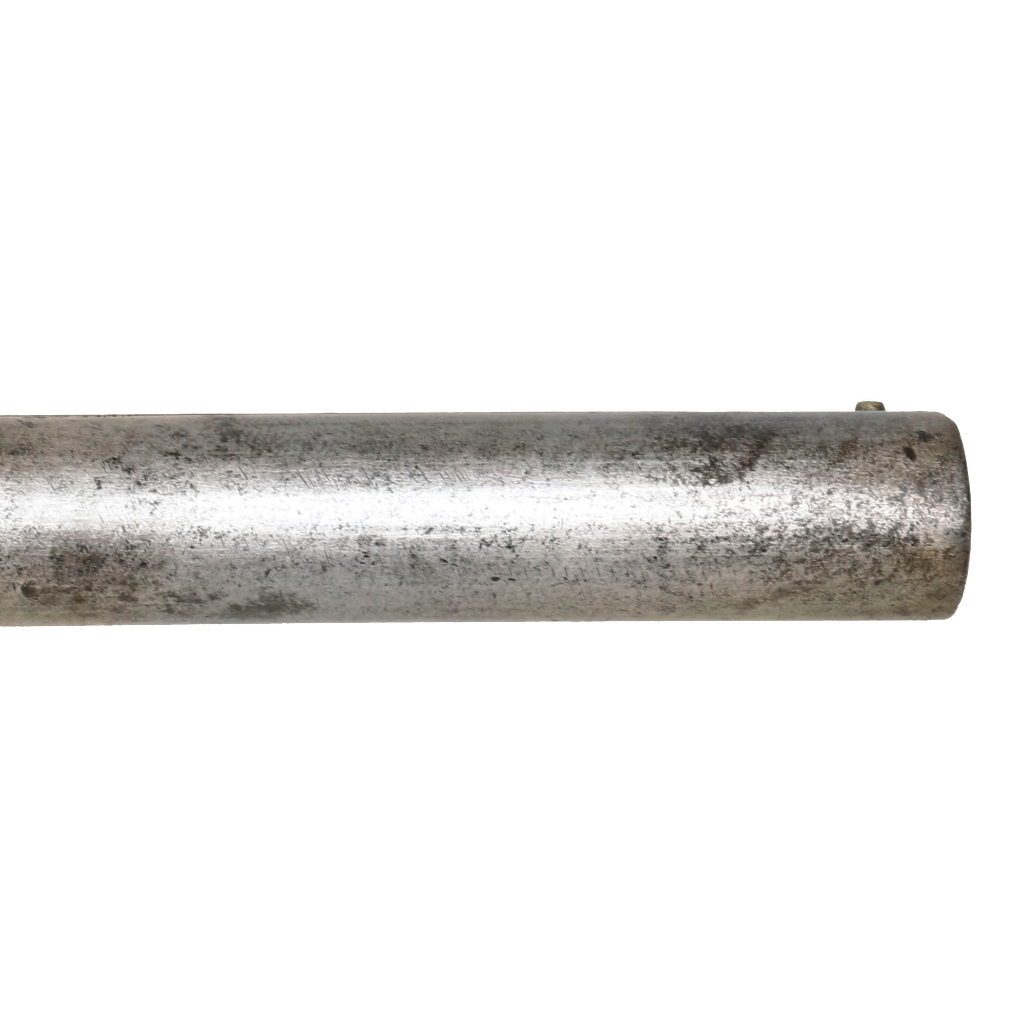 The rear stock has some lovely curl, and has a very nice hard rubber butt pad. It is really in great shape, showing very little in the way of cracking or other damage, with some wear on the checkering. There looks to have been a shield-shaped escutcheon on the bottom of the butt stock, which is now missing. The fore stock is a bit more worn, and has small chunks missing from the edge, especially near the back. It still locks correctly onto the bottom of the barrel, released by a lever on the underside. We checked the bore, and it definitely shows signs of use, with past oxidation and fouling present. There are also a few dents on the outside of the barrel.