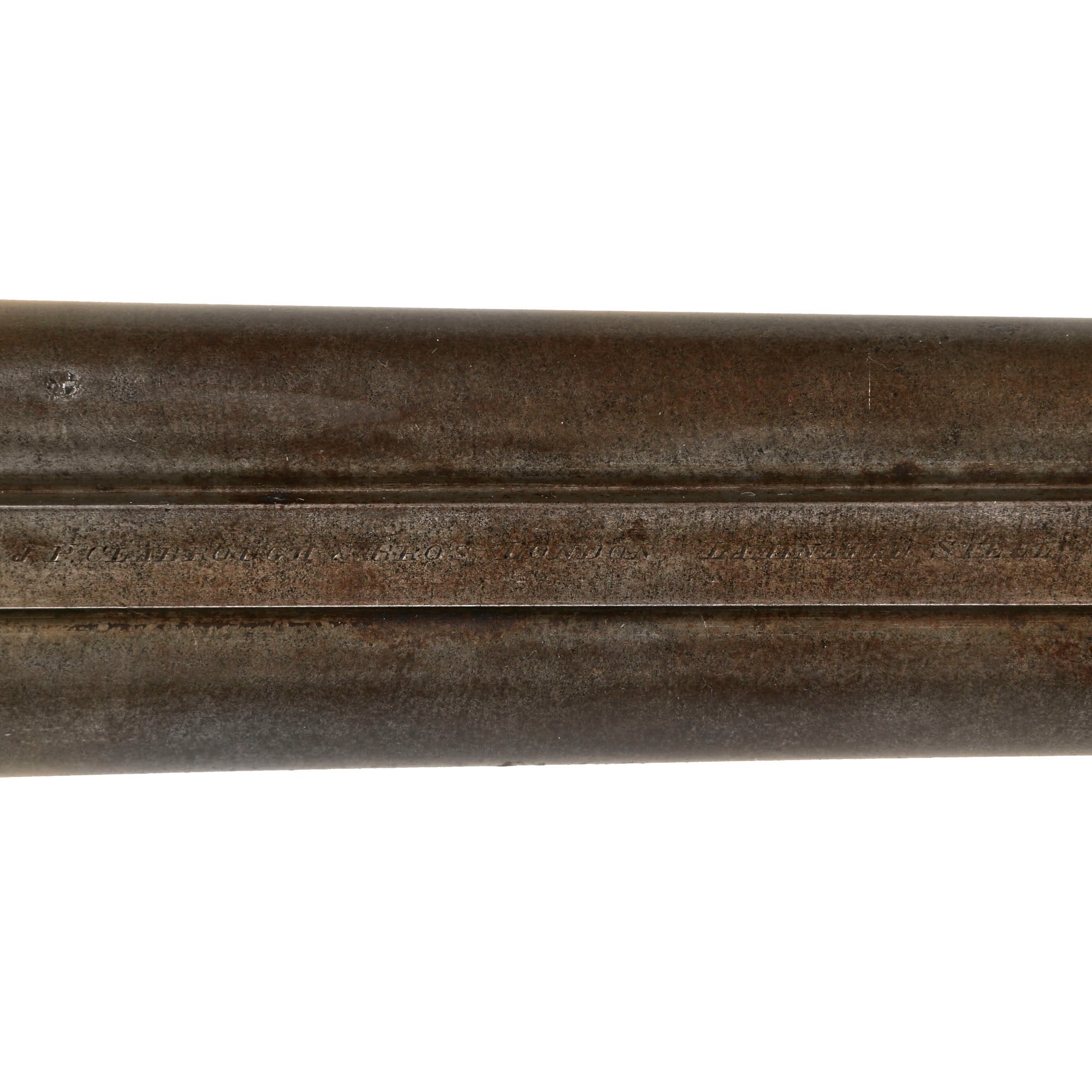 It indicates that the barrel is "damascus" forged, resulting in a lovely pattern due to the laminated nature of the steel, which also adds strength. The finish on the barrels is faded to a gray patina, but the spiral forging lines are still readily apparent in some areas and very attractive.