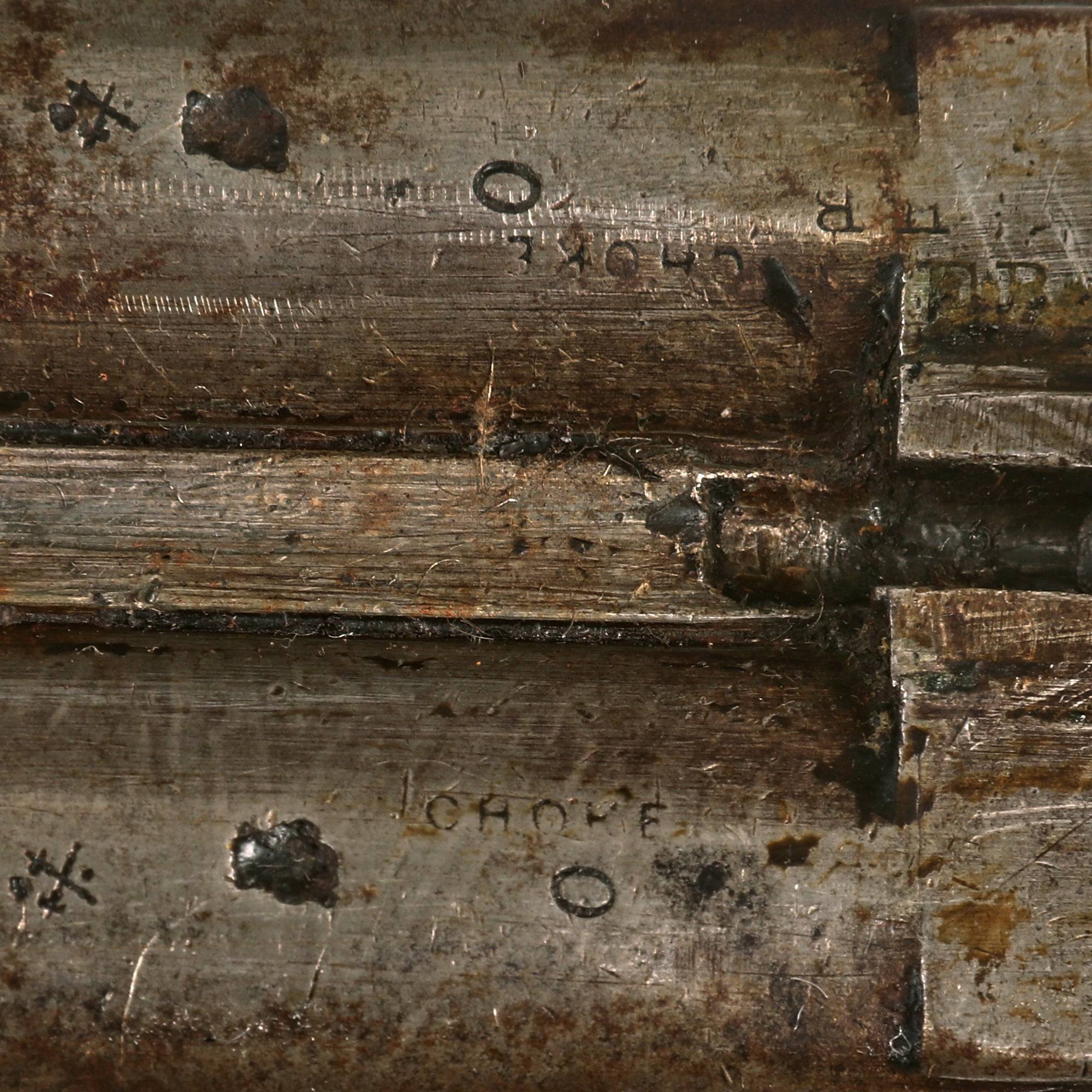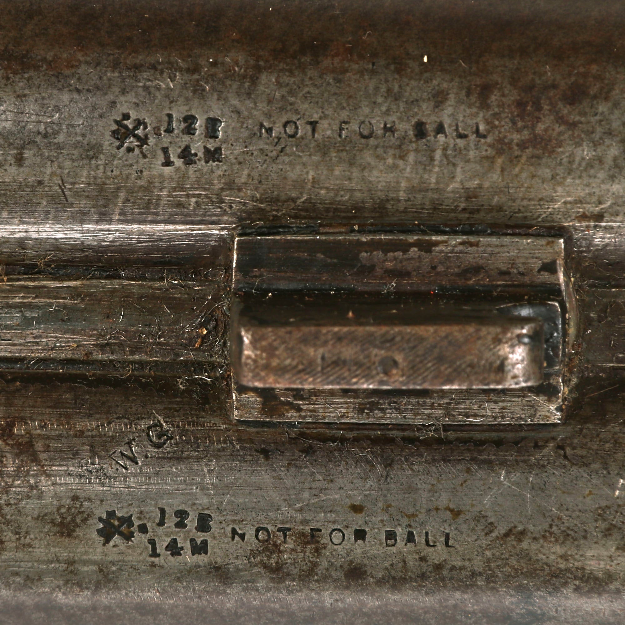 The bottoms of each barrel bear the correct Birmingham proof marks, including the CROWN / CROSSED SCEPTERS / BPC "proof" and CROWN / CROSSED SCEPTERS / V "viewed" marks. There is also the CROWN / BP definitive "black powder" proof, seen on late 19th century guns. Both barrels also are marked CHOKE 0, as well as 12B / 14M, and NOT FOR BALL. In this case, "12B" stands for 12 Bore, or gauge, which is about 0.729", and "14M" stands for 14 muzzle choke, so the end of the barrel is only 0.693" in diameter. This is why it says "not for ball", as using a 12 gauge ball would destroy the barrel, and be very dangerous. This type of notation was used by British proof houses during period 1875 to 1887, after which a new system was put into use, which allows us to definitively set a time period for this shotgun.