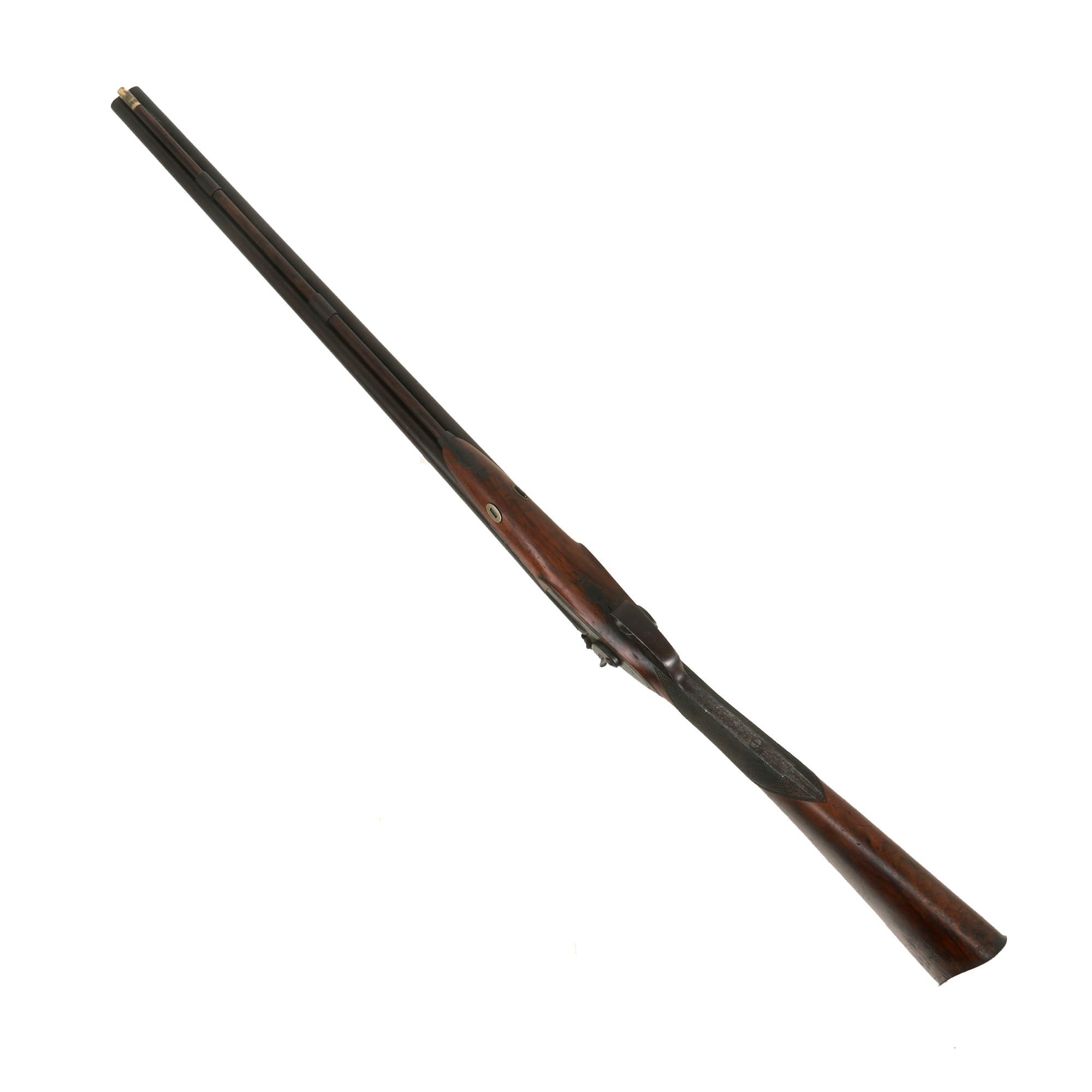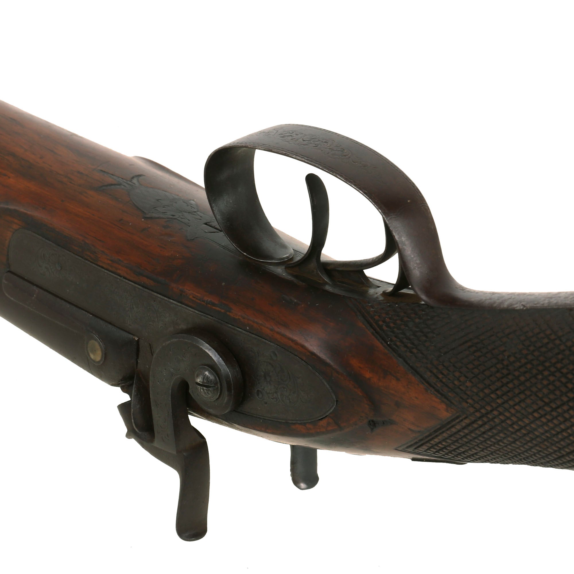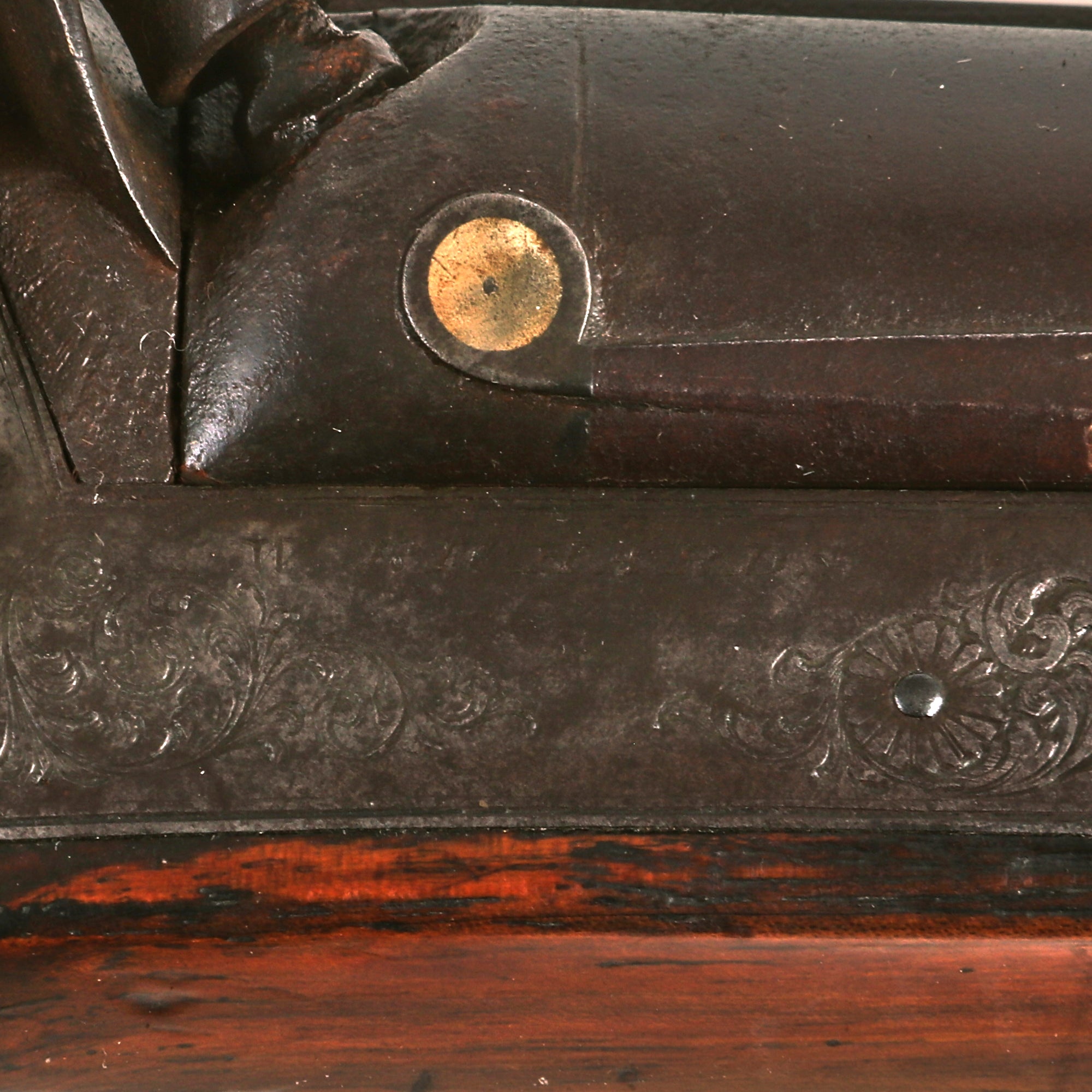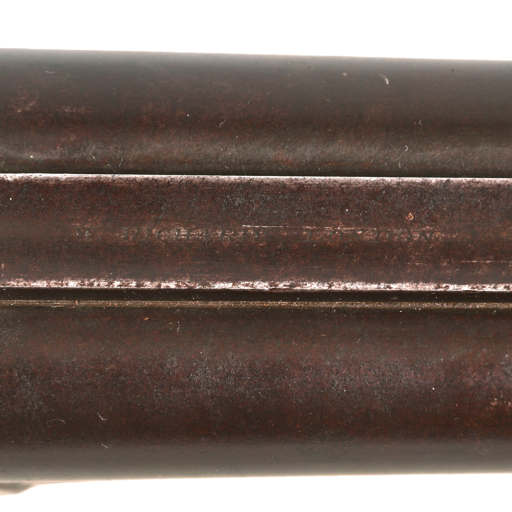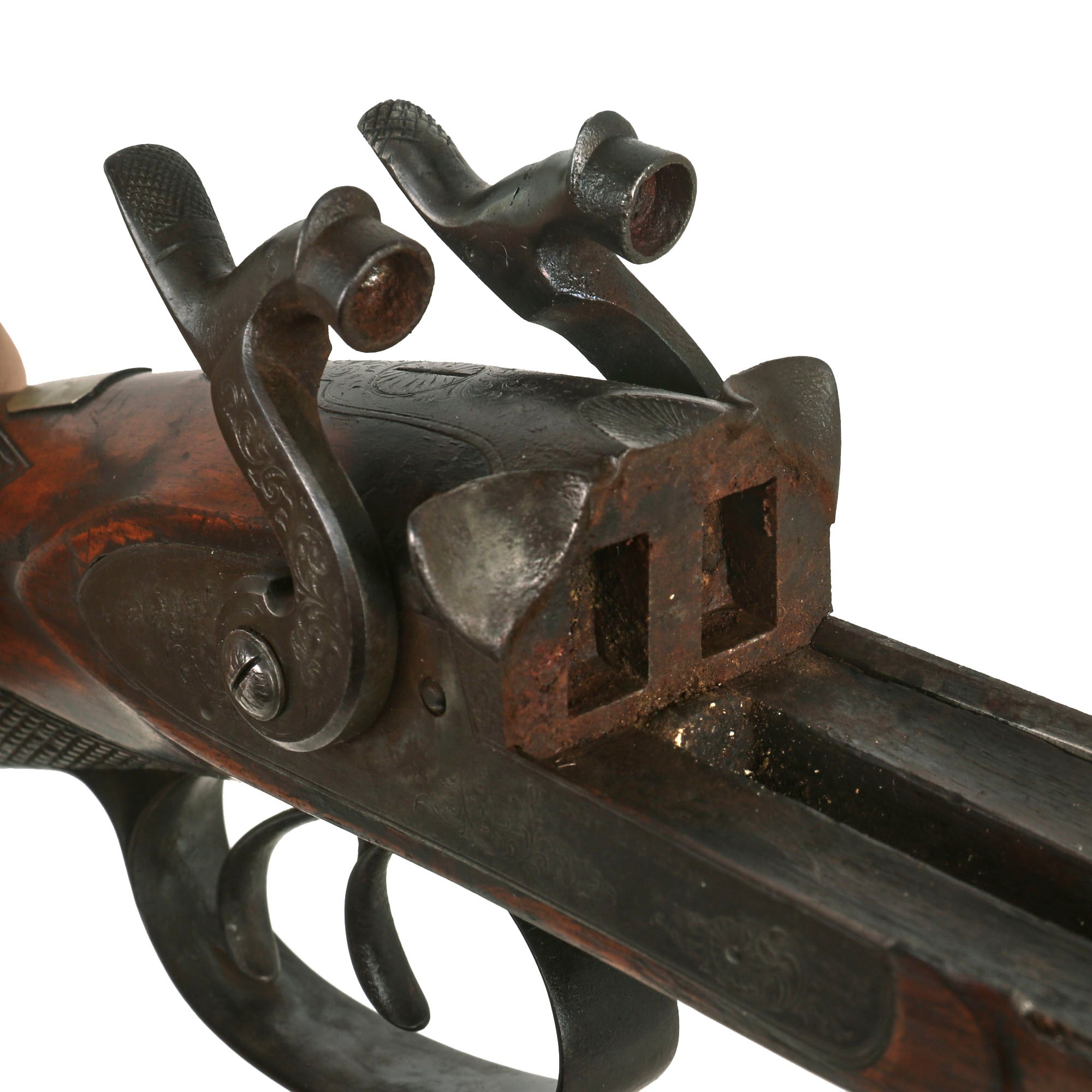 This very nice DOUBLE BARREL 13 bore Percussion Shotgun presents very nicely, with a lovely patina of age. The wrist of the stock is finely checkered for a better grip, and this is still quite strong, showing only a bit of wear from use. There is no major damage or repairs that we can see to the stock, just the usual wear from age and use. The shotgun's fittings are mostly of iron, with factory engraving that was once highly decorative, but now definitely a bit worn in areas. The barrel wedge escutcheons are made from "German Silver", and there is also a small escutcheon on the bottom of the stock, which is blank.