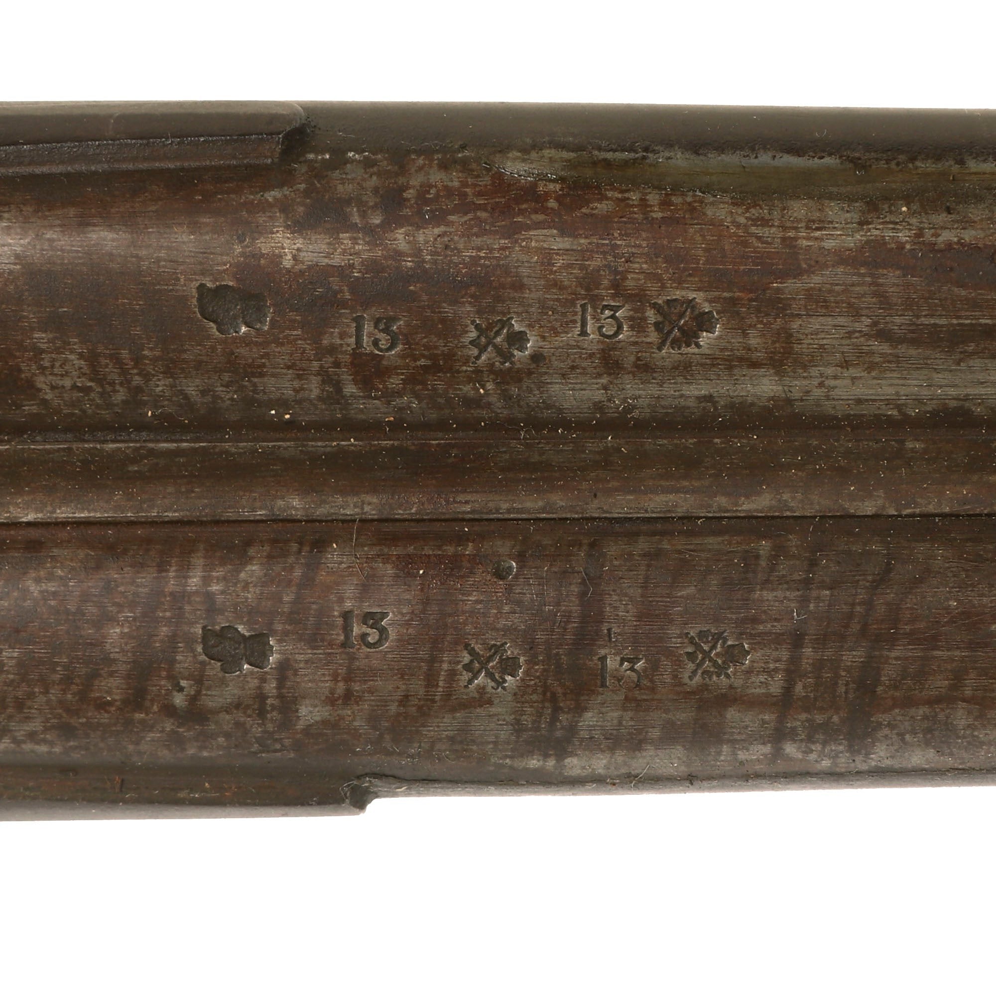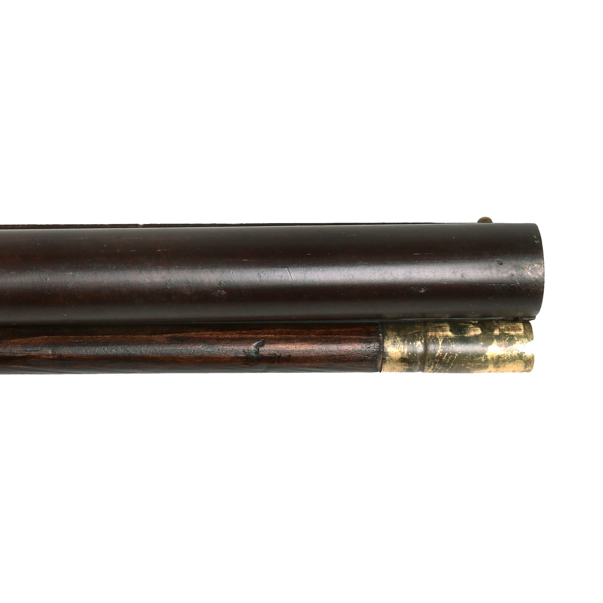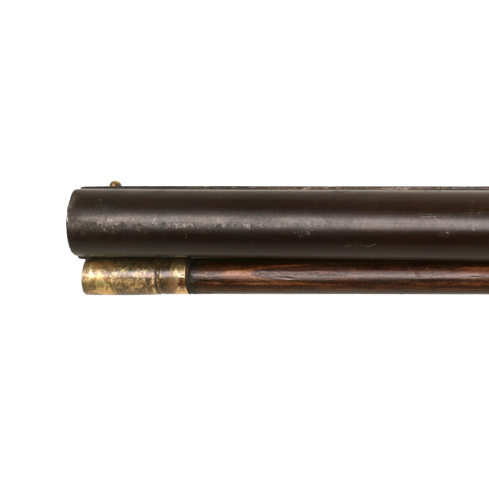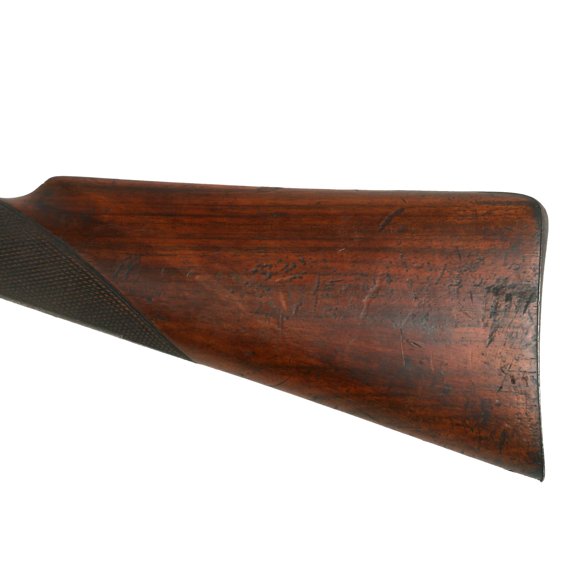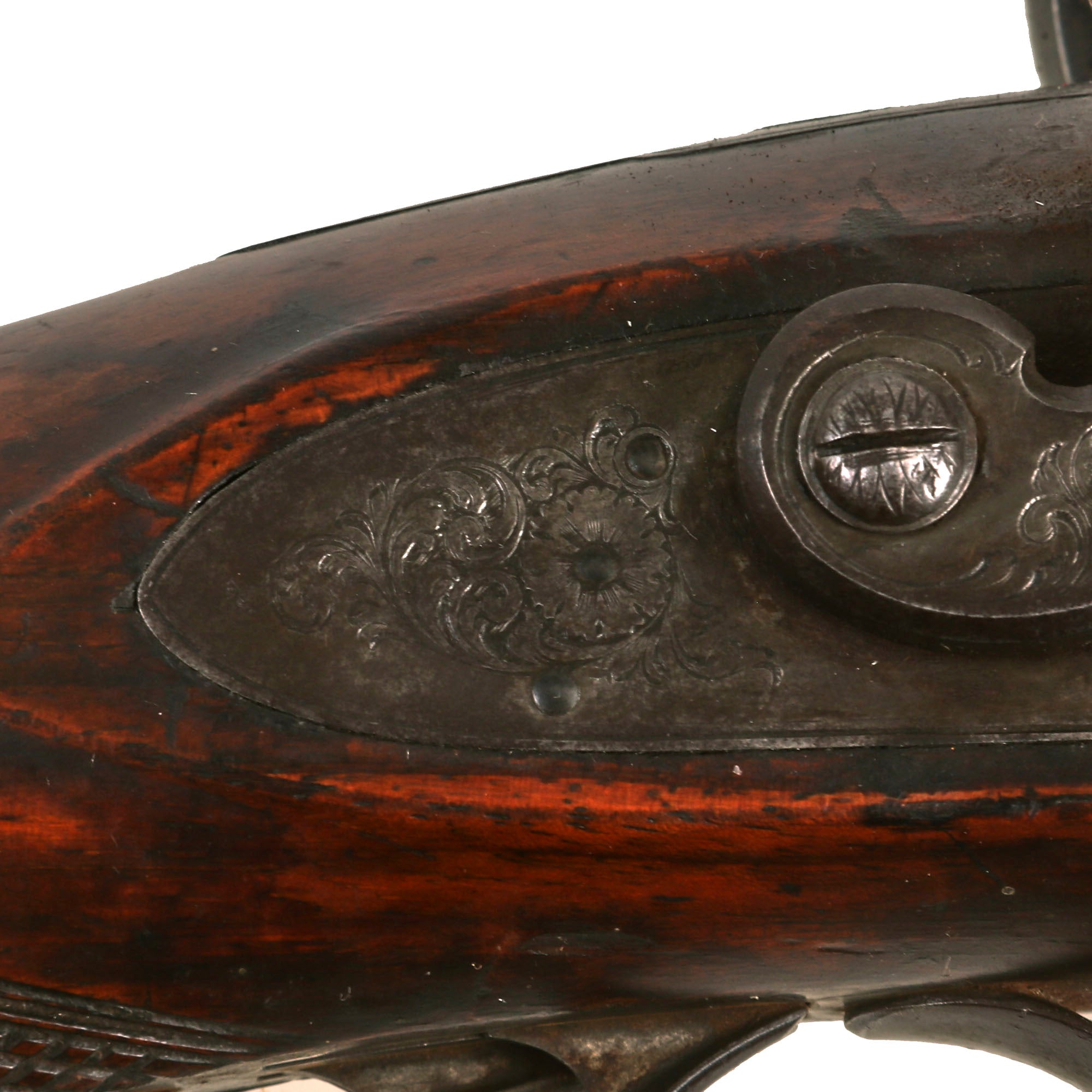 This very nice DOUBLE BARREL 13 bore Percussion Shotgun presents very nicely, with a lovely patina of age. The wrist of the stock is finely checkered for a better grip, and this is still quite strong, showing only a bit of wear from use. There is no major damage or repairs that we can see to the stock, just the usual wear from age and use. The shotgun's fittings are mostly of iron, with factory engraving that was once highly decorative, but now definitely a bit worn in areas. The barrel wedge escutcheons are made from "German Silver", and there is also a small escutcheon on the bottom of the stock, which is blank.