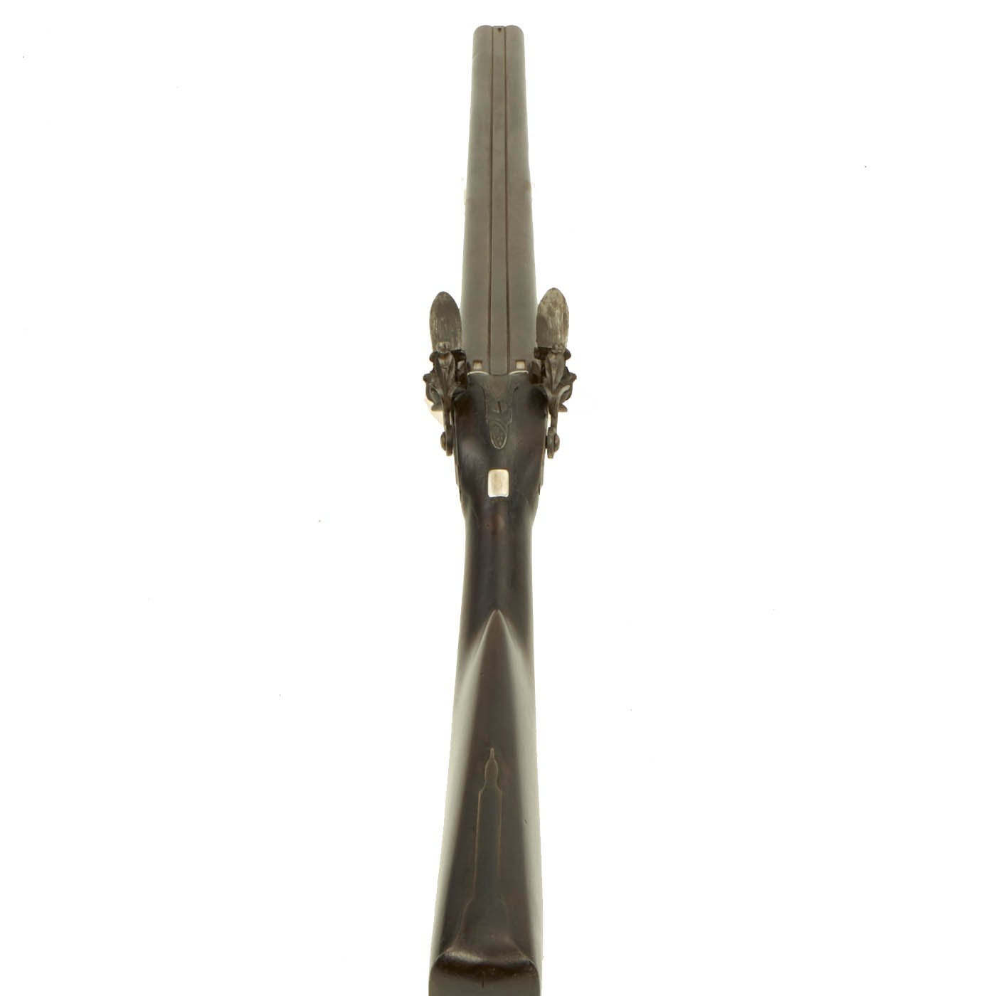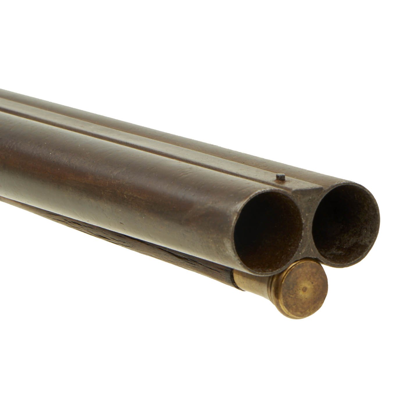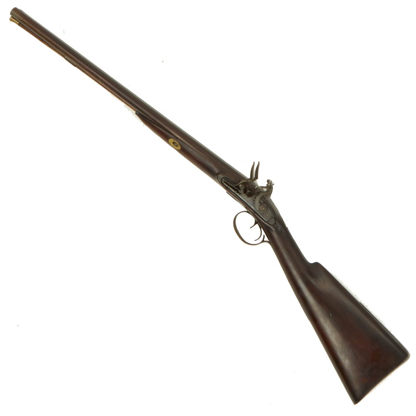 Original Item: Only One Available. Here we have a very nice British Double Barrel Flintlock Coaching shotgun, in 14 bore, a popular size of the time for self-defense. It is fitted with a 23" double barrels and measures 39" in overall length. These smaller guns were often referred to as "Carbines", and were very popular for self-defense during the Coaching era. The shorter length made them much easier to bring to bear, and the close distances made the accuracy of a longer barrel a non-issue.