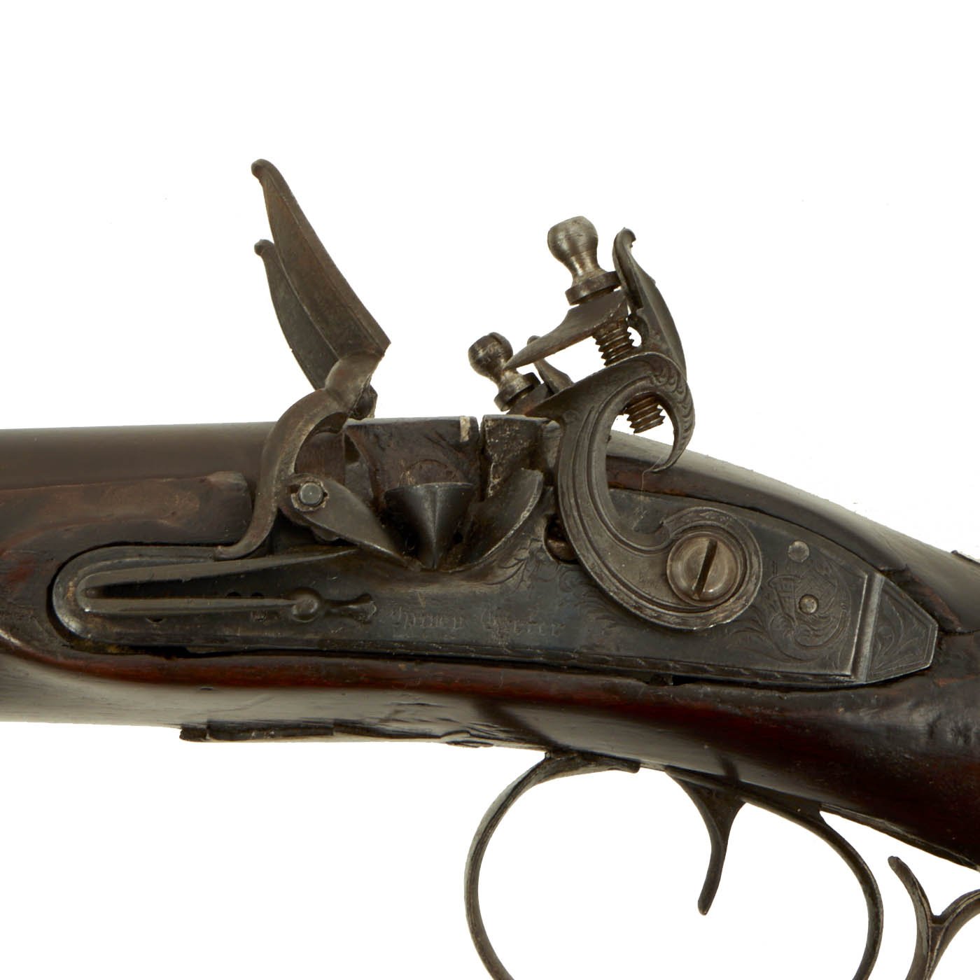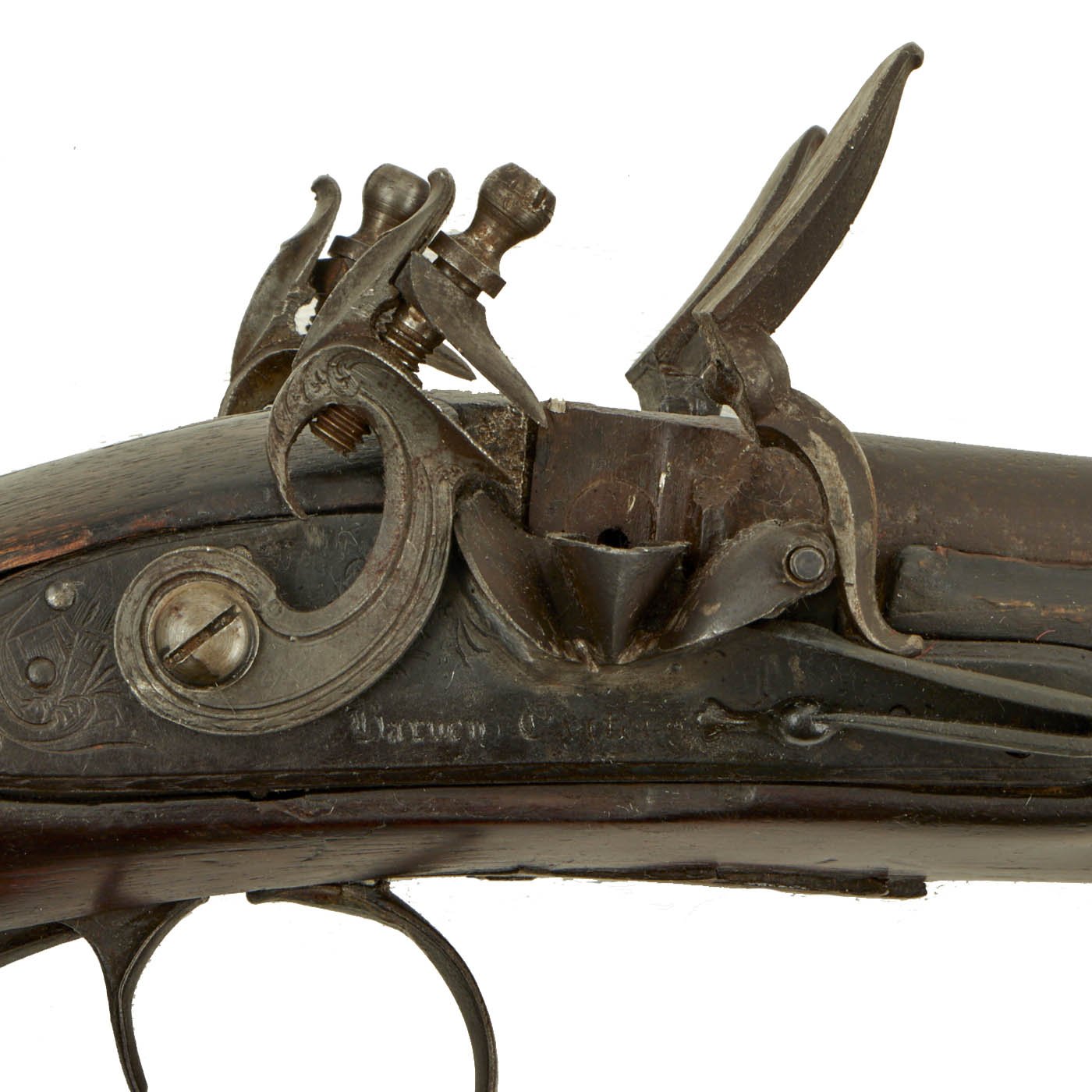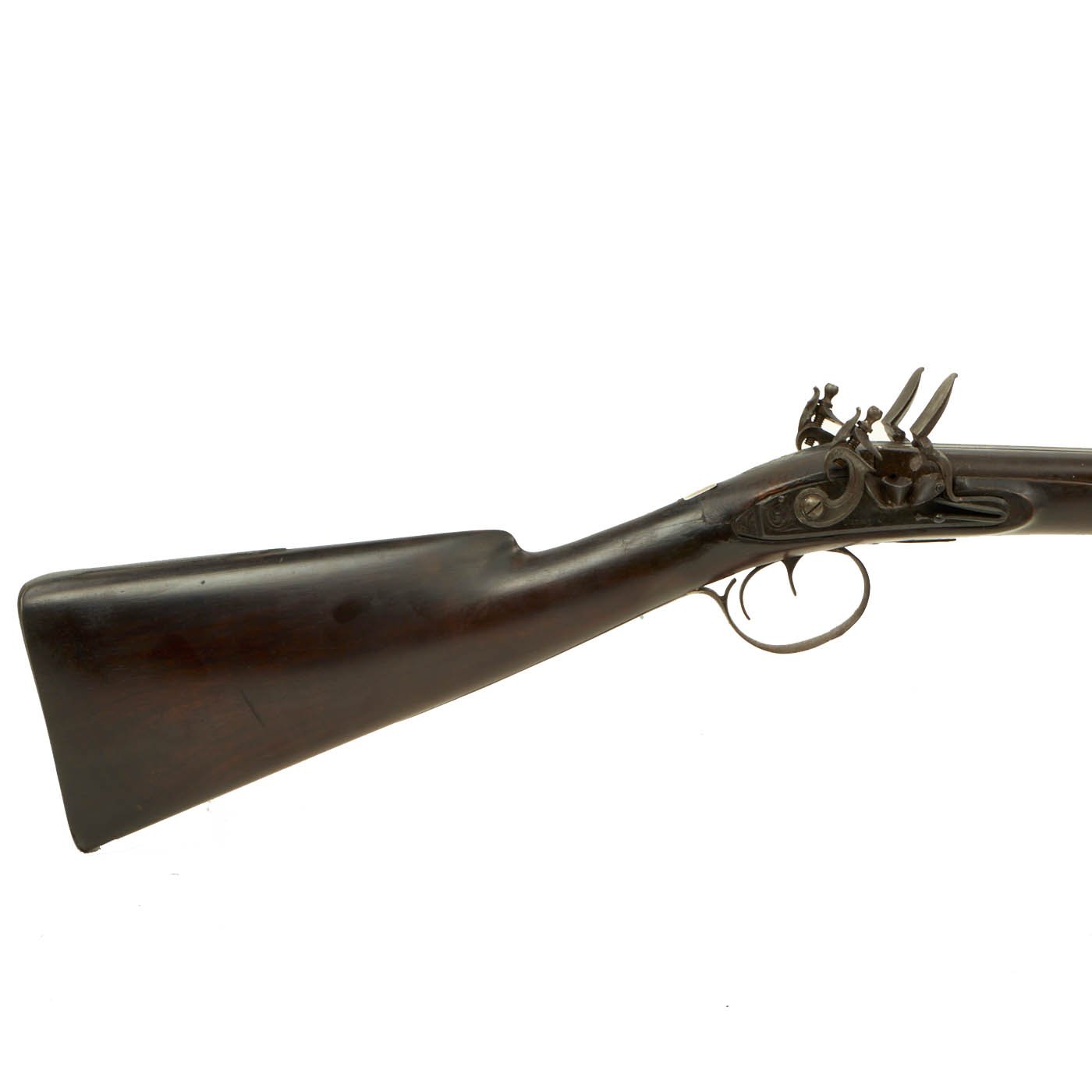 Original Item: Only One Available. Here we have a very nice British Double Barrel Flintlock Coaching shotgun, in 14 bore, a popular size of the time for self-defense. It is fitted with a 23" double barrels and measures 39" in overall length. These smaller guns were often referred to as "Carbines", and were very popular for self-defense during the Coaching era. The shorter length made them much easier to bring to bear, and the close distances made the accuracy of a longer barrel a non-issue.