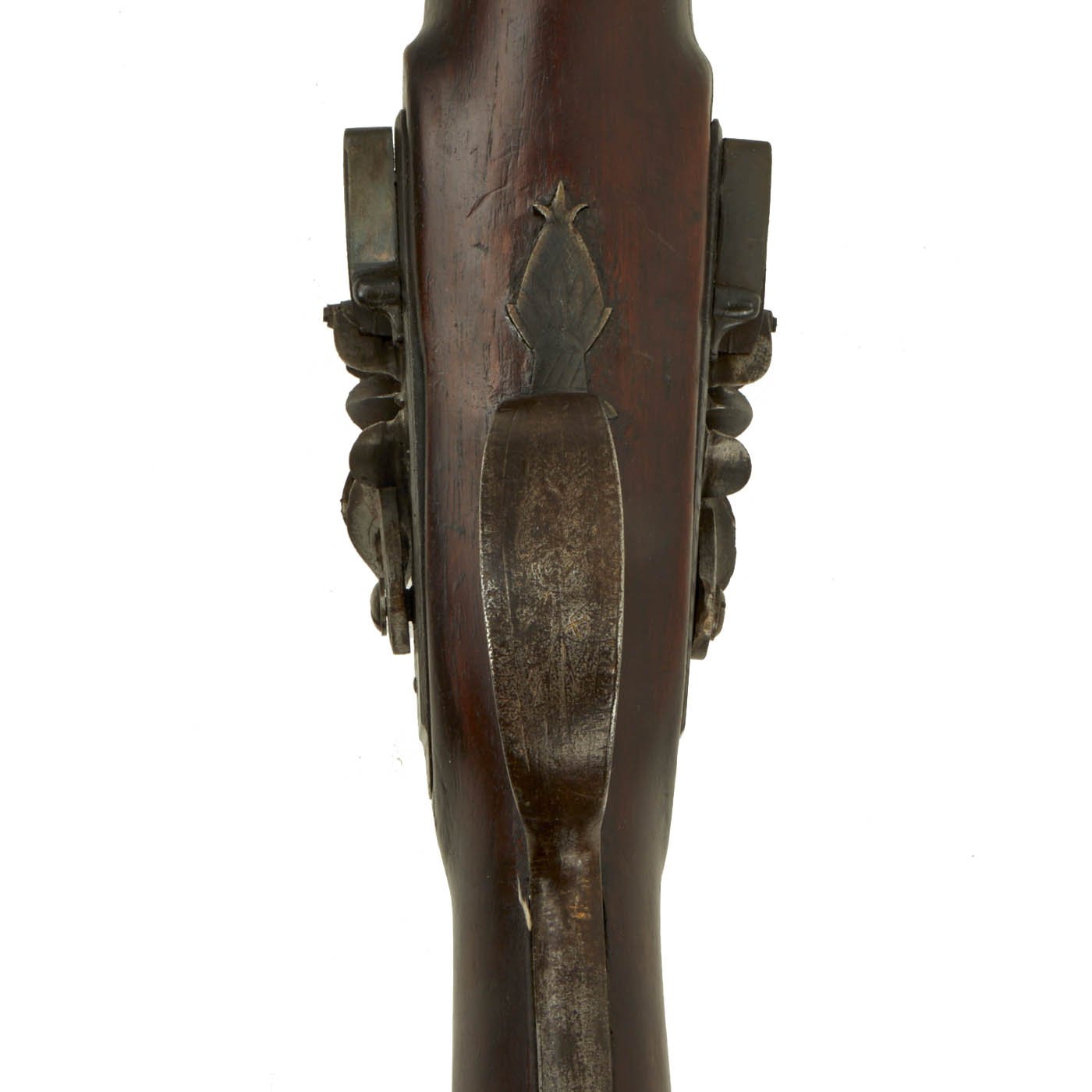 There is lovely engraving on both locks which are both marked Harvey Exeter in lovely Gothic style lettering. There is light engraving on most of the iron metalwork as well. The rear of the barrel assembly has a line of silver inlay, as well as two rectangular stamped areas, which both read HARVEY / EXETER. The Harvey family of Exeter in Southwest England produced many gunsmiths throughout the 19th century, and all are well-regarded.