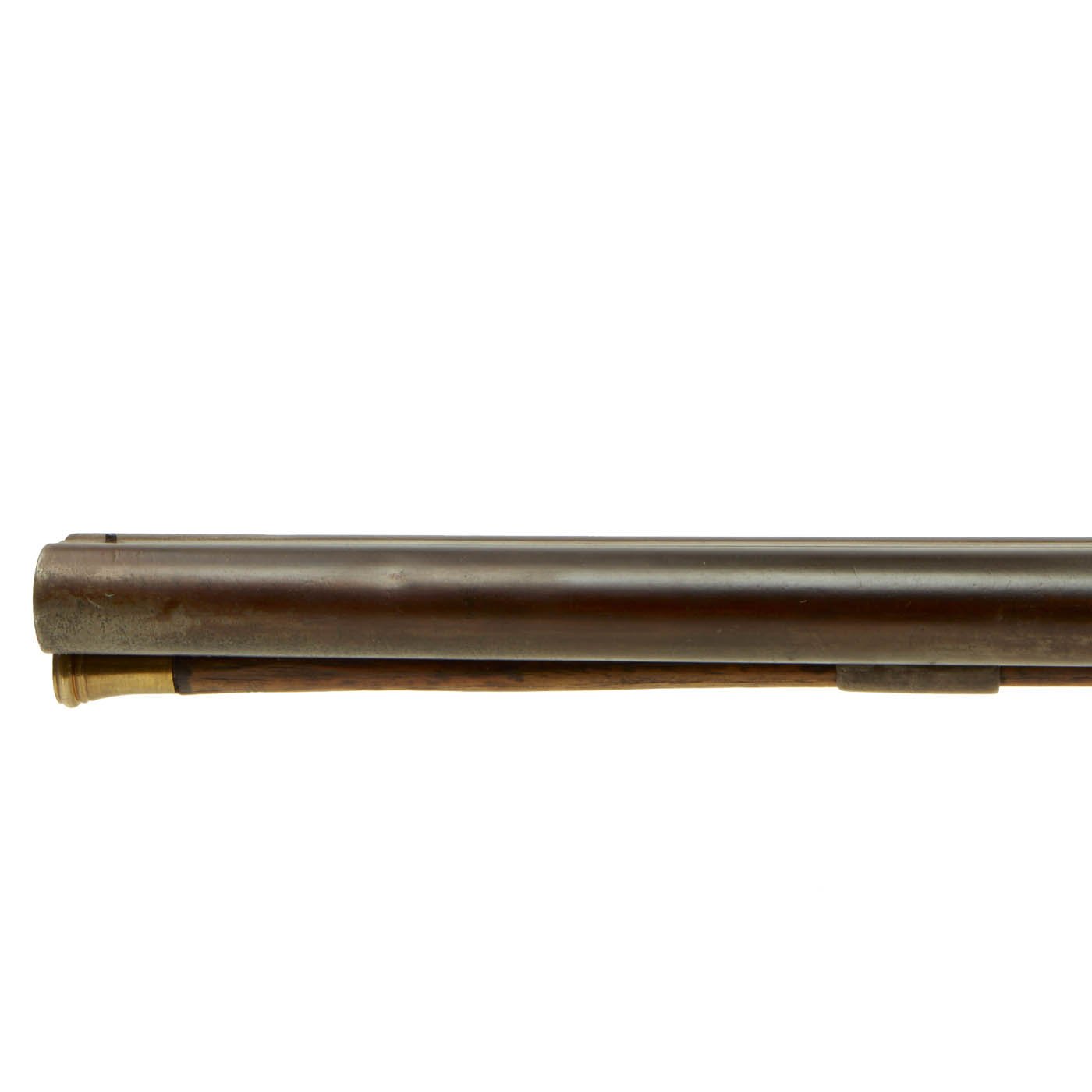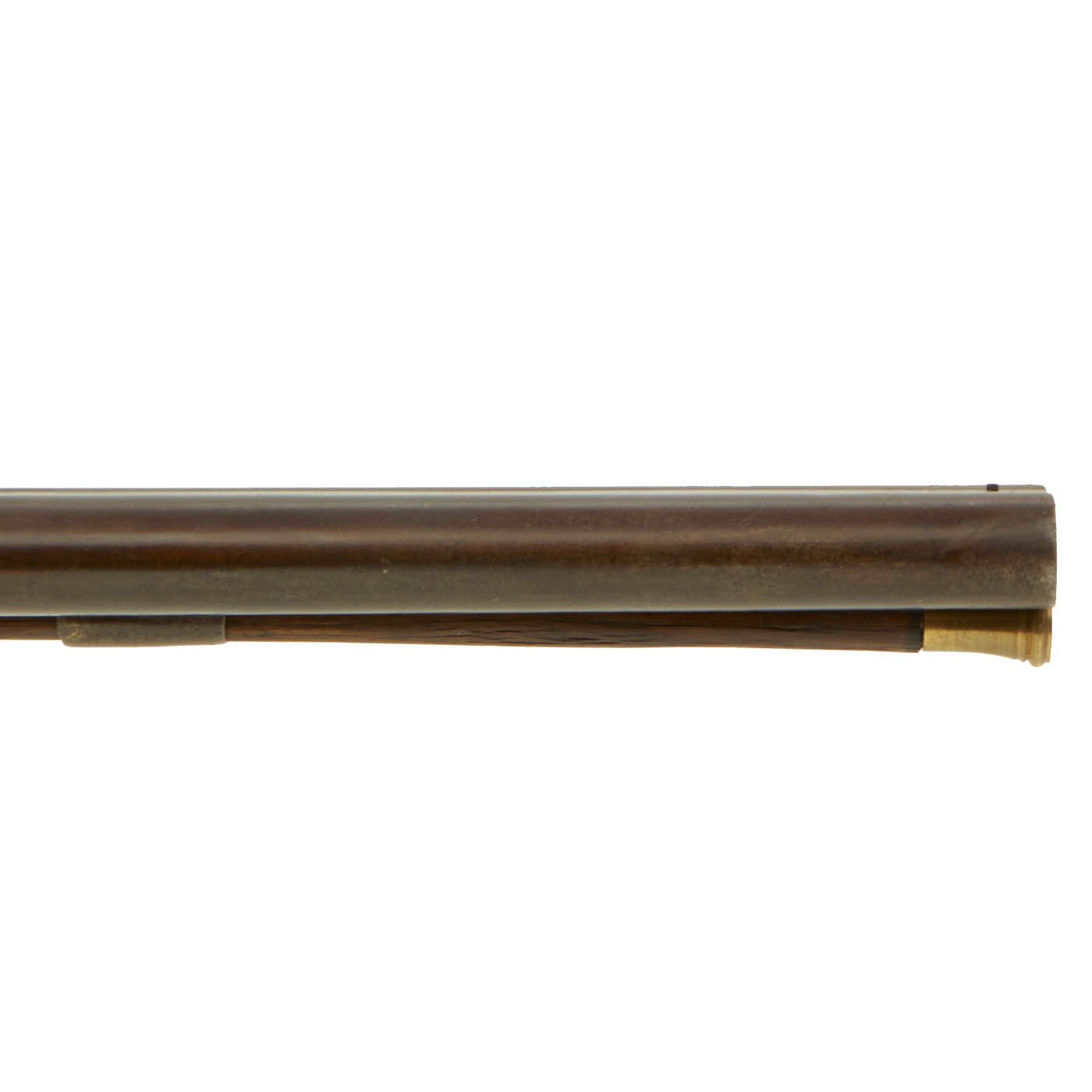 The right side lock is fully functional, holding at half cock and firing at full, while the left look needs a tumbler adjustment, and currently does not have a full cock position. The wood stock is in good condition, with a lovely color, however there definitely are repaired cracks in the wrist and around the barrels. There also appears to be some wood filler used around the barrels. There is a silver escutcheon on the back of the wrist, but it is unmarked. The original ramrod is unfortunately missing, now replaced with a wooden dowel with a machined brass tip