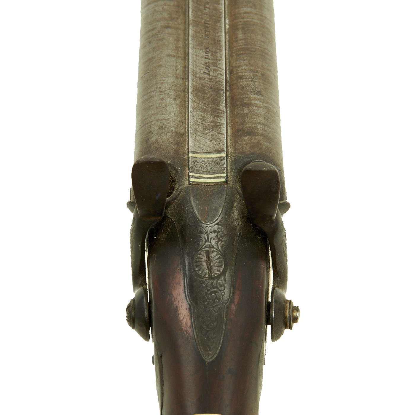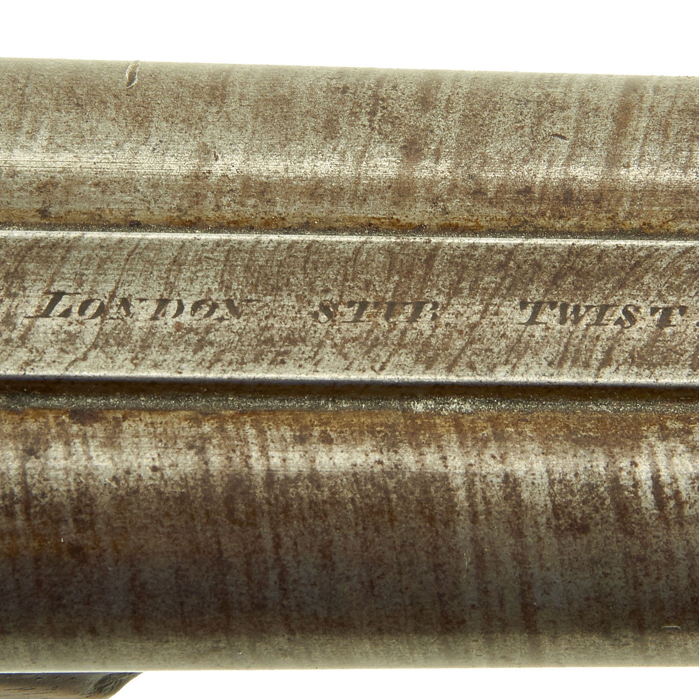 The underside of the barrels are marked with the CROWN / CROSSED SCEPTERS / BPC and CROWN / CROSSED SCEPTERS / P Birmingham proof and viewed marks, as used from 1813 to 1856. The barrel strap is also faintly marked with LONDON STUB TWIST, and still shows clear twist marks.