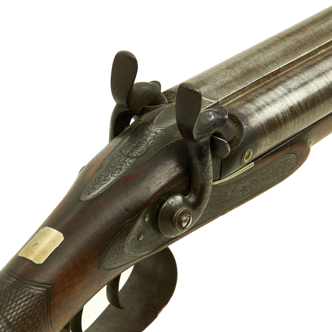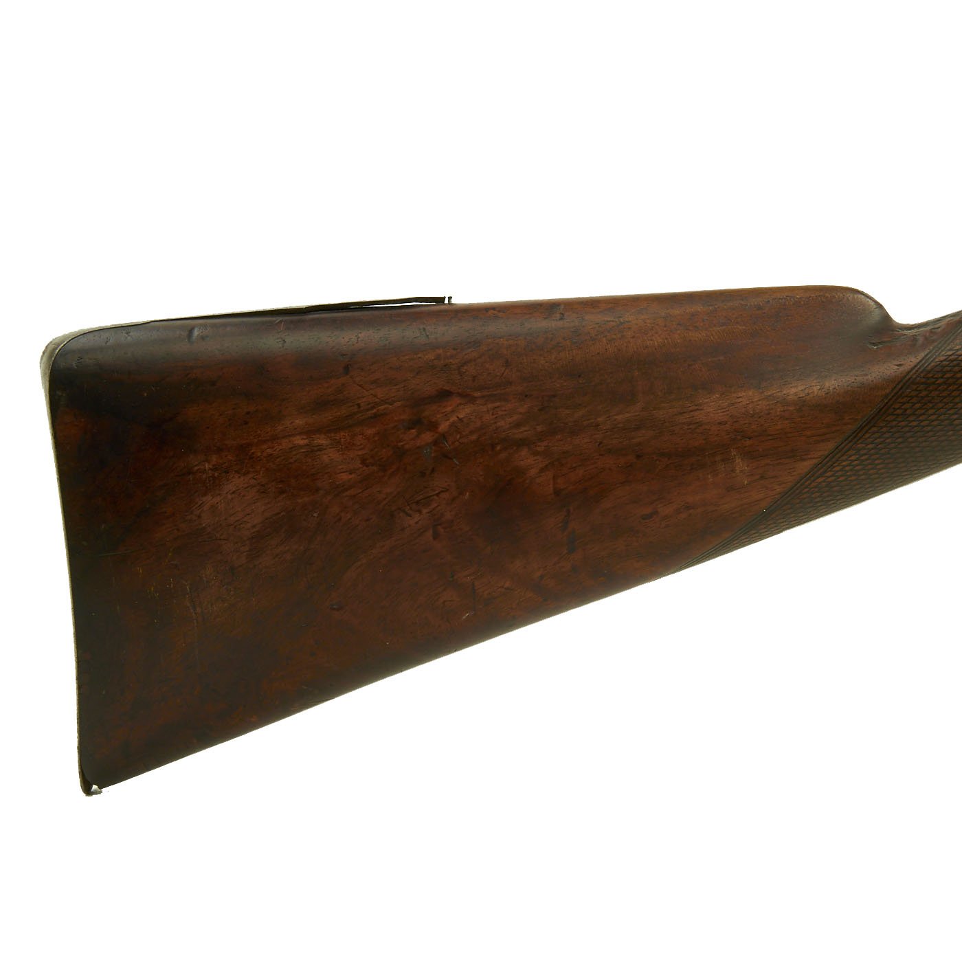 Original Item: Only One Available. This came to us straight out of a collection where it was well looked after for over 50 years. This is a very nice British Double Barrel percussion shotgun, in what looks to be 14 bore, a very popular size then. It is fitted with a 26" double barrels and measures 42 1/2" in overall length.