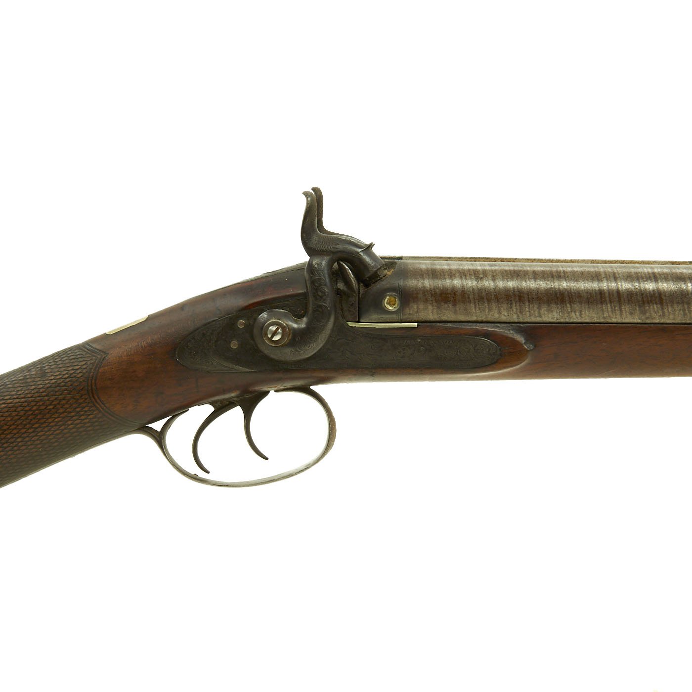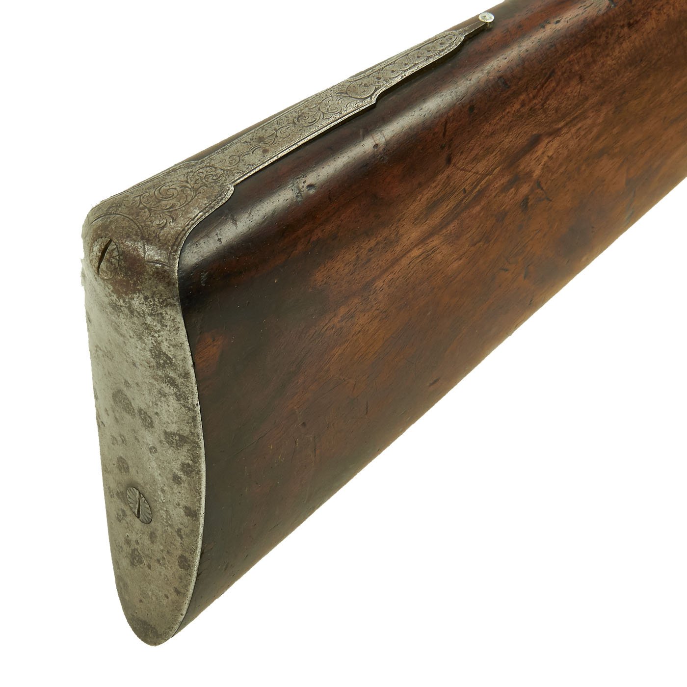 Each of the locks is heavily engraved with a lovely hunting scene, and is signed W. CHANCE & SON, a well-known London gunmaking lineage. William Chance & Son was the name they used from 1842-1856. The gun comes with a very nice original wooden ramrod, which has a bore clearing "worm" on one end. The brass rammer cap is unfortunately worn and will fall off if pulled hard.