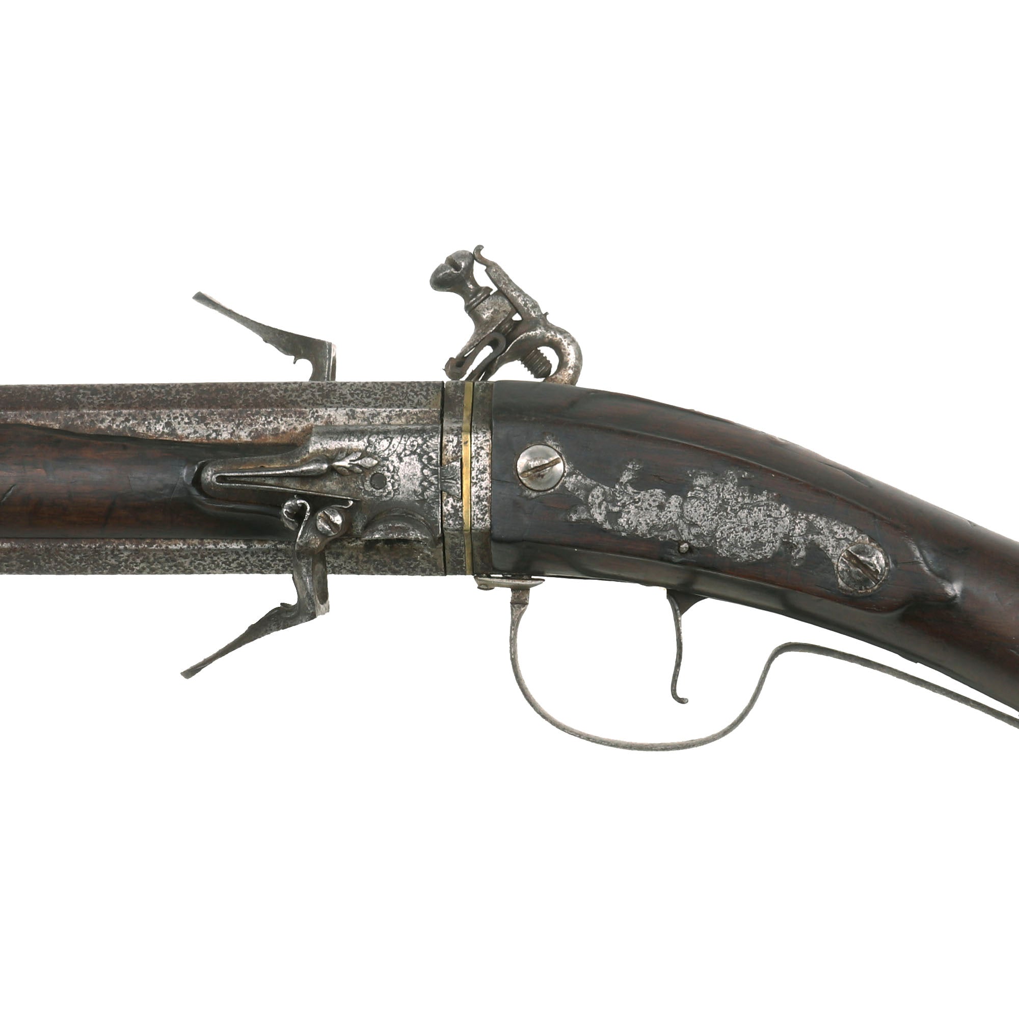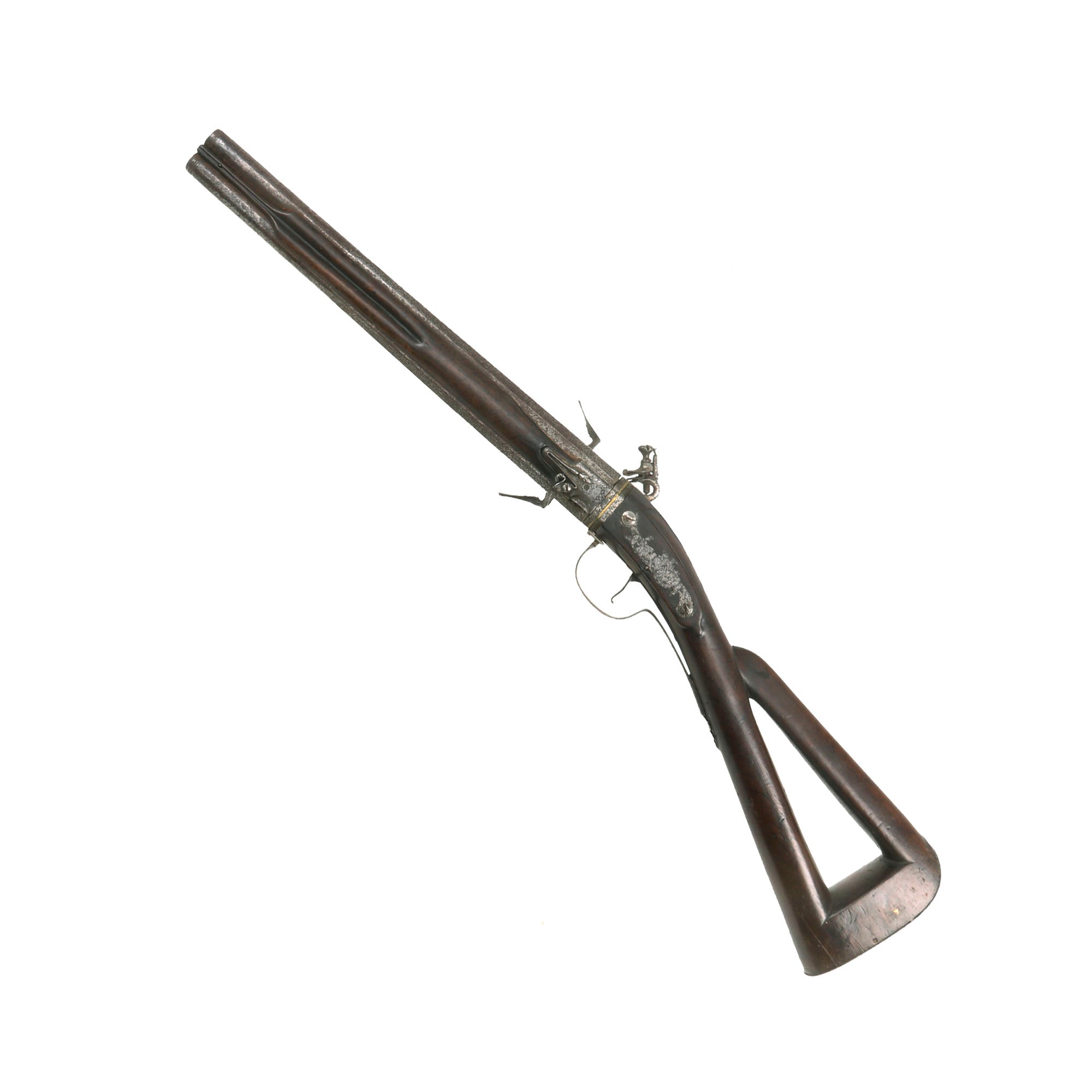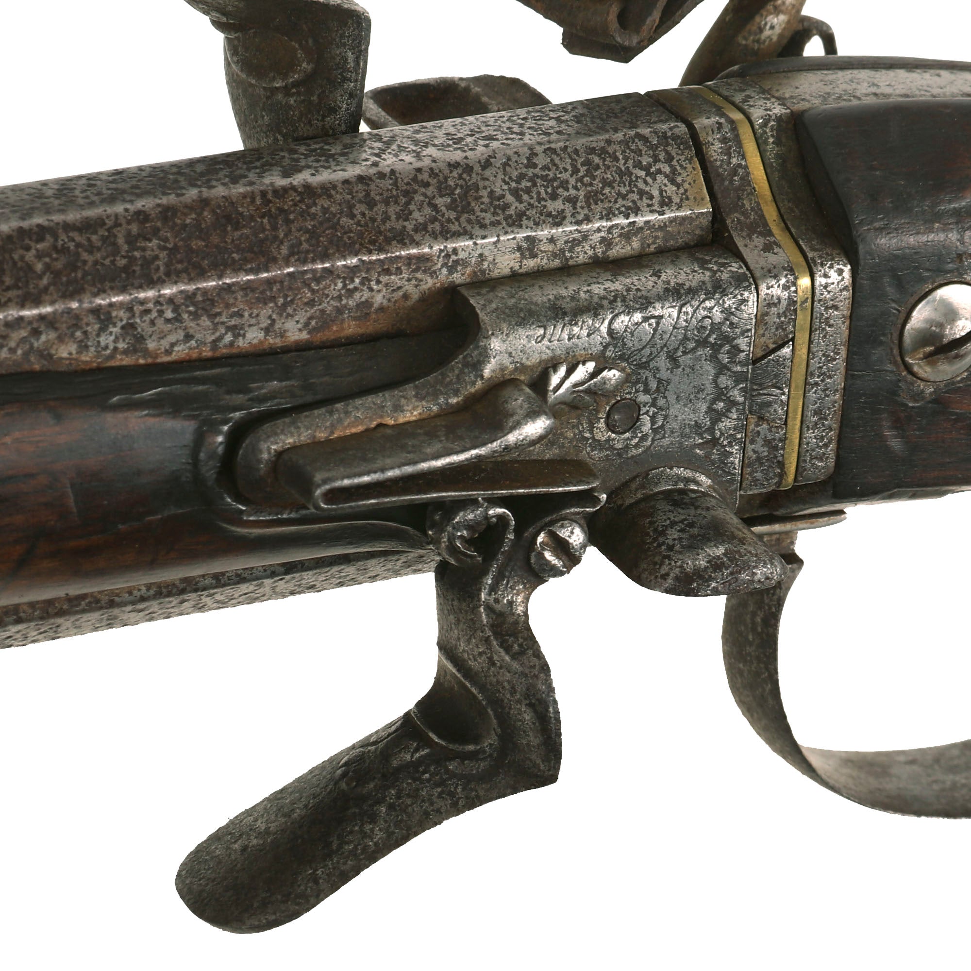 Original Item: One of a Kind. 15 3/4 in., .54 caliber octagon to round barrels with ring decoration at the muzzles; long convex lock plate with sharply pointed tail, cock with scroll decoration and safety catch, the pans and steel assemblies mounted on the barrels and signed "H Barne" below the steel spring; walnut stock with open butt and fluted fore stock; iron furniture including a butt plate with short lobe tang a foliate scroll engraved side plate, and trigger guard with foliate rear finial, the bow when pressed upward releases an internal catch allowing the barrels to be turned, and sheet iron rammer pipe, horn rammer.