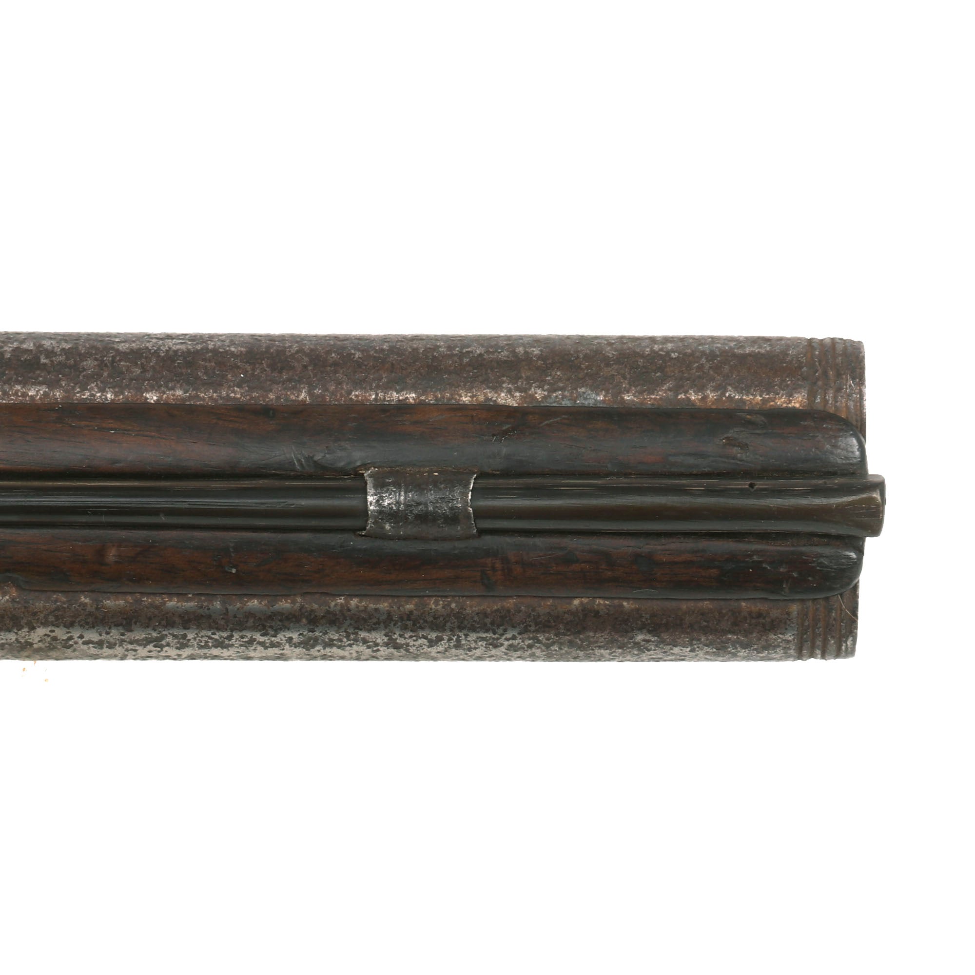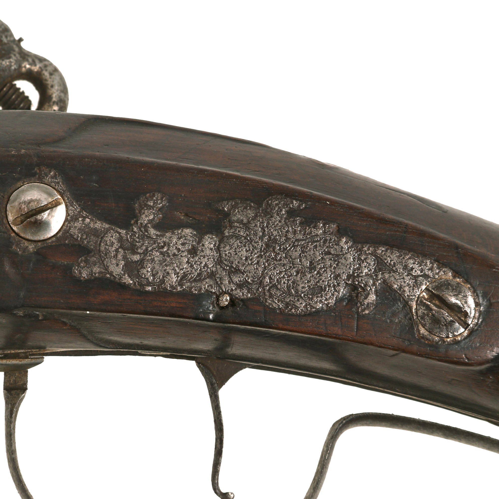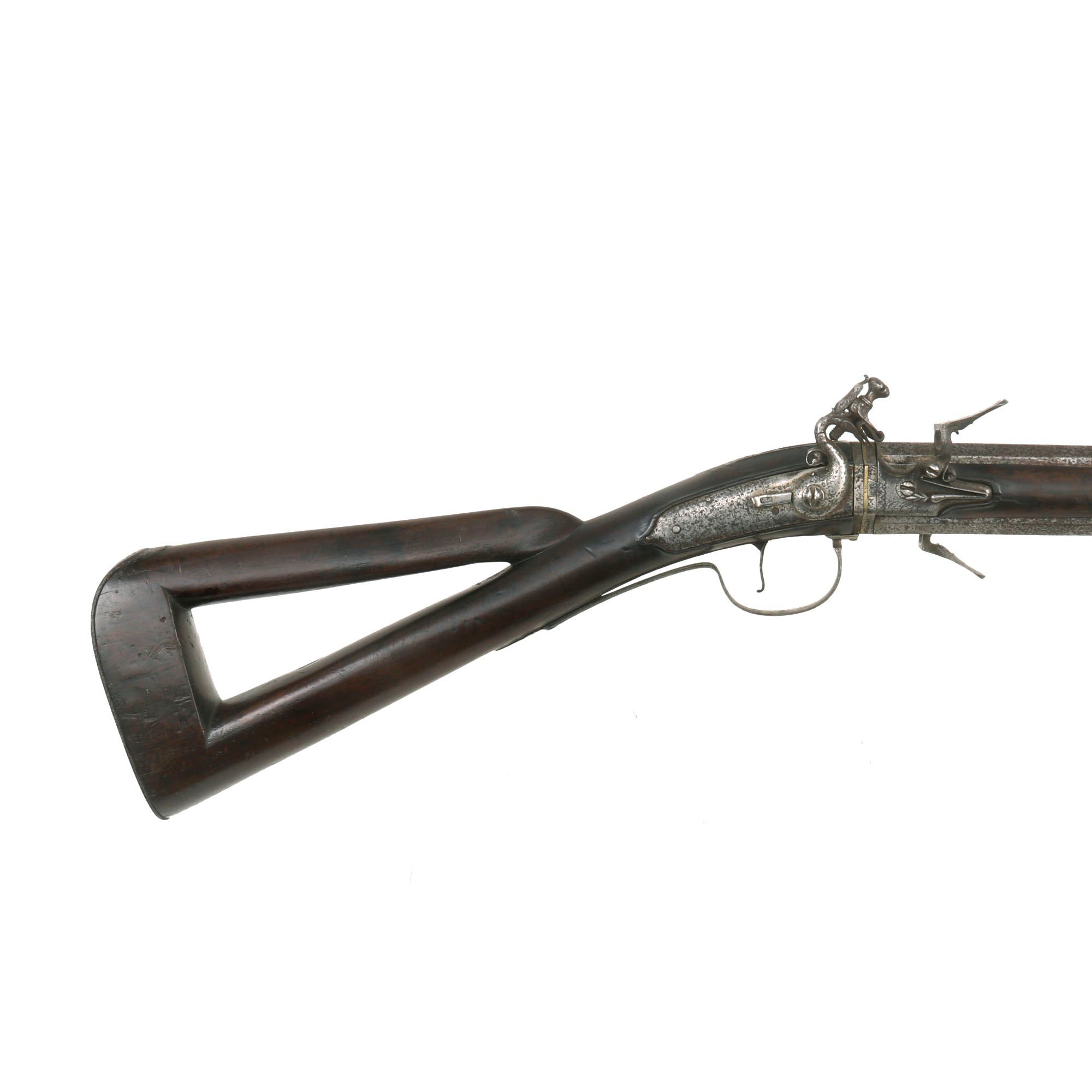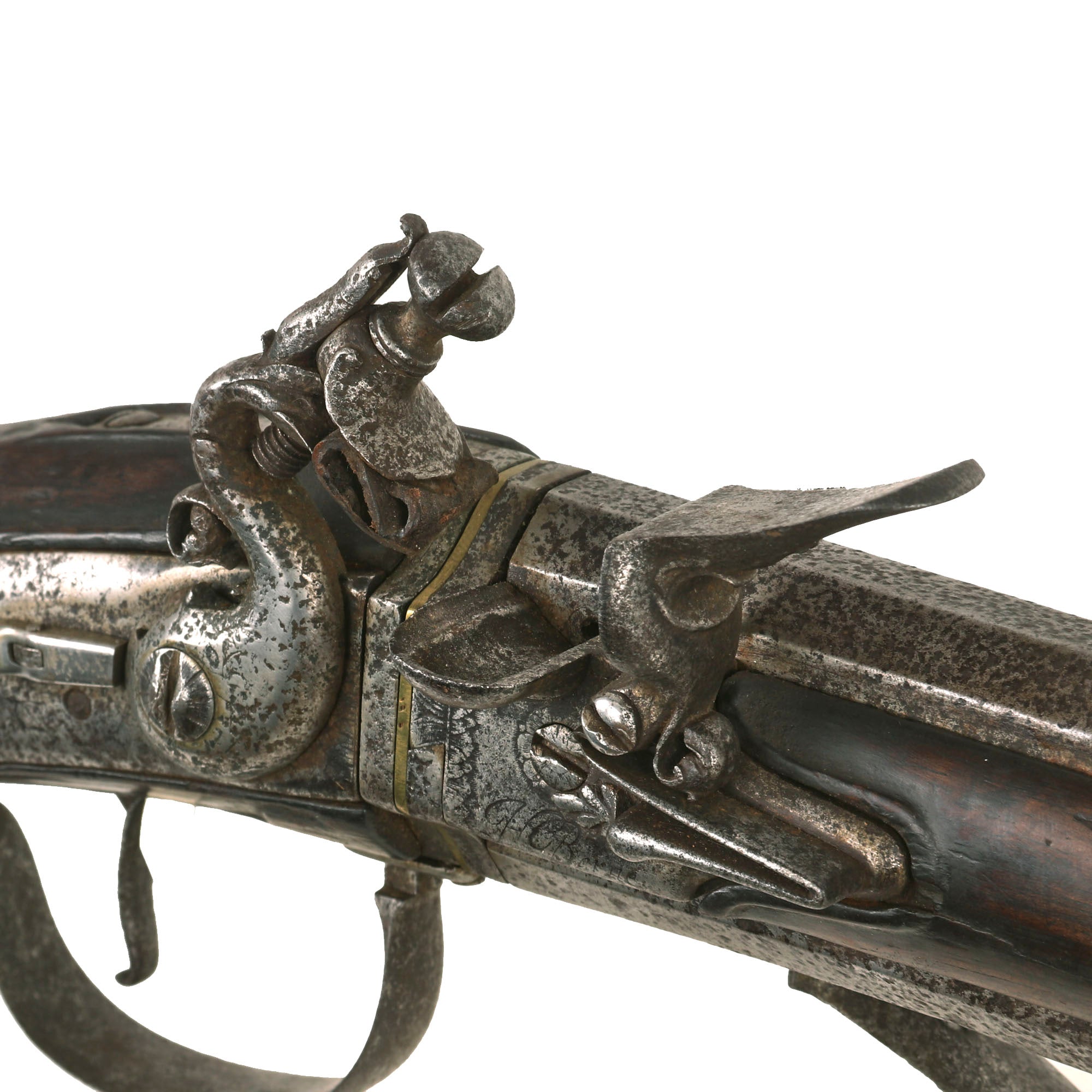 Original Item: One of a Kind. 15 3/4 in., .54 caliber octagon to round barrels with ring decoration at the muzzles; long convex lock plate with sharply pointed tail, cock with scroll decoration and safety catch, the pans and steel assemblies mounted on the barrels and signed "H Barne" below the steel spring; walnut stock with open butt and fluted fore stock; iron furniture including a butt plate with short lobe tang a foliate scroll engraved side plate, and trigger guard with foliate rear finial, the bow when pressed upward releases an internal catch allowing the barrels to be turned, and sheet iron rammer pipe, horn rammer.