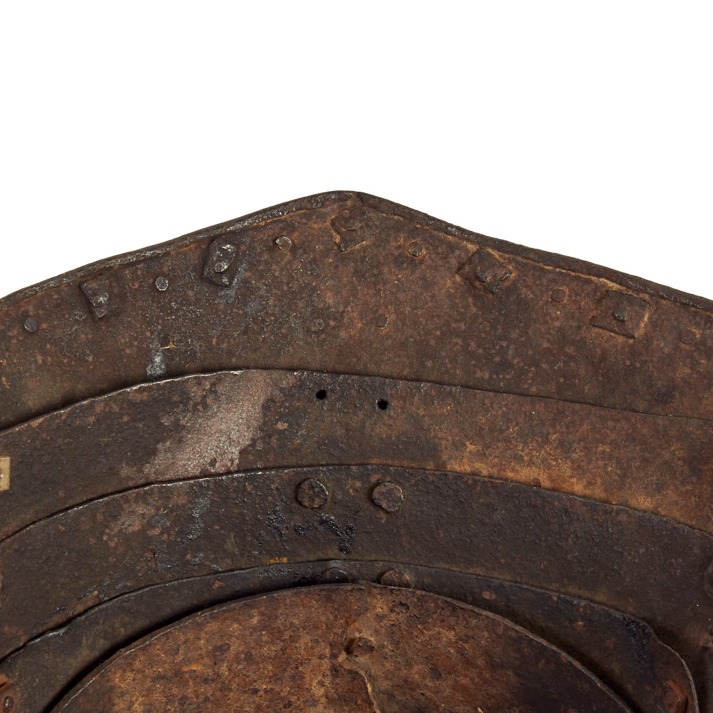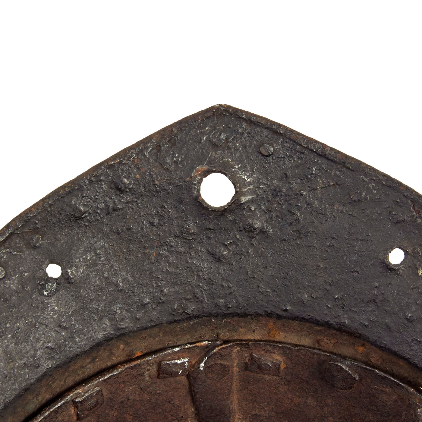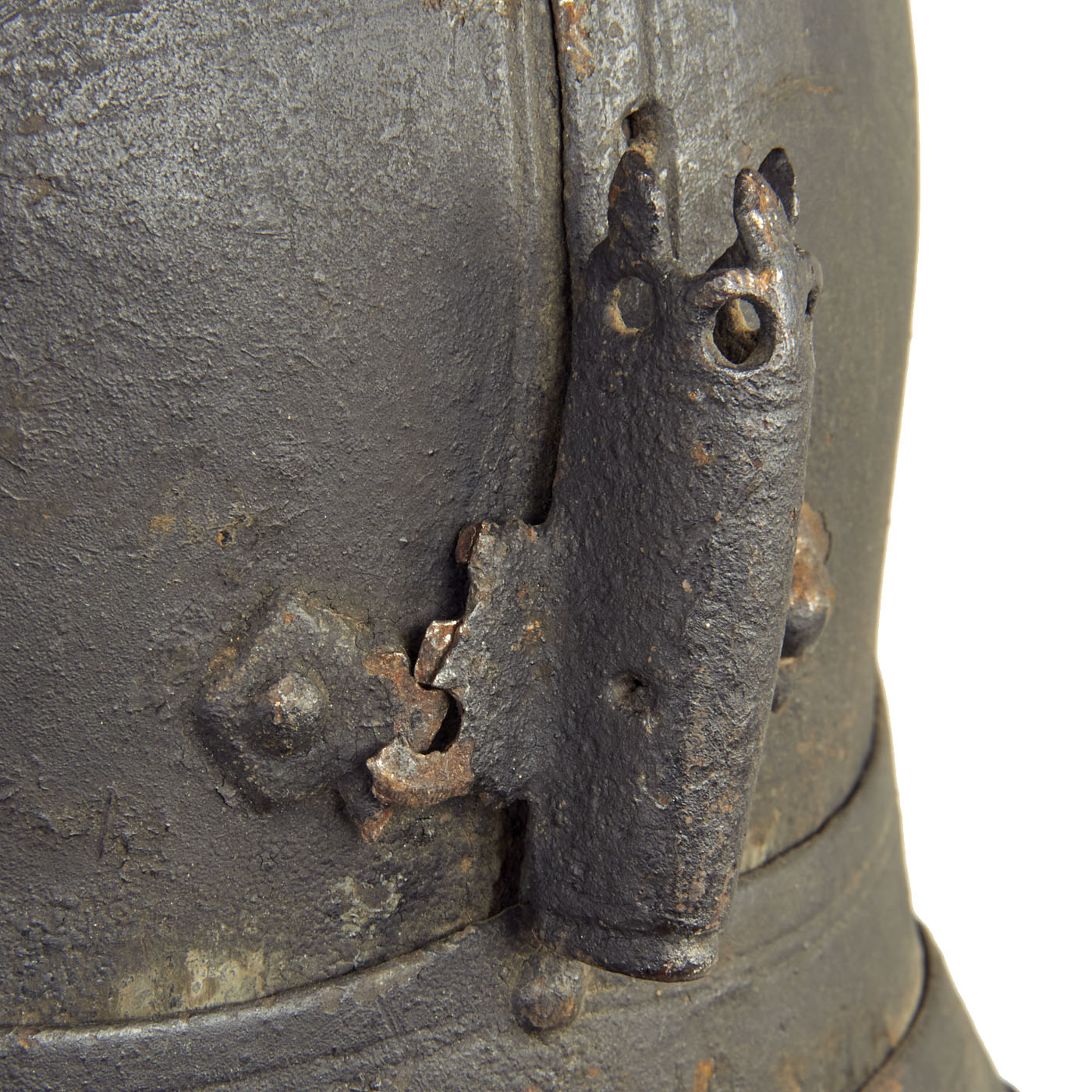 The helmet is a forged iron Lobster Tail helmet with articulated neck guard, ventilated suspended ear covers and frontal peak to which is attached the classic English THREE BAR rigid face guard, similar style helmets equipped with a single sliding Nose Guard are of Continental origin during this same period and later. The earpieces are unfortunately missing as is the face guard, but the 3 punched holes for the Three Bar are present. The condition is great given the age of the helmet. There are areas of material loss as well as minor degradation and oxidation.