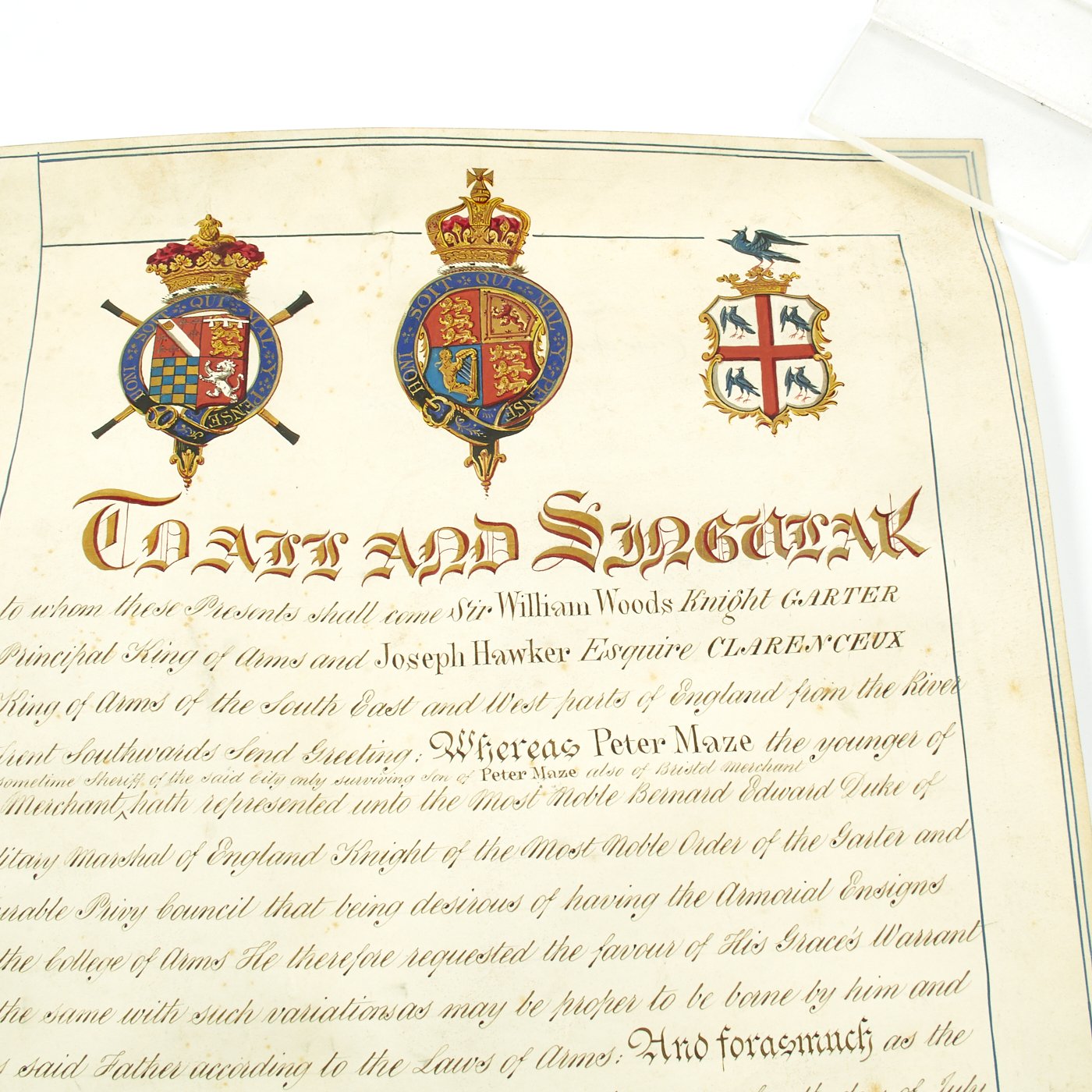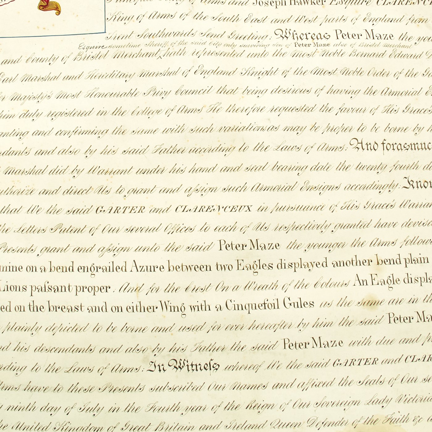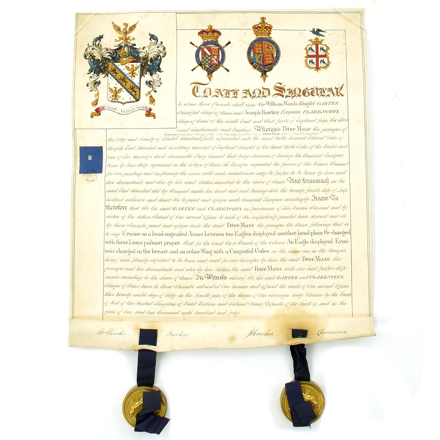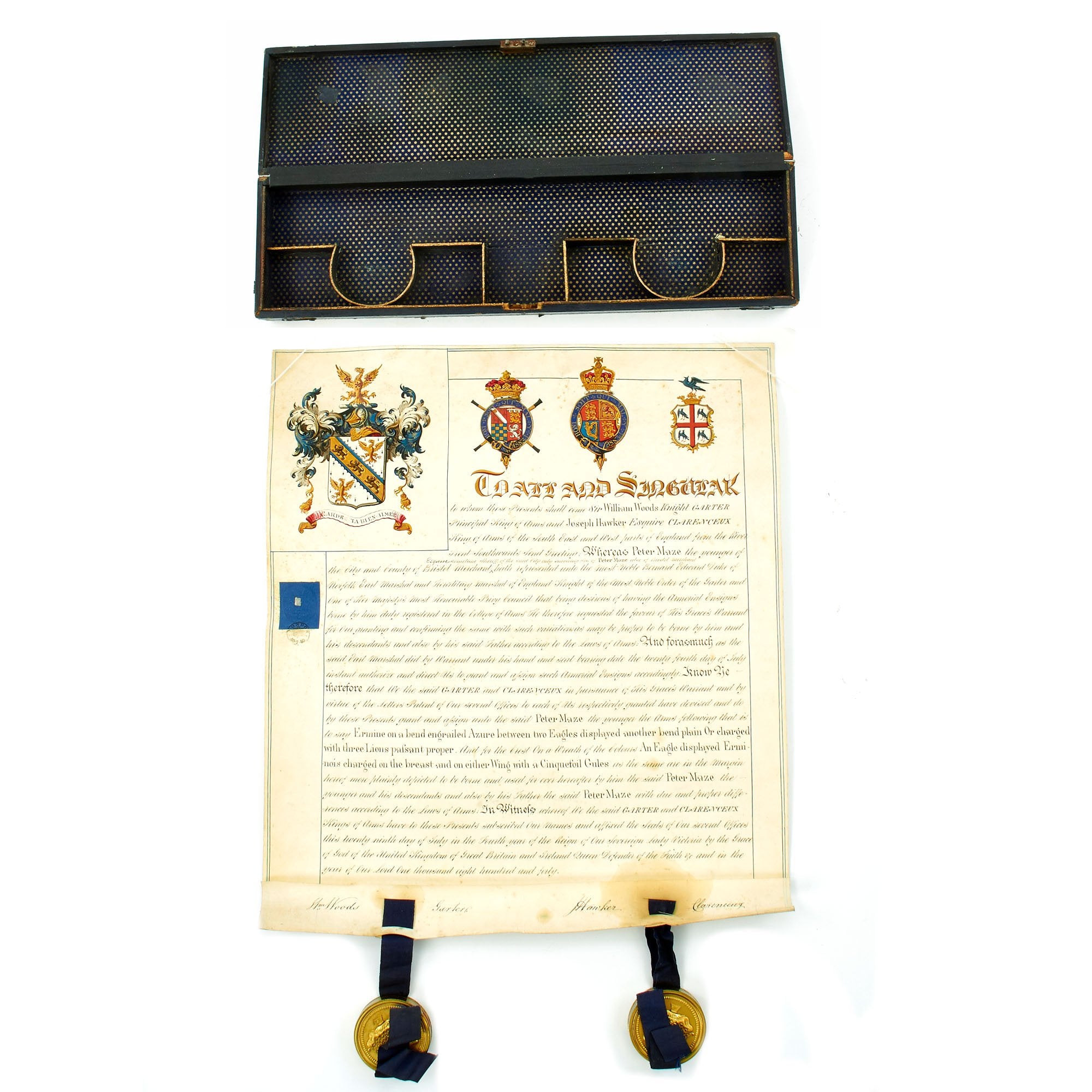 Beautifully presented, the vellum document is signed by SIR WILLIAM WOODS, Knight of the Garter and Principal King of Arms, and JOSEPH HAWKER, Clarenceux, King of Arms, under direct instructions of Queen Victoria to grant a Coat of Arms to PETER MAZE OF BRISTOL. Magnificent Scroll with Peter Maze's new Coat of Arms in Color together with three Official Royal Coats of arms complete with official blue ribbons to bottom holding two gold washed metal circular boxes themselves bearing the Crown motifs of the King of Arms.