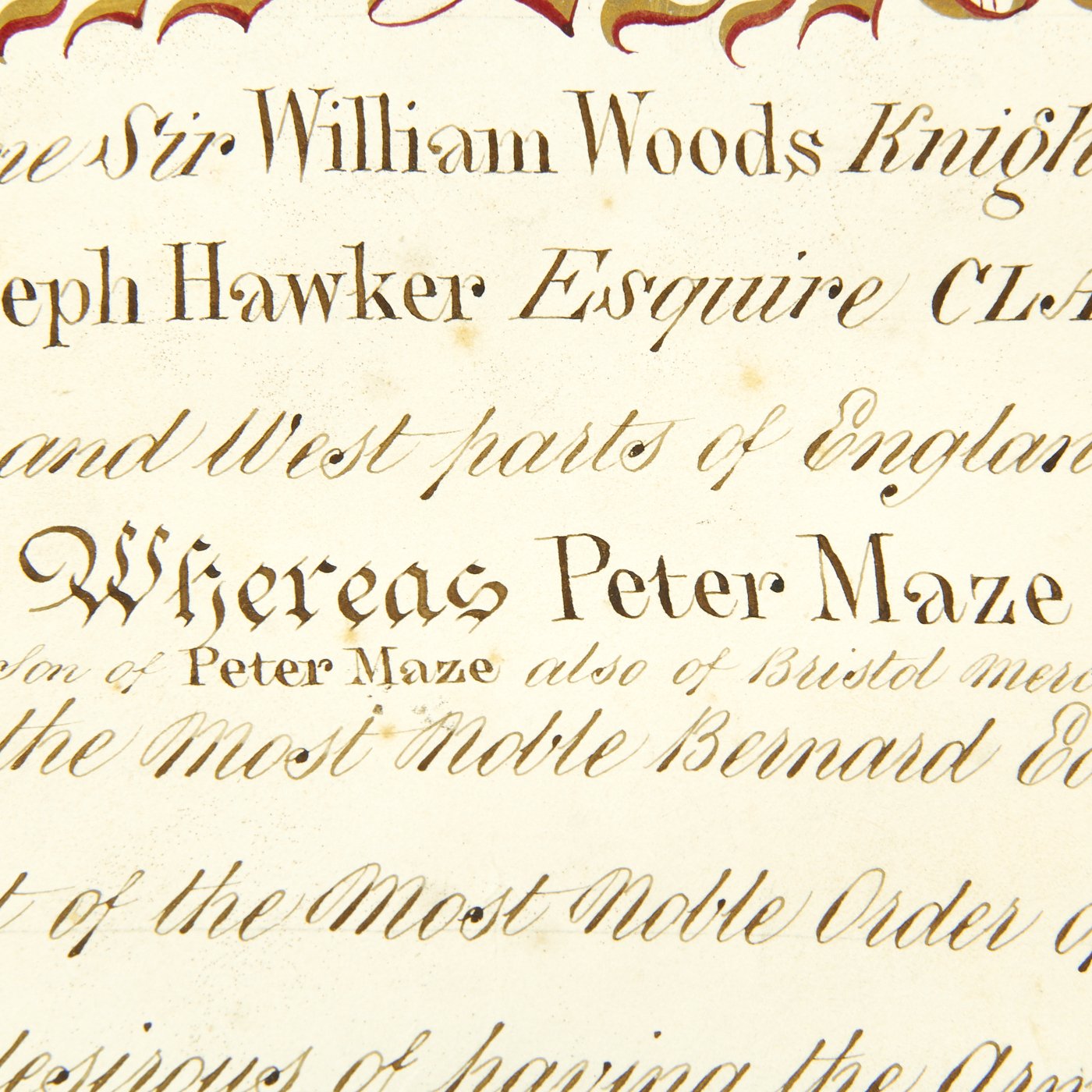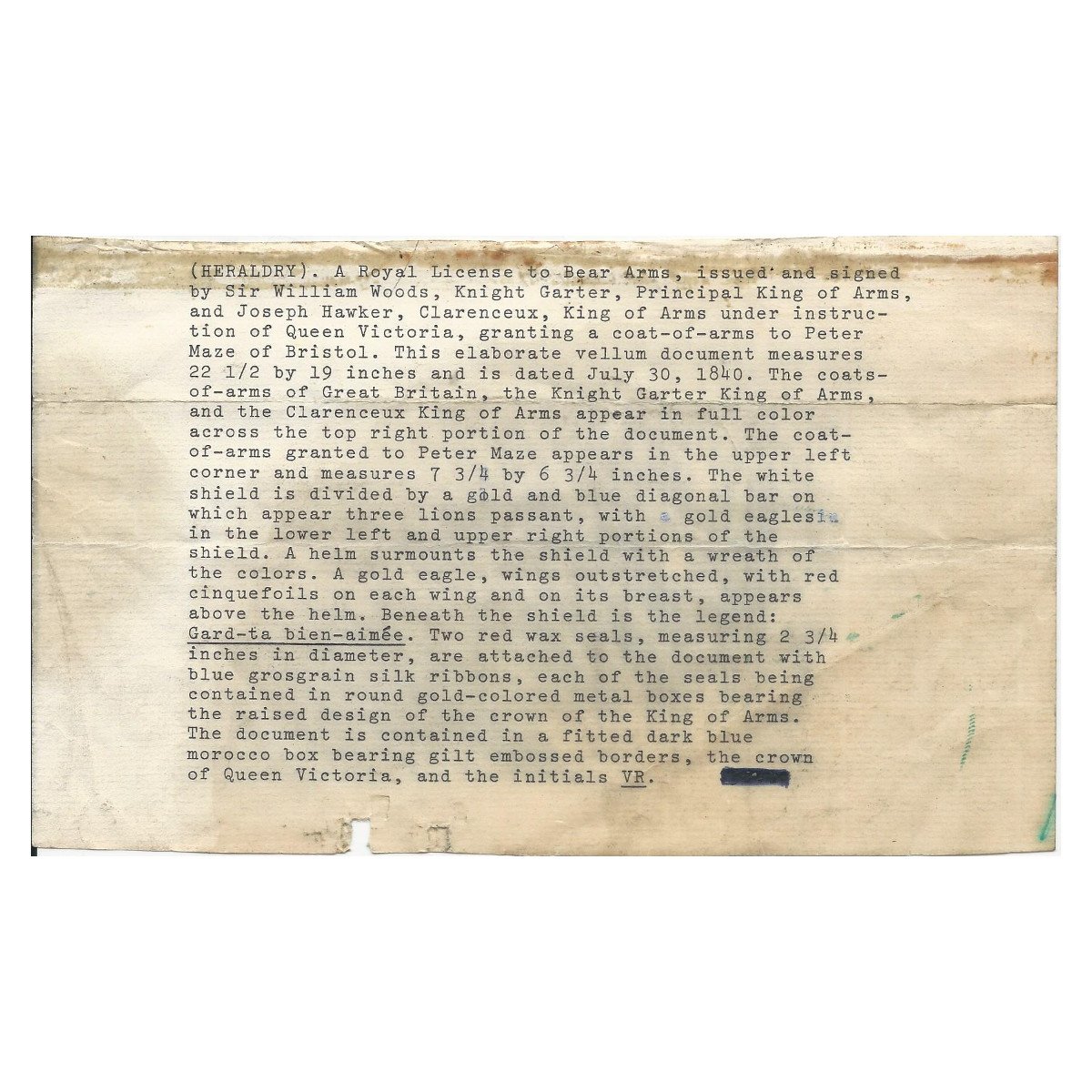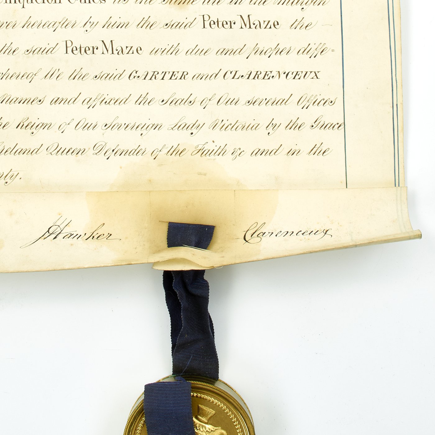 Beautifully presented, the vellum document is signed by SIR WILLIAM WOODS, Knight of the Garter and Principal King of Arms, and JOSEPH HAWKER, Clarenceux, King of Arms, under direct instructions of Queen Victoria to grant a Coat of Arms to PETER MAZE OF BRISTOL. Magnificent Scroll with Peter Maze's new Coat of Arms in Color together with three Official Royal Coats of arms complete with official blue ribbons to bottom holding two gold washed metal circular boxes themselves bearing the Crown motifs of the King of Arms.